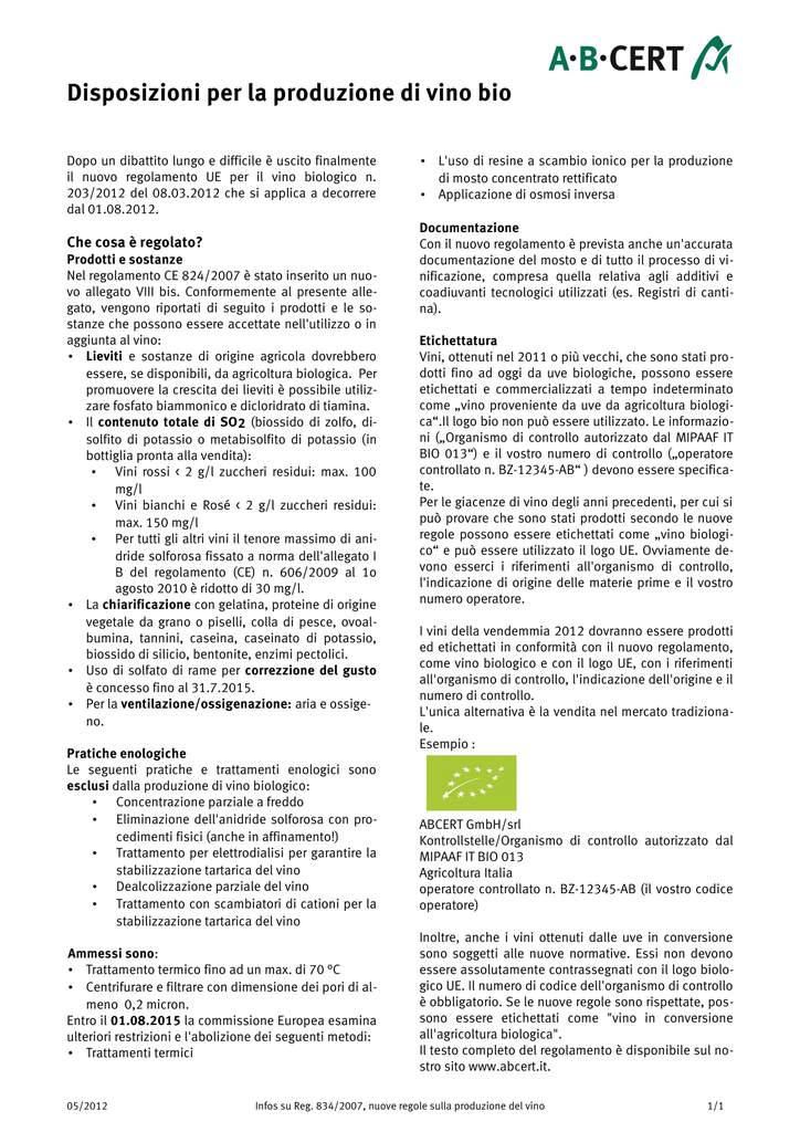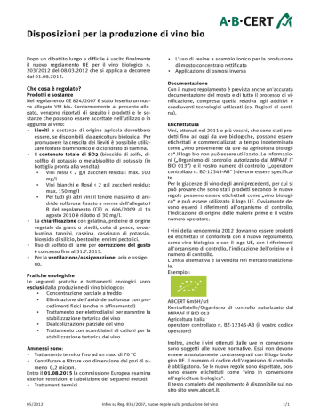 Disposizioni per la produzione di vino bio Dopo un dibattito lungo e difficile è uscito finalmente il nuovo regolamento UE per il vino biologico n. 203/2012 del 08.03.2012 che si applica a decorrere dal 01.08.2012. Che cosa è regolato? Prodotti e sostanze Nel regolamento CE 824/2007 è stato inserito un nuovo allegato VIII bis. Conformemente al presente allegato, vengono riportati di seguito i prodotti e le sostanze che possono essere accettate nell'utilizzo o in aggiunta al vino: • Lieviti e sostanze di origine agricola dovrebbero essere, se disponibili, da agricoltura biologica. Per promuovere la crescita dei lieviti è possibile utilizzare fosfato biammonico e dicloridrato di tiamina. • Il contenuto totale di SO2 (biossido di zolfo, disolfito di potassio o metabisolfito di potassio (in bottiglia pronta alla vendita): • Vini rossi < 2 g/l zuccheri residui: max. 100 mg/l • Vini bianchi e Rosé < 2 g/l zuccheri residui: max. 150 mg/l • Per tutti gli altri vini il tenore massimo di anidride solforosa fissato a norma dell'allegato I B del regolamento (CE) n. 606/2009 al 1o agosto 2010 è ridotto di 30 mg/l. • La chiarificazione con gelatina, proteine di origine vegetale da grano o piselli, colla di pesce, ovoalbumina, tannini, caseina, caseinato di potassio, biossido di silicio, bentonite, enzimi pectolici. • Uso di solfato di rame per correzzione del gusto è concesso fino al 31.7.2015. • Per la ventilazione/ossigenazione: aria e ossigeno. Pratiche enologiche Le seguenti pratiche e trattamenti enologici sono esclusi dalla produzione di vino biologico: • Concentrazione parziale a freddo • Eliminazione dell'anidride solforosa con procedimenti fisici (anche in affinamento!) • Trattamento per elettrodialisi per garantire la stabilizzazione tartarica del vino • Dealcolizzazione parziale del vino • Trattamento con scambiatori di cationi per la stabilizzazione tartarica del vino Ammessi sono: • Trattamento termico fino ad un max. di 70 °C • Centrifurare e filtrare con dimensione dei pori di almeno 0,2 micron. Entro il 01.08.2015 la commissione Europea esamina ulteriori restrizioni e l'abolizione dei seguenti metodi: • Trattamenti termici 05/2012 • L'uso di resine a scambio ionico per la produzione di mosto concentrato rettificato • Applicazione di osmosi inversa Documentazione Con il nuovo regolamento è prevista anche un'accurata documentazione del mosto e di tutto il processo di vinificazione, compresa quella relativa agli additivi e coadiuvanti tecnologici utilizzati (es. Registri di cantina). Etichettatura Vini, ottenuti nel 2011 o più vecchi, che sono stati prodotti fino ad oggi da uve biologiche, possono essere etichettati e commercializzati a tempo indeterminato come „vino proveniente da uve da agricoltura biologica“.Il logo bio non può essere utilizzato. Le informazioni („Organismo di controllo autorizzato dal MIPAAF IT BIO 013“) e il vostro numero di controllo („operatore controllato n. BZ-12345-AB“ ) devono essere specificate. Per le giacenze di vino degli anni precedenti, per cui si può provare che sono stati prodotti secondo le nuove regole possono essere etichettati come „vino biologico“ e può essere utilizzato il logo UE. Ovviamente devono esserci i riferimenti all'organismo di controllo, l'indicazione di origine delle materie prime e il vostro numero operatore. I vini della vendemmia 2012 dovranno essere prodotti ed etichettati in conformità con il nuovo regolamento, come vino biologico e con il logo UE, con i riferimenti all'organismo di controllo, l'indicazione dell'origine e il numero di controllo. L'unica alternativa è la vendita nel mercato tradizionale. Esempio : ABCERT GmbH/srl Kontrollstelle/Organismo di controllo autorizzato dal MIPAAF IT BIO 013 Agricoltura Italia operatore controllato n. BZ-12345-AB (il vostro codice operatore) Inoltre, anche i vini ottenuti dalle uve in conversione sono soggetti alle nuove normative. Essi non devono essere assolutamente contrassegnati con il logo biologico UE. Il numero di codice dell'organismo di controllo è obbligatorio. Se le nuove regole sono rispettate, possono essere etichettati come "vino in conversione all'agricoltura biologica". Il testo completo del regolamento è disponibile sul nostro sito www.abcert.it. Infos su Reg. 834/2007, nuove regole sulla produzione del vino 1/1