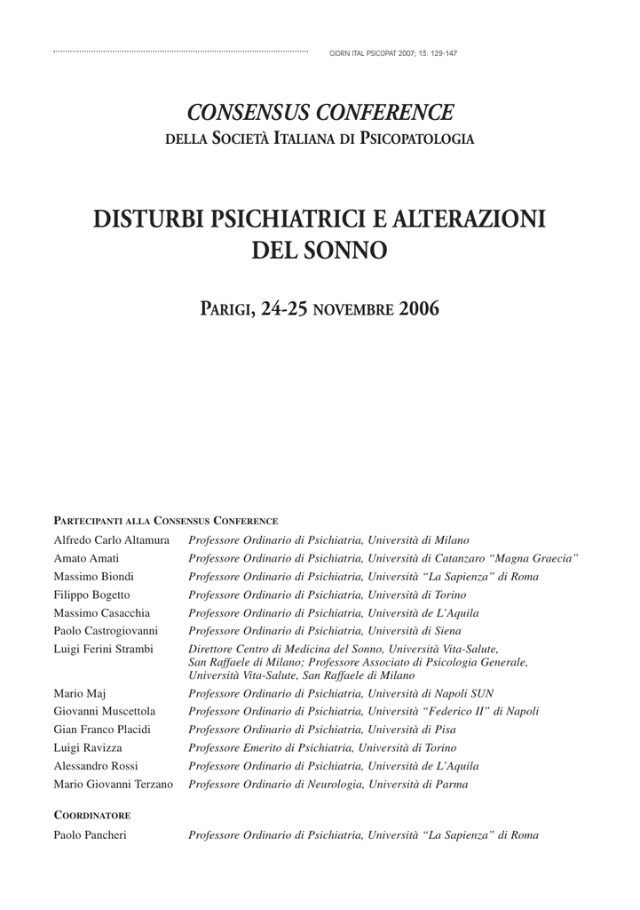 GIORN ITAL PSICOPAT 2007; 13: 129-147 CONSENSUS CONFERENCE DELLA SOCIETÀ ITALIANA DI PSICOPATOLOGIA DISTURBI PSICHIATRICI E ALTERAZIONI DEL SONNO PARIGI, 24-25 NOVEMBRE 2006 PARTECIPANTI ALLA CONSENSUS CONFERENCE Alfredo Carlo Altamura Professore Ordinario di Psichiatria, Università di Milano Amato Amati Professore Ordinario di Psichiatria, Università di Catanzaro “Magna Graecia” Massimo Biondi Professore Ordinario di Psichiatria, Università “La Sapienza” di Roma Filippo Bogetto Professore Ordinario di Psichiatria, Università di Torino Massimo Casacchia Professore Ordinario di Psichiatria, Università de L’Aquila Paolo Castrogiovanni Professore Ordinario di Psichiatria, Università di Siena Luigi Ferini Strambi Direttore Centro di Medicina del Sonno, Università Vita-Salute, San Raffaele di Milano; Professore Associato di Psicologia Generale, Università Vita-Salute, San Raffaele di Milano Mario Maj Professore Ordinario di Psichiatria, Università di Napoli SUN Giovanni Muscettola Professore Ordinario di Psichiatria, Università “Federico II” di Napoli Gian Franco Placidi Professore Ordinario di Psichiatria, Università di Pisa Luigi Ravizza Professore Emerito di Psichiatria, Università di Torino Alessandro Rossi Professore Ordinario di Psichiatria, Università de L’Aquila Mario Giovanni Terzano Professore Ordinario di Neurologia, Università di Parma COORDINATORE Paolo Pancheri Professore Ordinario di Psichiatria, Università “La Sapienza” di Roma DISTURBI PSICHIATRICI E ALTERAZIONI DEL SONNO Nella pratica psichiatrica i disturbi del sonno hanno un’incidenza molto elevata ma sono spesso mal obiettivati e sottovalutati dallo psichiatra. Le alterazioni della durata, del ritmo e della qualità del sonno hanno un importante significato diagnostico e prognostico nei confronti del disturbo psichiatrico di base a cui in genere si accompagnano e sono fonte di elevata sofferenza soggettiva per il paziente. Possono essere il sintomo prodromico più importante di un disturbo psichiatrico e spesso sono un sintomo residuo dopo la risoluzione del disturbo di base. Talvolta possono rappresentare la manifestazione apparentemente monosintomatica di alcuni disturbi psichiatrici. I disturbi psichiatrici hanno un effetto ‘patoplastico’ sugli aspetti formali e strutturali dei disturbi del sonno. Negli spettri dei disturbi d’ansia, depressivi, bipolari e schizofrenici essi si manifestano con modalità differenziate. I disturbi del sonno correlati a disturbi psichiatrici sono stati oggetto di numerosi lavori che hanno descritto la loro incidenza e tipologia e le relative alterazioni polisonnografiche. Gli studi osservazionali pubblicati risentono tuttavia delle diverse modalità di selezione dei pazienti, dei differenti strumenti di valutazione, della presenza o meno di gruppi di controllo. Il controllo e la gestione delle alterazioni del sonno in psichiatria sono di rilevante importanza per ridurre la sofferenza dei pazienti, migliorare la loro qualità di vita, influire sul decorso del disturbo psichiatrico e prevenire le ricadute. Nella pratica clinica la molteplicità delle variabili interessate rende particolarmente complessa sia la valutazione che la gestione dei disturbi del sonno correlati a disturbi psichiatrici. Variabilità e gravità del quadro psicopatologico, condizioni di co-morbidità psichiatrica e somatica, trattamenti specifici pregressi o in atto per il disturbo di base richiedono al clinico una valutazione e un intervento sul sonno a vari livelli. 131 Le alterazioni del sonno di interesse psichiatrico possono essere inquadrate come entità nosografico-diagnostiche indipendenti (Disturbi Primari) o come sintomi di un disturbo medico o psichiatrico di base (Disturbi Secondari). Nella pratica clinica questa seconda evenienza va considerata come la più frequente. In queste linee guida verranno considerati gli aspetti diagnostici e farmaco-terapeutici delle alterazioni del sonno che si osservano nelle quattro aree principali della patologia psichiatrica, dove esse sono di comune osservazione nella pratica clinica: 1. Disturbi depressivi 2. Disturbi d’ansia 3. Schizofrenia 4. Disturbo bipolare Classificazione dei disturbi del sonno per la clinica psichiatrica Esistono diverse classificazioni dei disturbi del sonno. Alcune sono state messe a punto dalle Società per i disturbi del sonno (Association of Sleep Disorders Centers, 1979; American Sleep Disorders Association, 1997), altre fanno parte dei due sistemi nosografici dei disturbi mentali attualmente più diffusi (ICD-10, DSM-IV-TR). Non esistono differenze sostanziali tra i vari sistemi classificatori, soprattutto per quanto riguarda la distinzione tra disturbi del sonno primari e secondari. Tuttavia l’International Classification of Sleep Disorders (ICSD, 2005) è la più utilizzata nei Centri di Medicina del sonno, mentre la classificazione DSM-IV-TR è il sistema di riferimento più diffuso in psichiatria. Nell’ambito di una messa a punto dei disturbi del sonno in psichiatria faremo riferimento a quest’ultima in quanto integrata in un sistema classificatorio generale dei disturbi psichiatrici. Il DSM-IV-TR inserisce i disturbi del sonno in una categoria indipendente in Asse I, sud- CONSENSUS CONFERENCE Tab. I. Classificazione dei Disturbi del sonno secondo il DSM-IV-TR. Disturbi primari del sonno DISSONNIE Insonnia Primaria [307.42] Ipersonnia Primaria [307.44] Narcolessia [347] Disturbo del Sonno Correlato alla Respirazione [780.59] Disturbo del Ritmo Circadiano del Sonno [307.45] Dissonnia non Altrimenti Specificata [307.47] Parasonnie Disturbo da Incubi (precedentemente Disturbo d’Ansia Collegato ai Sogni) [307.47] Disturbo da Terrore nel Sonno [307.46] Disturbo da Sonnambulismo [307.46] Parasonnia non Altrimenti Specificata [307.47] Disturbi del sonno correlati ad un altro disturbo mentale Insonnia Correlata ad un Altro Disturbo Mentale [307.42] Ipersonnia Correlata ad un Altro Disturbo Me