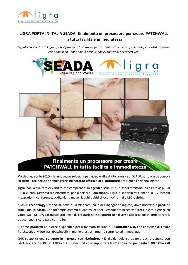 LIGRA PORTA IN ITALIA SEADA: finalmente un processore per creare PATCHWALL in tutta facilità e immediatezza Siglato l'accordo tra Ligra, global provider di soluzioni per la comunicazione professionale, e SEADA, azienda con sede in UK leader nella produzione di soluzioni per video wall Vigolzone, aprile 2015 – le innovative soluzioni per video wall e digital signage di SEADA sono ora disponibili su tutto il territorio nazionale grazie all’accordo ufficiale di distribuzione tra Ligra e l’azienda inglese. Ligra, con la sua rete di vendita che comprende 14 agenti distribuiti su tutto il territorio, ha all'attivo più di 1600 clienti. Distributore affermato per il settore Educational, Ligra è specializzata anche in AV System integration - conference, auditorium, musei, luoghi pubblici, ecc - AV rental e LED Lighting. SEADA Technology Limited ha sede a Birmingham, culla dell’ingegneria inglese, dove brevetta e produce tutti i suoi prodotti. Con un’ampia gamma di controller specificatamente progettati per il digital signage su video wall, SEADA garantisce alti livelli di prestazione e supporto per diverse applicazioni in ambito retail, educational, sicurezza e controllo. Il primo prodotto ad essere disponibile per il mercato italiano è il Controller G4K che consente di creare Patchwork di video wall (Patchwall) in maniera estremamente semplice ed immediata. G4K supporta una sorgente in ingresso con risoluzione 4K, dividendola su quattro uscite ognuna con risoluzione fino a 1920 × 1200 a 60Hz. Ogni uscita può supportare la rotazione indipendente di 90, 180 e 270 gradi ed è in grado di ritagliare arbitrariamente (CROP) l’input originale. La risoluzione e frame rate di ogni parte ritagliata potrà essere scalata e ridimensionata indipendentemente per ogni uscita. I G4K controller possono essere facilmente configurati tramite un software di gestione su piattaforma Windows. Il software di gestione fornisce un’ interfaccia grafica user friendly, semplificando notevolmente la configurazione del sistema. Una volta configurato, il G4K controller manterrà le impostazioni anche senza il collegamento con il PC di gestione. In mancanza di corrente elettrica, i settaggi non andranno persi e, al ripristino dell’alimentazione, il G4K si riavvierà con l’ultima impostazione salvata. Il controller G4K supporta tutte le device più diffuse tra cui LCD, DLP e display a LED, insieme a proiettori per applicazioni edge blending. Caratteristiche principali: Design fanless (senza ventole) Ogni controller dispone di 2 ingressi 4K e 4 uscite ll processore supporta l’espansione infinita della catena in daisy chain permettendo video wall giganti, senza la necessità di un amplificatore di distribuzione separato Ingressi in Dual-Link DVI, HDMI o DisplayPort Ogni uscita supporta DVI e RGB con risoluzioni fino a 1080p Full HD e 1920 x 1200 (WUXGA) Supporta la rotazione di 90, 180 e 270 gradi su ogni singola uscita, per consentire video wall creativi con monitor in modaliità landscape e portrait Immagine in uscita supporta l’overlapping per proiezioni in Edge Blending Compensazione dei bordi (Bezel Compensation) per tutti i tipi di display al fine di ottenere una visualizzazione accurata dell’immagine Controllabile tramite collegamento IP, consente la configurazione remota. UP e DOWN scaling arbitrario Supporta la funzione di cropping arbitraria del contenuto in ingresso e di up o downscale della parte ritagliata in modo indipendente per ogni uscita. Input EDID programmabile fornisce risoluzioni e frame rate personalizzate L’uscita frame lock assicura un’immagine senza soluzione di continuità tra i vari monitor L’interfaccia grafica “user friendly”, fornisce una configurazione semplice, facile ed immediata. ***** Per informazioni e domande Ligra [email protected]