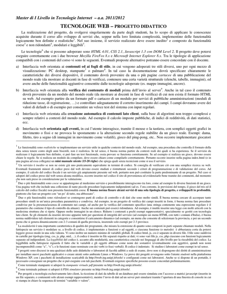 Master di I Livello in Tecnologie Internet – a.a. 2011/2012 TECNOLOGIE WEB – PROGETTO DIDATTICO La realizzazione del progetto, da svolgersi singolarmente da parte degli studenti, ha lo scopo di applicare le conoscenze acquisite durante il corso allo sviluppo di servizi che, seppur nella loro limitata complessità, implementino delle funzionalità logicamente ben definite e realistiche1. Nel suo insieme, il servizio realizzato deve essere inedito2 e composto da funzionalità coese3 e non ridondanti4, modulari e leggibili5. Le tecnologie6 che si possono adoperare sono HTML 4.01, CSS 2.1, Javascript 1.3 con DOM Level 2. Il progetto deve potersi eseguire correttamente con i due browser Mozilla FireFox 8.x e Microsoft Internet Explorer 8.x. Tra le tipologie di applicazione compatibili con i contenuti del corso vi sono le seguenti. Eventuali proposte alternative potranno essere concordate con il docente. a) Interfaccia web orientata ai contenuti ed ai fogli di stile, in cui vengono adoperati tre stili diversi, uno per ogni mezzo di visualizzazione: PC desktop, stampante7 o palmare8. In tal caso la documentazione dovrà specificare chiaramente le caratteristiche dei diversi dispositivi, il contenuto dovrà provenire da una o più pagine cartacee di una pubblicazione del mondo reale (da mostrare ai docenti in fase di verifica), contenere una certa varietà strutturale (elenchi, tabelle, immagini), ed avere anche delle funzionalità aggiuntive consentite dalle tecnologie adoperate (es. mappe immagini, ancore). b) Interfaccia web orientata alla verifica dei contenuto di moduli prima dell’invio al server9. Anche in tal caso il contenuto dovrà provenire da un modulo del mondo reale (da mostrare ai docenti in fase di verifica) di cui non esista il formato HTML su web. Ad esempio partire da un formato pdf o cartaceo di un modulo per servizi di pubbliche amministrazioni (moduli di riduzione tasse, di registrazione, …) e controllare adeguatamente il corretto inserimento dei campi. I campi dovranno avere dei valori di default o di esempio per consentire un veloce test del sistema con input regolari. c) Interfaccia web orientata alla creazione automatica di contenuti lato client, sulla base di algoritmi non troppo complessi e sempre relativi a contesti del mondo reale. Ad esempio il calcolo imposte pubbliche, di indici di redditività, di dati statistici, ecc. d) Interfaccia web orientata agli eventi, in cui l’utente interagisce, tramite il mouse o la tastiera, con semplici oggetti grafici in movimento o fissi e ne provoca lo spostamento o la alterazione secondo regole stabilite da un gioco reale. Esempi: dama, filetto, tiro a segno (di immagini in movimento come volatili), gioco del ping-pong, etc.. Non occorre implementare giocatori 1 Le funzionalità sono realistiche se implementano un servizio utile in qualche contesto del mondo reale. Ad esempio, una procedura che controlla il formato della data senza tenere conto degli anni bisestili, non è realistica. In tal senso, è buona norma partire da contesti reali dei quali si ha esperienza. Se il servizio da realizzare è logicamente ben definito, si può fare un test funzionale, ossia provare se funziona correttamente. Se ad esempio si realizza un gioco, devono essere chiare le regole. Se si realizza un modulo da compilare, deve essere chiaro come compilarlo correttamente. Pertanto occorre inserire nella pagina index.html (o in una pagina ad essa collegata) un mini manuale utente (15-20 righe) che spiega quali senza tecnicismi come si usa il servizio. 2 Un servizio è inedito se non ne esiste già uno praticamente equivalente in termini di codice. Si consiglia di verificare ciò con una semplice ricerca su web. Eventuali frammenti minori di codice presi dal web devono essere studiati e ristrutturati secondo i criteri di programmazione e di validazione del corso. Ad esempio, il calcolo del codice fiscale è un servizio già ampiamente presente sul web, pertanto non può costituire la parte predominante di un progetto. Nel caso si adoperi del codice preso dal web senza alcuna modifica, occorre inserire nel codice il sito di provenienza ed evidenziarlo bene tramite dei commenti, dal momento che non sarà preso in considerazione per la valutazione. 3 Due o più funzionalità sono coese se appartengono al medesimo servizio e possibilmente interagiscono tra loro, come ad esempio le diverse funzioni di un gioco. Una pagina web che include una collezione di tante piccole procedure logicamente indipendenti (ad es. l’ora corrente, le previsioni del tempo, il gioco del tris ed il calcolo del codice fiscale) non presenta funzionalità coese. É buona norma fissare alcuni servizi di una sola tipologia di progetto, e svilupparli in profondità, piuttosto che fare un progetto con “un po’ di tutto, ma abbozzato”. 4 Due o più funzionalità sono ridondanti se contengono parti di codice di controllo o di dati che sono molto simili. È buona norma cercare di accorpare tante procedure simili in un’unica procedura parametrica e condivisa. Ad esempio, in un progetto di verifica dei campi inseriti in form, è buona norma fare procedure condivise per la presenza/assenza di contenuto nei campi, ed anche per la verifica del contenuto specifico (una stringa contenente una espressione regolare è il parametro che contiene il tipo di controllo da attuare). Anche sui contenuti può esserci ridondanza. Ad esempio, è inutile inserire una legge con molti articoli con la medesima struttura che si ripete. Oppure molte immagini in un elenco. Ridurre i contenuti a pochi esempi rappresentativi, specialmente se gestiti con tecnologia lato client. Se gli elementi da inserire devono apparire tutti per questioni di integrità del servizio (ad esempio un menu HTML con tutti i comuni d'Italia), è buona norma suddividere tali elementi in categorie e consentirne il caricamento dinamico (ad esempio, un menu che consente di selezionare la provincia, e poi un secondo menu che si 