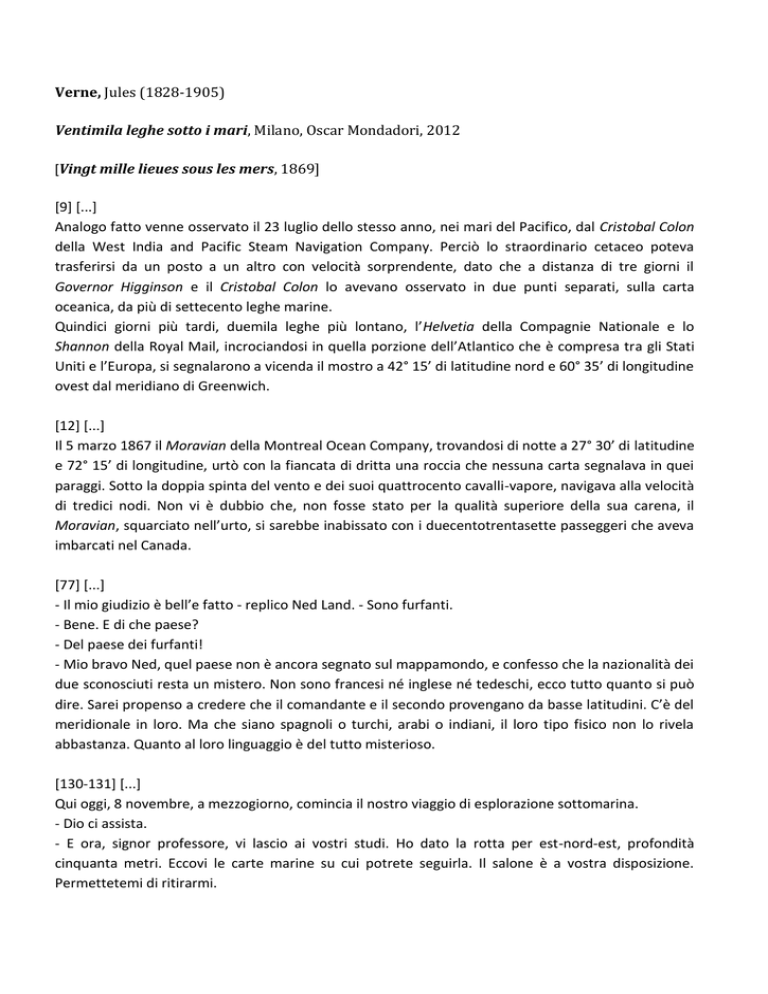 Verne, Jules (1828-1905) Ventimila leghe sotto i mari, Milano, Oscar Mondadori, 2012 [Vingt mille lieues sous les mers, 1869] [9] [...] Analogo fatto venne osservato il 23 luglio dello stesso anno, nei mari del Pacifico, dal Cristobal Colon della West India and Pacific Steam Navigation Company. Perciò lo straordinario cetaceo poteva trasferirsi da un posto a un altro con velocità sorprendente, dato che a distanza di tre giorni il Governor Higginson e il Cristobal Colon lo avevano osservato in due punti separati, sulla carta oceanica, da più di settecento leghe marine. Quindici giorni più tardi, duemila leghe più lontano, l’Helvetia della Compagnie Nationale e lo Shannon della Royal Mail, incrociandosi in quella porzione dell’Atlantico che è compresa tra gli Stati Uniti e l’Europa, si segnalarono a vicenda il mostro a 42° 15’ di latitudine nord e 60° 35’ di longitudine ovest dal meridiano di Greenwich. [12] [...] Il 5 marzo 1867 il Moravian della Montreal Ocean Company, trovandosi di notte a 27° 30’ di latitudine e 72° 15’ di longitudine, urtò con la fiancata di dritta una roccia che nessuna carta segnalava in quei paraggi. Sotto la doppia spinta del vento e dei suoi quattrocento cavalli-vapore, navigava alla velocità di tredici nodi. Non vi è dubbio che, non fosse stato per la qualità superiore della sua carena, il Moravian, squarciato nell’urto, si sarebbe inabissato con i duecentotrentasette passeggeri che aveva imbarcati nel Canada. [77] [...] - Il mio giudizio è bell’e fatto - replico Ned Land. - Sono furfanti. - Bene. E di che paese? - Del paese dei furfanti! - Mio bravo Ned, quel paese non è ancora segnato sul mappamondo, e confesso che la nazionalità dei due sconosciuti resta un mistero. Non sono francesi né inglese né tedeschi, ecco tutto quanto si può dire. Sarei propenso a credere che il comandante e il secondo provengano da basse latitudini. C’è del meridionale in loro. Ma che siano spagnoli o turchi, arabi o indiani, il loro tipo fisico non lo rivela abbastanza. Quanto al loro linguaggio è del tutto misterioso. [130-131] [...] Qui oggi, 8 novembre, a mezzogiorno, comincia il nostro viaggio di esplorazione sottomarina. - Dio ci assista. - E ora, signor professore, vi lascio ai vostri studi. Ho dato la rotta per est-nord-est, profondità cinquanta metri. Eccovi le carte marine su cui potrete seguirla. Il salone è a vostra disposizione. Permettetemi di ritirarmi. Il capitano Nemo mi salutò. Rimasi solo, assorto nei miei pensieri, tutti concentrati sul comandante del Nautilus. Avrei mai saputo a quale paese apparteneva lo strano uomo che si vantava di non avere nazione? L’odio che aveva giurato all’umanità, quell’odio che cercava forse vendette terribili, da chi era stato provocato? Il capitano Nemo era forse uno di quegli scienziati incompresi, di quei geni «ai quali si è fatto dispiacere» - secondo l’espressione di Conseil - un Galileo moderno, oppure uno di quegli uomini di scienza come l’americano Maury, la cui carriera era stata sconvolta da rivoluzioni politiche? Non potevo ancora saperlo. Ero stato gettato dalla sorte a bordo della sua nave e mi trovavo in suo potere, ma dovevo riconoscere in lui un ospite cortese. Però non aveva mai stretto la mia mano tesa. Non mi aveva mai offerto la sua. Per un’ora intera restai sprofondato in queste riflessioni, cercando di penetrare quel mistero tanto interessante. Poi fissai gli occhi sul vasto planisfero steso sulla tavola, e misi il dito là dove si incrociavano la latitudine e la longitudine rilevate. Il mare ha i suoi fiumi, come i continenti. Sono correnti particolari, riconoscibili dalla temperatura e dal colore; la più importante è nota con il nome di Gulf Stream, o Corrente del Golfo. La scienza ha determinato sul globo la direzione di cinque correnti principali: una nell’Atlantico settentrionale, la seconda nell’Atlantico meridionale, una terza nel Pacifico settentrionale, una quarta nel Pacifico meridionale e una quinta nell’Oceano Indiano meridionale. E’ probabile che una volta ne esistesse anche una sesta, nell’Oceano Indiano settentrionale, quando il Mar Caspio e il lago Aral, riuniti ai grandi laghi dell’Asia, formavano una sola distesa d’acqua. Ora, nel punto indicato sul planisfero passava una di queste correnti: il Kuro-Scivo dei Giapponesi, il Fiume Nero che, uscendo dal Golfo del Bengala dove lo scaldano i raggi perpendicolari del sole dei tropici, attraversa lo Stretto di Malacca, si spinge oltre la costa asiatica, si incurva nel Pacifico settentrionale fino alle isole Aleutine, trascinando con sé anche tronchi d’albero della canfora, e facendo risaltare tra i flutti il puro indaco delle sue acque. Era questa corrente che il Nautilus avrebbe percorso. La seguivo con lo sguardo, la vedevo perdersi nell’immensità del Pacifico e mi sentivo come rapito, quando Ned Land e Conseil apparvero sulla soglia del salone. [145] [...] (...) : - Vediamo intanto cos’è l’isola di Crespo. La cercai sul planisfero. A 32° 40’ di latitudine nord e 167° 50’ di longitudine ovest trovai un isolotto che era stato scoperto dal capitano Crespo e che le antiche carte spagnole chiamavano Roca de la Plata, ossia Rocca d’argento. Eravamo quindi a circa milleduecento miglia dal nostro punto di partenza, e la direzione un po’ modificata del Nautilus portava a sud-est. Mostrai ai miei compagni la piccola isola sperduta nel Pacifico settentrionale. [172-173] [...] Nei giorni e nelle settimane seguenti il capitano mi cercò pochissimo. Lo vidi raramente. Il suo secondo regolarmente faceva il punto, che io trovavo ogni volta sulla carta; così potevo rilevare con esattezza la rotta del Nautilus. [182] [...] Stavo ricostruendo sul planisfero la rotta del Nautilus. Il capitano si avvicinò, mise un dito su un punto della carta pronunciando una sola parola: - Vanikoro. Sugli isolotti di Vanikoro erano andati a perdersi i vascelli di La Pérouse. Mi alzai d