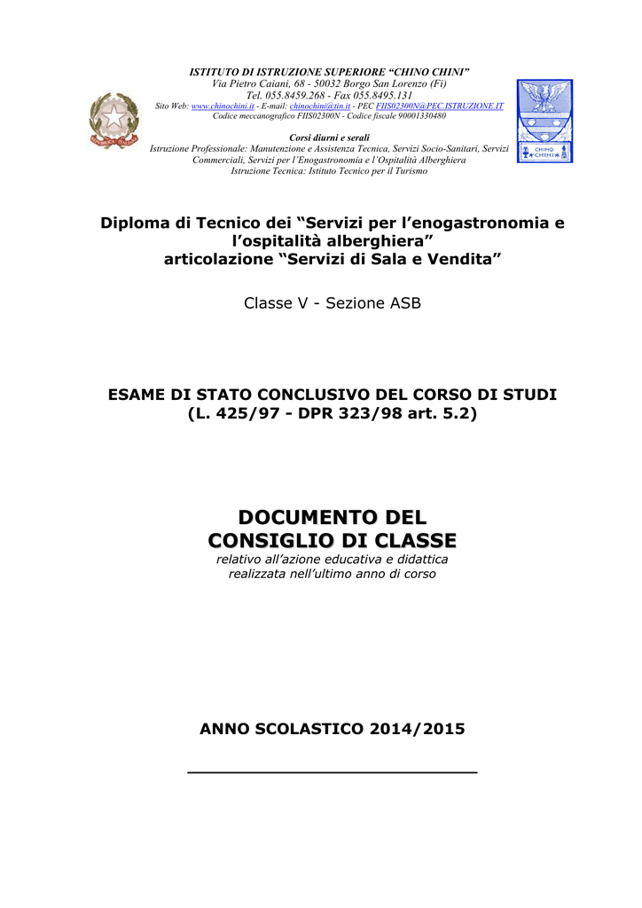 ISTITUTO DI ISTRUZIONE SUPERIORE “CHINO CHINI” Via Pietro Caiani, 68 - 50032 Borgo San Lorenzo (Fi) Tel. 055.8459.268 - Fax 055.8495.131 Sito Web: www.chinochini.it - E-mail: [email protected] - PEC [email protected] Codice meccanografico FIIS02300N - Codice fiscale 90001330480 Corsi diurni e serali Istruzione Professionale: Manutenzione e Assistenza Tecnica, Servizi Socio-Sanitari, Servizi Commerciali, Servizi per l’Enogastronomia e l’Ospitalità Alberghiera Istruzione Tecnica: Istituto Tecnico per il Turismo Diploma di Tecnico dei “Servizi per l’enogastronomia e l’ospitalità alberghiera” articolazione “Servizi di Sala e Vendita” Classe V - Sezione ASB ESAME DI STATO CONCLUSIVO DEL CORSO DI STUDI (L. 425/97 - DPR 323/98 art. 5.2) DOCUMENTO DEL CONSIGLIO DI CLASSE relativo all’azione educativa e didattica realizzata nell’ultimo anno di corso ANNO SCOLASTICO 2014/2015 ___________________________ Estratto dall’ O.M. n. 00 del 00/00/0000 ART. 6 DOCUMENTO DEL CONSIGLIO DI CLASSE 1. I consigli di classe dell'ultimo anno di corso elaborano, entro il 15 maggio, per la commissione d'esame, un apposito documento relativo all'azione educativa e didattica realizzata nell’ultimo anno di corso. 2 . Tale documento indica i contenuti, i metodi, i mezzi, gli spazi e i tempi del pe r corso formativo, i criteri, gli strumenti di valutazione adottati, gli obiettivi raggiunti, nonché ogni altro elemento che i consigli di classe ritengano significativo ai fini dello svolgimento degli esami. 3. Per quanto concerne gli istituti professionali, considerato per il corrente anno scolastico 2013-2014 quanto previsto dall’art. 8, comma 3, del D.P.R. 15 marzo 2010 n. 87, il documento deve recare specifiche indicazioni sul profilo e sulle competenze acquisite dagli allievi con riferimento alle esperienze, condotte sia nella classe IV che nella classe V, in alternanza scuola - lavoro. Le commissioni d’esame terranno conto di tali attività ed esperienze, ai fini dell'accertamento di conoscenze, competenze e capacità, in particolare per la configurazione della terza prova e nella conduzione del colloquio. (omissis) 4. Per le classi articolate e per i corsi destinati ad alunni provenienti da più classi, il documento di cui ai commi 1 e 2 è integrato con le relazioni dei docenti dei gruppi in cui eventualmente si è scomposta la classe o dei docenti che hanno guidato corsi destinati ad alunni provenienti da più classi. 5. Al documento stesso possono essere allegati eventuali atti relativi alle prove effettuate e alle iniziative realizzate durante l'anno in preparazione dell'esame di Stato, nonché alla partecipazione attiva e responsabile degli alunni ai sensi del Regolamento recante le norme dello Statuto delle studentesse e degli studenti emanato con D.P.R. n. 249 del 24/6/98, modificato dal D.P.R . 21 - 11 - 2007, n. 235. 6. Prima della elaborazione del testo definitivo del documento, i consigli di classe possono consultare, per eventuali proposte e osservazioni, la componente studentesca e quella dei genitori. 7. Il documento è immediatamente affisso all'albo dell'istituto e consegnato in copia a ciascun candidato. Chiunque ne abbia interesse può estrarne copia. 2 Indice del documento CAPITOLI 1. Descrizione del profilo professionale 2. Descrizione dell’Istituto, delle strutture e dei laboratori 3. Storia della classe 4. Percorso formativo 5. Programmazione disciplinare Obiettivi generali Argomento modulo Contenuti Obiettivi specifici Tempi Metodi Testi adottati Strumenti Verifiche e valutazione 6. Attività integrative 7. Profili di specializzazione 8. Valutazione 9. Prove pluridisciplinari 10. Firme 11. Allegati CONTENUTI Quadro delle materie di insegnamento Descrizione dl profilo professionale Descrizione dell’Istituto Strutture e laboratori e tipo di utilizzazione Storia della classe (composizione, provenienza, promozioni, sospensioni del giudizio...) Considerazioni del Consiglio sul profilo della classe (breve relazione) Composizione del Consiglio di Classe Obiettivi didattico – educativi trasversali Moduli pluridisciplinari Metodi e strategie didattiche Mezzi e strumenti Tipologia delle verifiche e strumenti di verifica Strategie per il recupero e modalità di recupero Scheda di sintesi delle tipologie di prove disciplinari assegnate nel corso dei due anni ITALIANO STORIA MATEMATICA SCIENZA E CULTURA DELL’ALIMENTAZIONE LINGUA STRANIERA - INGLESE LINGUA STRANIERA - FRANCESE DIRITTO E TEC. AMM. PER LE STRUTT. RICET. LAB. SERV. ENOGASTR. – SETT. SALA&VENDITA LAB. SERV. ENOGASTR. – SETT. CUCINA RELIGIONE SCIENZE MOTORIE E SPORTIVE Viaggi di istruzione – visite guidate – partecipazione a convegni e manifestazioni culturali – eventi culturali e spettacoli – concorsi Alternanza scuola-lavoro, stage, tirocini Criteri generali per la valutazione Indicatori per la valutazione delle prove orali e scritte, disciplinari e pluridisciplinari Criteri per l’attribuzione del credito scolastico Criteri per il riconoscimento dei crediti formativi Considerazioni sulla terza prova scritta Componenti del Consiglio di classe Griglie di valutazione e prove pluridisciplinari svolte durante l’anno scolastico 3 PAG 4 6 8 12 16 20 22 25 32 34 37 40 44 48 50 52 53 54 60 61 63 QUADRO ORARIO DELLE MATERIE DI INSEGNAMENTO Materie di insegnamento Italiano Storia Matematica Inglese Educazione fisica Religione Tot. Ore Economia aziende ristorative Seconda Lingua straniera Alimenti e alimentazione Lab. Serv. Ristor – settore cucina Lab. Serv. Ristor – settore sala Tot. Ore Area di professionalizzazione Classe IV Area comune 4 2 3 3 2 1 15 Area di indirizzo 5 3 2 (+1 di compresenza con La. Sala 2 4 (+1 compresenza con Alimenti) 17 Classe V Valutazione 4 2 3 3 2 1 15 s. o. O O s. o. p. o. 5 3 3 O s.o. s. o. 2 4 p. p. 17 Si è svolta sotto forma di stage nella classe IV dal 3 giugno 2014 al 28 giugno 2014 per un numero complessivo di minimo 132 ore; PROFILO PROFESSIONALE: Enogastronom