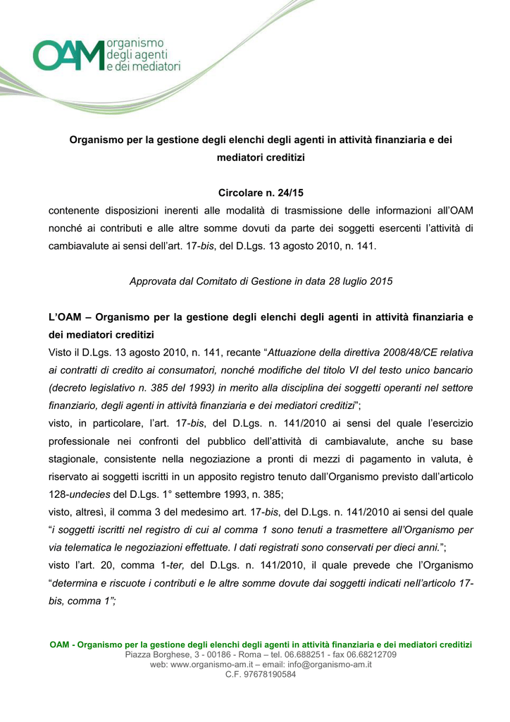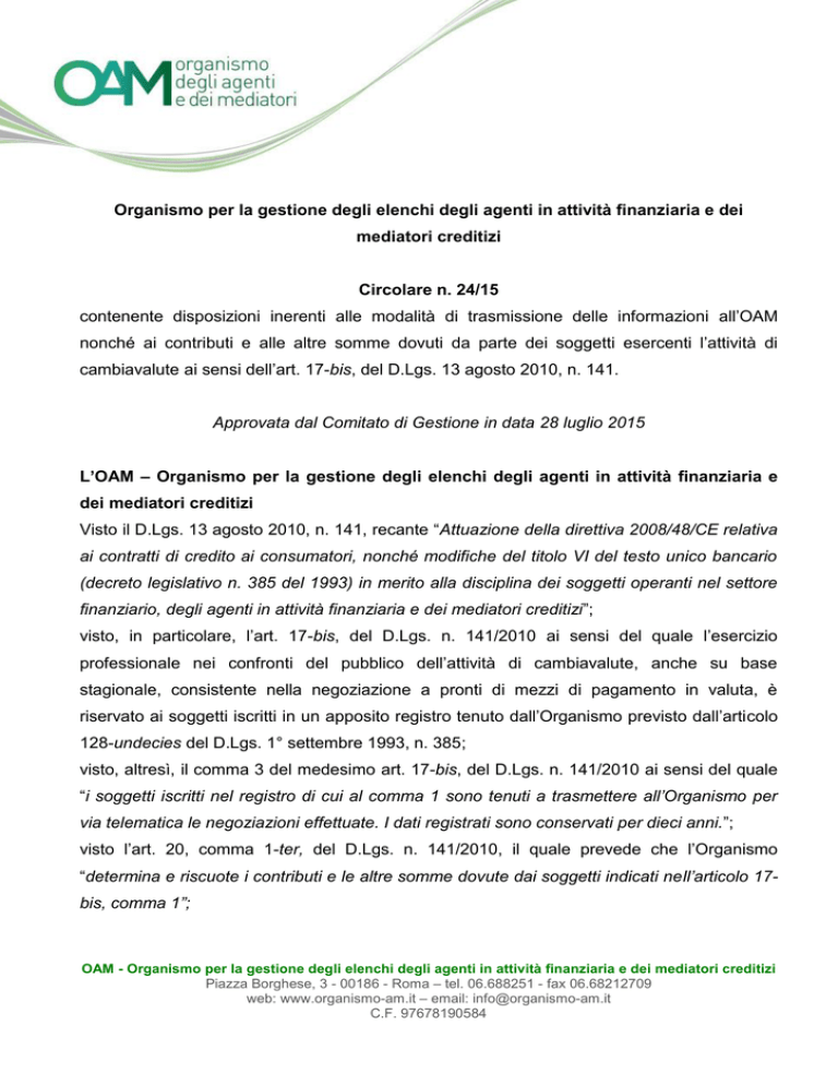 Organismo per la gestione degli elenchi degli agenti in attività finanziaria e dei mediatori creditizi Circolare n. 24/15 contenente disposizioni inerenti alle modalità di trasmissione delle informazioni all’OAM nonché ai contributi e alle altre somme dovuti da parte dei soggetti esercenti l’attività di cambiavalute ai sensi dell’art. 17-bis, del D.Lgs. 13 agosto 2010, n. 141. Approvata dal Comitato di Gestione in data 28 luglio 2015 L’OAM – Organismo per la gestione degli elenchi degli agenti in attività finanziaria e dei mediatori creditizi Visto il D.Lgs. 13 agosto 2010, n. 141, recante “Attuazione della direttiva 2008/48/CE relativa ai contratti di credito ai consumatori, nonché modifiche del titolo VI del testo unico bancario (decreto legislativo n. 385 del 1993) in merito alla disciplina dei soggetti operanti nel settore finanziario, degli agenti in attività finanziaria e dei mediatori creditizi”; visto, in particolare, l’art. 17-bis, del D.Lgs. n. 141/2010 ai sensi del quale l’esercizio professionale nei confronti del pubblico dell’attività di cambiavalute, anche su base stagionale, consistente nella negoziazione a pronti di mezzi di pagamento in valuta, è riservato ai soggetti iscritti in un apposito registro tenuto dall’Organismo previsto dall’articolo 128-undecies del D.Lgs. 1° settembre 1993, n. 385; visto, altresì, il comma 3 del medesimo art. 17-bis, del D.Lgs. n. 141/2010 ai sensi del quale “i soggetti iscritti nel registro di cui al comma 1 sono tenuti a trasmettere all’Organismo per via telematica le negoziazioni effettuate. I dati registrati sono conservati per dieci anni.”; visto l’art. 20, comma 1-ter, del D.Lgs. n. 141/2010, il quale prevede che l’Organismo “determina e riscuote i contributi e le altre somme dovute dai soggetti indicati nell’articolo 17bis, comma 1”; OAM - Organismo per la gestione degli elenchi degli agenti in attività finanziaria e dei mediatori creditizi Piazza Borghese, 3 - 00186 - Roma – tel. 06.688251 - fax 06.68212709 web: www.organismo-am.it – email: [email protected] C.F. 97678190584 visto il Decreto del Ministero dell’economia e delle finanze del 2 aprile 2015 recante “Individuazione delle specifiche tecniche del sistema di conservazione informatica delle negoziazioni effettuate dagli esercenti l’attività di cambiavalute”; visto, in particolare, l’art. 4, comma 1, del Decreto 2 aprile 2015 secondo il quale i cambiavalute adempiono all’obbligo di trasmissione di cui alle medesime disposizioni avvalendosi di un apposito servizio telematico, presente nella area privata dedicata del portale dell’Organismo, secondo le modalità stabilite dallo stesso, previo parere del Garante per la protezione dei dati personali; visto il D.Lgs. 30 giugno 2003, n. 196, recante “Codice in materia di protezione dei dati personali”; visto il Regolamento integrativo “concernente la procedura sanzionatoria per le violazioni accertate dall'Organismo nell'esercizio dei propri compiti di controllo e la procedura di cancellazione ai sensi dell'art. 128-duodecies, comma 3, del D.Lgs 1° settembre 1993, n.385”; visti l’art. 36, comma 2, del Regolamento Interno; acquisito il parere del Garante per la protezione dei dati personali ai sensi dell’art. 4, comma 1, del Decreto 2 aprile 2015, espresso nella seduta del 18 giugno 2015, in relazione alle modalità di trasmissione dei dati all’Organismo da parte dei cambiavalute; approva la seguente CIRCOLARE Art. 1. 1. Ai fini della presente Circolare si intendono per: a) “TUB”: il D.Lgs. 1 settembre 1993, n. 385, e successive modifiche; b) “Decreto 141”: D.Lgs. 13 agosto 2010, n. 141, e successive modifiche; c) “Decreto 196”: il D.Lgs. 30 giugno 2003, n. 196, e successive modifiche; d) “Decreto”: il Decreto del Ministero dell’economia e delle finanze del 2 aprile 2015; e) “Organismo”: l’Organismo competente per la gestione degli elenchi degli agenti in attività finanziaria e dei mediatori creditizi previsto dall’art. 128-undecies del TUB; 2 f) “cambiavalute”: coloro che esercitano professionalmente nei confronti del pubblico, anche su base stagionale, la negoziazione a pronti di mezzi di pagamento in valuta; g) “registro dei cambiavalute”: il registro tenuto dall’Organismo ove sono iscritti i cambiavalute. h) “sportelli operativi”: si intendono i singoli vani, spazi o punti operativi nei quali viene svolta direttamente con il pubblico, in tutto o in parte, l’attività di cambiavalute consistente nella negoziazione a pronti di mezzi di pagamento in valuta, anche su base stagionale. 2. Trovano applicazione le disposizioni contenute nel Decreto. Art. 2 1. L’esercizio professionale nei confronti del pubblico dell’attività di cambiavalute, anche su base stagionale, consistente nella negoziazione a pronti di mezzi di pagamento in valuta, è riservato ai soggetti iscritti nell’apposito registro tenuto dall’Organismo. 2. Ai fini della prima applicazione dell’art. 17-bis del Decreto 141, i cambiavalute operanti nel territorio della Repubblica alla data del 29 luglio 2015 provvedono a chiedere l’iscrizione nel registro entro il 29 ottobre 2015. Art. 3 1. I cambiavalute trasmettono all’Organismo le operazioni effettuate consistenti nelle negoziazioni a pronti di mezzi di pagamento in valuta, e in particolare: a) i dati identificativi del cliente; b) i dati relativi all’operazione. 2. Il dettaglio, in formato digitale, delle operazioni di cui al comma 1, si compone di una sequenza di record, ciascuno relativo alle informazioni inerenti alla singola transazione. I dati soggetti all’obbligo di trasmissione sono riportati nella tabella prevista all’art. 6, comma 2, del Decreto. 3 Art. 4 1. I dati relativi alle operazioni effettuate di cui all’art. 3 vengono trasmessi con cadenza mensile, entro il giorno 15 del mese successivo rispetto a quello cui le operazioni si riferiscono. 2. Ai soli fini della