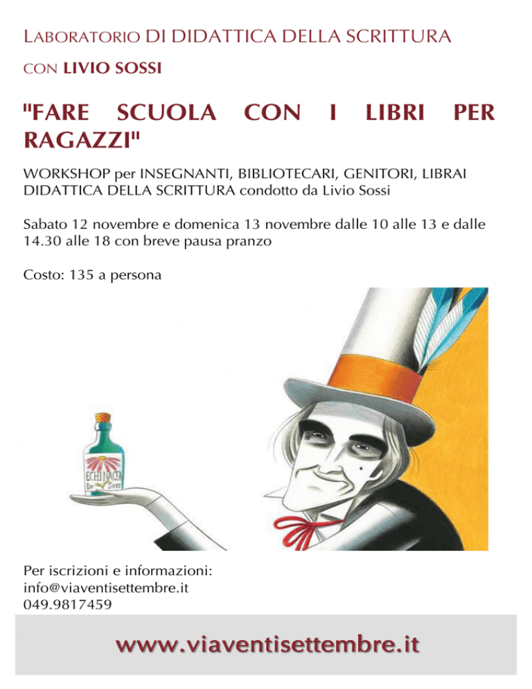 LABORATORIO DI DIDATTICA DELLA SCRITTURA CON LIVIO SOSSI "FARE SCUOLA RAGAZZI" CON I LIBRI PER WORKSHOP per INSEGNANTI, BIBLIOTECARI, GENITORI, LIBRAI DIDATTICA DELLA SCRITTURA condotto da Livio Sossi Sabato 12 novembre e domenica 13 novembre dalle 10 alle 13 e dalle 14.30 alle 18 con breve pausa pranzo Costo: 135 a persona Per iscrizioni e informazioni: [email protected] 049.9817459 Carissimi tutti, ecco il programma dettagliato del laboratorio. CORSO DI FORMAZIONE PER DOCENTI DELLA SCUOLA PRIMARIA E DELLA SCUOLA SECONDARIA DI 1° GRADO “LO SVILUPPO DELLE ABILITA’ DI LETTURA E DI SCRITTURA E DELLE COMPETENZE LINGUISTICHE ATTRAVERSO LE TIPOLOGIE TESTUALI DELLA LETTERATURA PER L’INFANZIA E PER I RAGAZZI” IL RACCONTO DI SITUAZIONE - LA FIABA E IL RACCONTO FANTASTICO – LA POESIA 1. INTRODUZIONE: Come la letteratura per l’infanzia può favorire lo sviluppo e il recupero delle abilità e delle competenze di lettura e scrittura degli alunni sulle tematiche conoscitive e di comprensione. Analisi della situazione di partenza. Individuazione delle criticità e delle lacune. Il ruolo della lettura. Perché leggere? Che cos’è la scrittura? Perché gli scrittori scrivono? La scrittura come informazione. La scrittura come denuncia. La scrittura come recupero della memoria storica. La scrittura come gioco. Come creare l’abitudine al leggere: lettori si diventa. Lettura sensuale. Lettura come piacere. Lettura critica. Tipologie di generi e forme letterarie nella letteratura giovanile. 1. La scrittura di un racconto di situazione e di un albo illustrato. Il concetto di situazione narrativa (Situazioni esperenziali tratte dal vissuto del bambino). Alcuni esempi. Una mattina a scuola; una giornata con papà; l’incontro con un amico; andare in spiaggia. Utilizzo di personaggi umani reali (mamma, bambini, nonni, ecc.). Utilizzo di personaggi animali. Il concetto di realismo magico. Come è possibile iterare una personaggio (“Pimpa”, “Giulio Coniglio”). Gli animali della letteratura per ragazzi. Sviluppo delle competenze sui nessi e rapporti spaziali, temporali (prima, dopo, ora), topologici (dentro / fuori; sopra / sotto) e causali (rapporto causa / effetto), e sulle opposizioni semantiche (bello / brutto) attraverso l’analisi degli albi illustrati. Esercitazioni pratiche. L’impiego dell’io narrante. La scrittura diaristica. Come si scrive un diario. Utilizzo di un doppio o triplo io narrante (la stessa situazione narrativa; situazioni narrative diverse). Le lettere e gli sms. La scelta e la modifica del punto di vista narrativo. Raccontare la storia di Anna Frank scegliendo come io narrante l’ippocastano (Irene Cohen Janca, “L’albero di Anne”). Esercitazioni pratiche. Il linguaggio degli sms. Scrittura di un testo in centosessassanta battute. Applicazione del modello proposto in “Favole al telefonino” di Fabian Negrin. Le opposizioni semantiche. I contrari. Le associazioni. Costruzione di un albo sulle opposizioni semantiche e sulle associazioni (dai modelli di Hervé Tuillet, di Pittau & Gervais, di Remy Charlip). Fortunatamente / Sfortunatamente. Raymond Queneau e gli “Esercizi di stile”. Esercizi di stile con gli elementi delle fiabe. Utilizzo di 77 parole e 12 forme. Modelli Letterari: Bernard Friot e Fausta Orecchio e Olivier Douzou, “Fiabla – bla”. Costruzione di libri sui desideri dei bambini. “Vorrei avere…”, “Vorrei essere…” “Mi piace…”. “Che bello quando…”, “Se io fossi”. Modelli letterari: Anthony Browne, “Cosa mi piace…”, Angela Freno, “Che bello quando...”, Giovanna Zoboli, “Vorrei avere…”, Arianna Papini, “Chi vorresti essere?” e altri. Costruzione di libri con testi antonimici o “à contrainte”. Modelli letterari: Anna Lavatelli, “Manuale della Befana” “E’ / Non è”. Modelli letterari: Antoinette Portis, “Non è una scatola” I Catologhi narrativi. I Bestiari. Bestiari fantastici e bestiari reali (Ad esempio: gli animali in via di estinzione). Come realizzazione di un bestiario fantastico. Modelli letterari: Christian Morgenstern, Pino Pace, “Bestiacce” e “Univerzoo”, Alessio Marzaduri, “Meccanimali”, Jopsé Jorge Letria, “Animali fantastici”, e altri. Altri cataloghi narrativi: le case, le paure, i sentimenti, ecc. Raccontare la paura e le emozioni. Costruzione di albi illustrati su paure e emozioni. Modelli letterari: Fabio Brugnolaro, “Il Paurario di tutte le paure”, Cosetta Zanotti, “Ascolto, guardo” 2. La scrittura di un racconto fantastico. La tassonomia del fantastico di Todorov. Proiezione di un elemento reale in un mondo fantastico. Proiezione di un elemento fantastico in un mondo reale (quotidiano). Come passare dal reale al fantastico e viceversa: il doppio passaggio narrativo (Il “GGG” di Dahl; Harry Potter). Personaggi fantastici in un mondo fantastico (Tolkien, Lewis). Individuazione dei mezzi che rendono possibile il passaggio. 3. La scrittura della fiaba contemporanea. Fiaba popolare, fiaba classica e fiaba moderna. Le funzioni proppiane e le carte di Propp. La presenza dell’elemento magico. Protagonista e antagonista. Come scrivere una fiaba moderna. Tecniche rodariane. Il “Binomio fantastico” applicato alla scrittura delle fiabe. Le fiabe con cinque parole. Operazioni con le fiabe. Come intervenire. Attualizzazioni delle fiabe. Attualizzazione iconica e attualizzazione testuale. La collocazione in un luogo e in un’epoca storica definiti. Il “Cappuccetto rosso” di Tony Ross. Continuazioni delle fiabe. “Casa pelosa” di Sebastiano Ruiz Mignone. “E poi, e poi, e poi…” di Roberto Piumini. L’opera di Pietro Formentini. Rovesciamento e modifica degli attributi. Come la modifica dell’attributo cambia la struttura narrativa. I “Cappuccetti” di Bruno Munari e Maria Enrica Agostinelli. “La Brutta addormentata nel bosco” di Gegoire Solotareff. Operare cambiando gli attributi. Modifica o rovesciamento dei ru