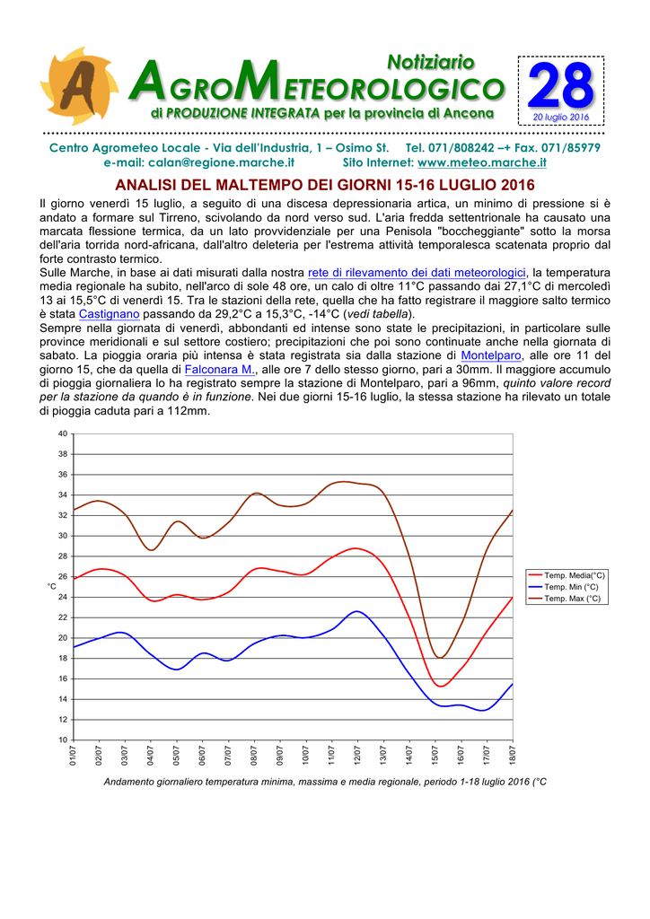AGROMETEOROLOGICO 28 Notiziario di PRODUZIONE INTEGRATA per la provincia di Ancona 20 luglio 2016 Centro Agrometeo Locale - Via dell’Industria, 1 – Osimo St. Tel. 071/808242 –+ Fax. 071/85979 e-mail: [email protected] Sito Internet: www.meteo.marche.it ANALISI DEL MALTEMPO DEI GIORNI 15-16 LUGLIO 2016 Il giorno venerdì 15 luglio, a seguito di una discesa depressionaria artica, un minimo di pressione si è andato a formare sul Tirreno, scivolando da nord verso sud. L'aria fredda settentrionale ha causato una marcata flessione termica, da un lato provvidenziale per una Penisola "boccheggiante" sotto la morsa dell'aria torrida nord-africana, dall'altro deleteria per l'estrema attività temporalesca scatenata proprio dal forte contrasto termico. Sulle Marche, in base ai dati misurati dalla nostra rete di rilevamento dei dati meteorologici, la temperatura media regionale ha subito, nell'arco di sole 48 ore, un calo di oltre 11°C passando dai 27,1°C di mercoledì 13 ai 15,5°C di venerdì 15. Tra le stazioni della rete, quella che ha fatto registrare il maggiore salto termico è stata Castignano passando da 29,2°C a 15,3°C, -14°C (vedi tabella). Sempre nella giornata di venerdì, abbondanti ed intense sono state le precipitazioni, in particolare sulle province meridionali e sul settore costiero; precipitazioni che poi sono continuate anche nella giornata di sabato. La pioggia oraria più intensa è stata registrata sia dalla stazione di Montelparo, alle ore 11 del giorno 15, che da quella di Falconara M., alle ore 7 dello stesso giorno, pari a 30mm. Il maggiore accumulo di pioggia giornaliera lo ha registrato sempre la stazione di Montelparo, pari a 96mm, quinto valore record per la stazione da quando è in funzione. Nei due giorni 15-16 luglio, la stessa stazione ha rilevato un totale di pioggia caduta pari a 112mm. 40 38 36 34 32 30 28 Temp. Media(°C) Temp. Min (°C) Temp. Max (°C) 26 °C 24 22 20 18 16 14 12 18/07 17/07 16/07 15/07 14/07 13/07 12/07 11/07 10/07 09/07 08/07 07/07 06/07 05/07 04/07 03/07 02/07 01/07 10 Andamento giornaliero temperatura minima, massima e media regionale, periodo 1-18 luglio 2016 (°C OLIVO • Mosca Questa settimana si evidenzia dai monitoraggi nelle zone litoranee e di prima collina un deciso aumento delle catture sulle trappole a feromoni e dell’ovideposizione. Si consiglia quindi, di intervenire entro la fine della settimana secondo le indicazioni riportate nella tabella sottostante: METODO DI DIFESA ADULTICIDA* (ammesso dal metodo di coltivazione biologico) Soglia d’intervento Modalità del trattamento 1 – 2 % di infestazione attiva raggiunta su parte della chioma, su tutto il perimetro dell’oliveto ed a file alterne (per 1 ettaro di oliveto utilizzare 1 litro di prodotto commerciale diluito in 4 litri di acqua). Prodotti utilizzabili Spinosad* (♣) già formulato con specifica esca pronta per l’uso (max 6 interventi). Località che necessitano del trattamento Fascia 2 (rischio medio): Barbara, Castelbellino, Castelleone di Suasa, Castelplanio, Corinaldo, Cupramontana, Filottrano, Maiolati Spontini, Mergo, Monteroberto, Montecarotto, Ostra Vetere, Poggio S. Marcello, Rosora, San Paolo di Jesi, Santa Maria Nuova, Serra de’Conti, Staffolo. Tempestivamente Tempi di intervento (*) Da ripetere in caso di importanti precipitazioni. METODO DI DIFESA LARVICIDA (metodo convenzionale ammesso dalle linee di difesa integrata) Soglia d’intervento Modalità trattamento 10 % di infestazione attiva raggiunta del Prodotti utilizzabili Località che necessitano del trattamento su tutta la chioma Insetticida a base di Dimetoato (max 2 all’anno) o Imidacloprid* (max 1 all’anno). (*) particolarmente indicato in queste prime fasi di infestazioni e con le drupe in accrescimento. Zona Conero: Ancona, Camerano, Loreto, Numana, Sirolo. Fascia 3 (rischio elevato): Agugliano, Belvedere Ostrense, Camerata Picena, Castelcolonna, Castelfidardo, Chiaravalle, Falconara Marittima, Jesi, Monsano, Monte San Vito, Montemarciano, Monterado, Morro d’Alba, Offagna, Osimo, Ostra, Polverigi, Ripe, San Marcello, Senigallia, Filottrano. Tempi di intervento Entro la fine della settimana Questa è la situazione del volo e dell’infestazione nei nostri areali: http://meteo.regione.marche.it/calmonitoraggio/mappaCatture.aspx?prov=AN&idParass=7 VITE La vite si trova nella fase fenologica di chiusura del grappolo BBCH 79. • Peronospora e Oidio Non si evidenziano particolari problematiche fitosanitarie. Si consiglia, al fine di mantenere una sufficiente copertura antioidica, di effettuare un intervento a base di zolfo in polvere (♣) da effettuarsi preferibilmente nelle ore più fresche della giornata. • Tignoletta E’ ormai terminato il volo di seconda generazione. Si consiglia, per chi ha le trappole, di sostituire a breve i ferormoni per il monitoraggio della terza. COMINICAZIONI SIPCAM organizza il seguente seminario tecnico: "3Logy: antibotrico a base di terpeni per la protezione della vite". mercoledì 27 luglio ore 15.00 Presso sala convegni ASSAM Via dell’Industria 1 Osimo Assam-regione marche univ politecnica dell marche organizzazno il seguente incontro tecnico: 48° MOSTRA POMOLOGICA - Venerdì 22 luglio Ore 18,00 presso Az. Agr. ASSAM Carassai AP Per informazioni: A.S.S.A.M. Agenzia Servizi Settore Agroalimentare delle Marche Via dell’Industria 1 Osimo Centro Produzioni Agricole Tel. : 071 8081 - Fax 071 85979 Az. Agr. Sperimentale A.S.S.A.M. Petritoli Via S. Marziale Petritoli (A.P.) Tel. : 0734/658959 ANDAMENTO METEOROLOGICO DAL 13/07/2016 AL 19/07/2016 T. Media (°C) T. Max (°C) T. Min. (°C) Umidità (%) Prec. (mm) T. Media (°C) T. Max (°C) T. Min. (°C) Umidità (%) Prec. (mm) Agugliano (140 m) Apiro (270 m) Arcevia (295 m) Barbara (196 m) 23.2 (7) 33.6 (7) 15.3 (7) 57.7 (7) 49.2 (7) 21.1 (7) 34.3 (7) 10.5 (7) 50.6 (7) 67.8 (7) 21.9 (7) 33.5 (7) 13.0 (7) 46.1 (7) 52.2 (7) 22.0 (7) 34.2 (7) 12.8 (7) 46.6 (7) 45.8 (7) Maiolati (350 m) Moie (18