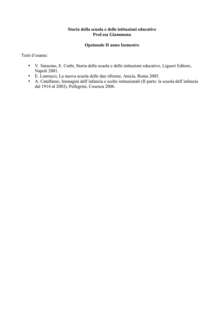 Storia della scuola e delle istituzioni educative Prof.ssa Giammona Opzionale II anno Isemestre Testi d’esame: • • • V. Saracino, E. Corbi, Storia della scuola e delle istituzioni educative, Liguori Editore, Napoli 2001. E. Lastrucci, La nuova scuola delle due riforme, Anicia, Roma 2005. A. Catalfamo, Immagini dell’infanzia e scelte istituzionali (II parte: la scuola dell’infanzia dal 1914 al 2003), Pellegrini, Cosenza 2006.
