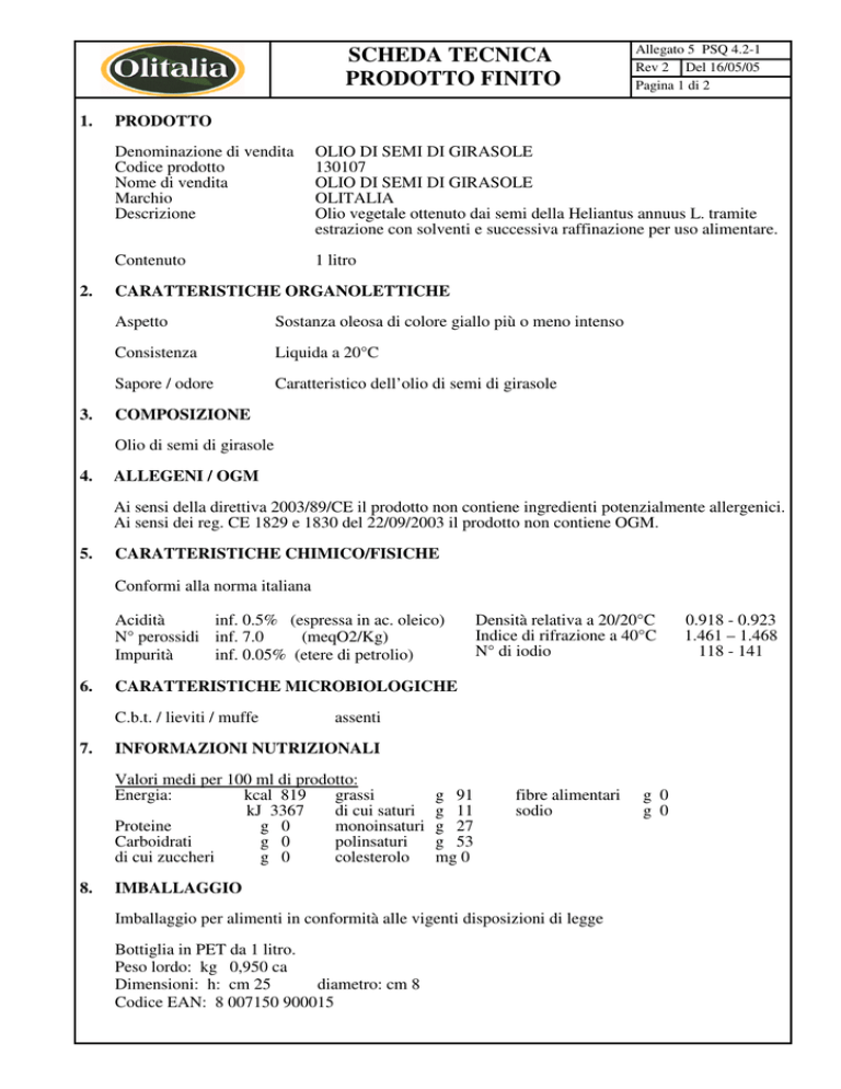 SCHEDA TECNICA PRODOTTO FINITO 1. 2. 3. Allegato 5 PSQ 4.2-1 Rev 2 Del 16/05/05 Pagina 1 di 2 PRODOTTO Denominazione di vendita Codice prodotto Nome di vendita Marchio Descrizione OLIO DI SEMI DI GIRASOLE 130107 OLIO DI SEMI DI GIRASOLE OLITALIA Olio vegetale ottenuto dai semi della Heliantus annuus L. tramite estrazione con solventi e successiva raffinazione per uso alimentare. Contenuto 1 litro CARATTERISTICHE ORGANOLETTICHE Aspetto Sostanza oleosa di colore giallo più o meno intenso Consistenza Liquida a 20°C Sapore / odore Caratteristico dell’olio di semi di girasole COMPOSIZIONE Olio di semi di girasole 4. ALLEGENI / OGM Ai sensi della direttiva 2003/89/CE il prodotto non contiene ingredienti potenzialmente allergenici. Ai sensi dei reg. CE 1829 e 1830 del 22/09/2003 il prodotto non contiene OGM. 5. CARATTERISTICHE CHIMICO/FISICHE Conformi alla norma italiana Acidità inf. 0.5% (espressa in ac. oleico) N° perossidi inf. 7.0 (meqO2/Kg) Impurità inf. 0.05% (etere di petrolio) 6. CARATTERISTICHE MICROBIOLOGICHE C.b.t. / lieviti / muffe 7. assenti INFORMAZIONI NUTRIZIONALI Valori medi per 100 ml di prodotto: Energia: kcal 819 grassi kJ 3367 di cui saturi Proteine g 0 monoinsaturi Carboidrati g 0 polinsaturi di cui zuccheri g 0 colesterolo 8. Densità relativa a 20/20°C Indice di rifrazione a 40°C N° di iodio g 91 g 11 g 27 g 53 mg 0 fibre alimentari sodio IMBALLAGGIO Imballaggio per alimenti in conformità alle vigenti disposizioni di legge Bottiglia in PET da 1 litro. Peso lordo: kg 0,950 ca Dimensioni: h: cm 25 diametro: cm 8 Codice EAN: 8 007150 900015 g 0 g 0 0.918 - 0.923 1.461 – 1.468 118 - 141 SCHEDA TECNICA PRODOTTO FINITO 9. Allegato 5 PSQ 4.2-1 Rev 2 Del 16/05/05 Pagina 2 di 2 UNITA’ DI VENDITA Wrap cartone Peso lordo: Pezzi per imballo: Dimensioni: kg 11,5 ca n° 12 h: cm 26,0 lunghezza: cm 33,5 larghezza: cm 25,0 10. PALLETTIZZAZIONE Tipo pallet N° colli per strato: N° strati per pallet: N° colli su pallet: Dimensioni: Peso lordo: Totale litri: Epal 10 4 40 h: cm 116 kg 478 ca 480 lunghezza: cm 120 larghezza: cm 80 11. SHELF-LIFE E LOTTO T.M.C. espresso in giorno/mese/anno. Durata 18 mesi dalla data di confezionamento LOTTO espresso in giorno progressivo anno/anno confezionamento 12. TRASPORTO E CONSERVAZIONE Temperatura compresa fra i 18 – 22 °C. Conservare in ambiente fresco ed asciutto, lontano dalla luce e da fonti di calore.