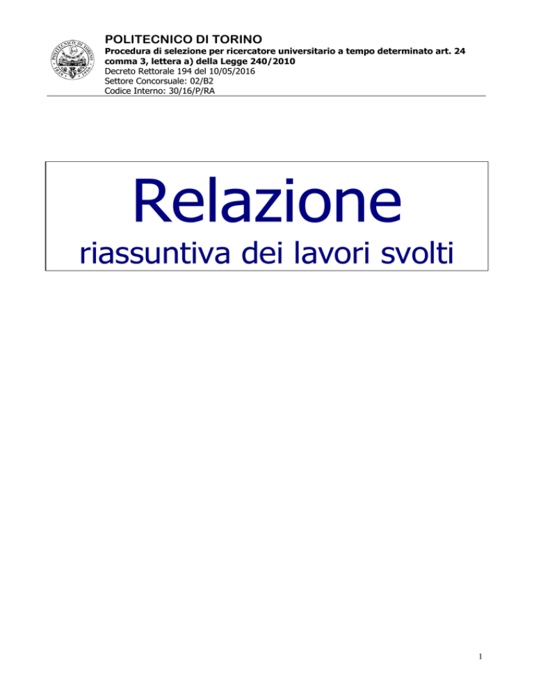 POLITECNICO DI TORINO Procedura di selezione per ricercatore universitario a tempo determinato art. 24 comma 3, lettera a) della Legge 240/2010 Decreto Rettorale 194 del 10/05/2016 Settore Concorsuale: 02/B2 Codice Interno: 30/16/P/RA Relazione riassuntiva dei lavori svolti 1 POLITECNICO DI TORINO Procedura di selezione per ricercatore universitario a tempo determinato art. 24 comma 3, lettera a) della Legge 240/2010 Decreto Rettorale 194 del 10/05/2016 Settore Concorsuale: 02/B2 Codice Interno: 30/16/P/RA Avvalendosi degli strumenti telematici di lavoro collegiale, alle ore 18:30 del giorno 3 Ottobre 2016 si è riunita la Commissione Giudicatrice della procedura di selezione ad un posto di ricercatore universitario a tempo determinato, Settore Concorsuale: 02/B2 Fisica Teorica della Materia codice interno 30/16/P/RA per la stesura della Relazione riassuntiva dei lavori svolti. Sono presenti tutti i membri della Commissione Prof. Rossi Fausto Prof. Andreani Lucio Prof. Fazio Rosario Presidente Segretario Componente I Commissari si sono collegati ognuno dalla propria postazione telematica, come di seguito specificato: Prof. Fausto Rossi presso il Dipartimento di Scienza Applicata e Tecnologia del Politecnico di Torino, Prof. Lucio Andreani presso il Dipartimento di Fisica, dell’Università degli Studi di Pavia, Prof. Rosario Fazio presso l’International Centre for Theoretical Physics di Trieste, Italia. La commissione, nominata con Decreto Rettorale n. 302 del 08/07/2016, risulta così composta Cognome e nome Prof. Rossi Fausto Prof. Andreani Prof. Fazio Rosario Qualifica Ordinario Ordinario Ordinario Ateneo Politecnico di Torino Università degli Studi di Pavia Scuola Normale Superiore Pisa La commissione si è riunita nei seguenti giorni: Individuazione criteri: alle ore 15 del giorno 25/07/2016 con modalità telematica (allegato A parte integrante del verbale 1) Valutazione preliminare: dalle ore 10 alle ore 17 del giorno 17 07/09/2016 con modalità telematica (Allegato A parte integrante del verbale 2) Canditati ammessi alla discussione dei titoli e della produzione scientifica: Candidato Barbiero Luca Bertaina Gianluca De Pasquale Antonella Lepori Luca Marzolino Ugo Tocchio Luca Fausto Colloquio discussione titoli e produzione scientifica: dalle ore 9:00 alle ore 13:00 del giorno 30/09/2016 presso l’aula 2F del Dipartimento di Scienza Applicata e Tecnologia del Politecnico di Torino. Erano presenti i seguenti candidati Candidato Barbiero Luca Bertaina Gianluca De Pasquale Antonella Lepori Luca Marzolino Ugo 2 POLITECNICO DI TORINO Procedura di selezione per ricercatore universitario a tempo determinato art. 24 comma 3, lettera a) della Legge 240/2010 Decreto Rettorale 194 del 10/05/2016 Settore Concorsuale: 02/B2 Codice Interno: 30/16/P/RA Tocchio Luca Fausto Valutazione titoli e pubblicazioni esclusivamente dei candidati che si sono presentati alla discussione: dalle ore 14 alle ore 18 del giorno 03/10/2016 con modalità telematica. La Commissione giudicatrice sulla base dei criteri di valutazione stabiliti nella prima riunione e pubblicizzati in data 27/07/2016 ha attribuito i seguenti punteggi: Candidato Tocchio Luca Fausto Marzolino Ugo Bertaina Gianluca De Pasquale Antonella Barbiero Luca Lepori Luca Titoli 27,10 26,75 23,25 27,35 22,20 23,50 Pubblicazioni 61,53 59,70 61,25 54,22 59,06 52,05 Punteggio complessivo 88,63 86,45 84,50 81,57 81,26 75,55 Secondo quanto previsto dall’art. 10 comma 9 del Decreto Rettorale n. 188/2016 “Regolamento di Ateneo per il Reclutamento dei ricercatori a tempo determinato Legge 240/2010” e dall’art. 12 del bando di concorso la Commissione, in base ai criteri e ai parametri stabiliti nella riunione preliminare, tenendo conto dei giudizi analitici collegiali espressi sui titoli e sulla produzione scientifica, dei punteggi conseguiti nella valutazione dei titoli e della pubblicazioni di ciascun candidato e dei conseguenti giudizi collegiali, ha individuato, previa delibera assunta all’unanimità dei componenti, il candidato maggiormente qualificato a svolgere le funzioni didattiche e di ricerca per le quali è stata attivata la procedura di selezione: Tocchio Luca Fausto La Commissione, infine, avendo espletato il proprio mandato, ha dichiarato chiusi i lavori alle ore 19 e rimette al Rettore del Politecnico, unitamente alla presente relazione riassuntiva, i verbali delle riunioni, debitamente sottoscritti in un’unica copia originale, ed ogni altro materiale ricevuto per l'espletamento della procedura di selezione dall’Ufficio Valutazioni Comparative e Assegni di Ricerca. La presente Relazione riassuntiva, con annessi i giudizi collegiali, sarà resa pubblica per via telematica ai sensi dell’art. 10 comma 15 del Decreto Rettorale n. 188/2016 “Regolamento di Ateneo per il Reclutamento dei ricercatori a tempo determinato Legge 240/2010”. Letto, approvato e sottoscritto Per la Commissione: Presidente Prof. Fausto Rossi f.to Fausto ROSSI 3 POLITECNICO DI TORINO Procedura di selezione per ricercatore universitario a tempo determinato art. 24 comma 3, lettera a) della Legge 240/2010 Decreto Rettorale 194 del 10/05/2016 Settore Concorsuale: 02/B2 Codice Interno: 30/16/P/RA Allegato A Valutazione preliminare Giudizio analitico collegiale (parte integrante del verbale 2) 4 POLITECNICO DI TORINO Procedura di selezione per ricercatore universitario a tempo determinato art. 24 comma 3, lettera a) della Legge 240/2010 Decreto Rettorale 194 del 10/05/2016 Settore Concorsuale: 02/B2 Codice Interno: 30/16/P/RA Candidato: Barbiero Luca Curriculum e Titoli Giudizio analitico collegiale Il candidato, nato nel 1983, ha conseguito il Dottorato di Ricerca in Fisica nel 2012 presso il Politecnico di Torino con una tesi riguardante lo studio dei modelli di Hubbard. Ha poi svolto alcuni anni di attività post dottorale di ricerca e formazione su tematiche simili presso istituzioni italiane (Uni-Padova e SISSA-Trieste) e straniere (Uni-Tolosa). Ha pa
