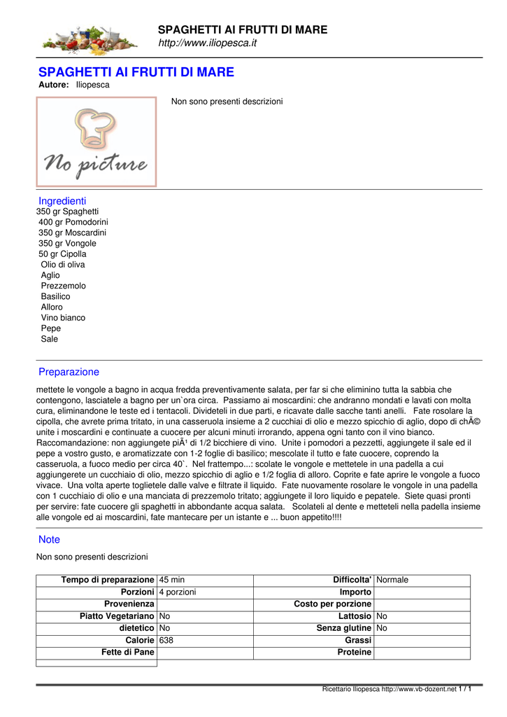 SPAGHETTI AI FRUTTI DI MARE http://www.iliopesca.it SPAGHETTI AI FRUTTI DI MARE Autore: Iliopesca Non sono presenti descrizioni Ingredienti 350 gr Spaghetti 400 gr Pomodorini 350 gr Moscardini 350 gr Vongole 50 gr Cipolla Olio di oliva Aglio Prezzemolo Basilico Alloro Vino bianco Pepe Sale Preparazione mettete le vongole a bagno in acqua fredda preventivamente salata, per far si che eliminino tutta la sabbia che contengono, lasciatele a bagno per un`ora circa. Passiamo ai moscardini: che andranno mondati e lavati con molta cura, eliminandone le teste ed i tentacoli. Divideteli in due parti, e ricavate dalle sacche tanti anelli. Fate rosolare la cipolla, che avrete prima tritato, in una casseruola insieme a 2 cucchiai di olio e mezzo spicchio di aglio, dopo di ché unite i moscardini e continuate a cuocere per alcuni minuti irrorando, appena ogni tanto con il vino bianco. Raccomandazione: non aggiungete più di 1/2 bicchiere di vino. Unite i pomodori a pezzetti, aggiungete il sale ed il pepe a vostro gusto, e aromatizzate con 1-2 foglie di basilico; mescolate il tutto e fate cuocere, coprendo la casseruola, a fuoco medio per circa 40`. Nel frattempo...: scolate le vongole e mettetele in una padella a cui aggiungerete un cucchiaio di olio, mezzo spicchio di aglio e 1/2 foglia di alloro. Coprite e fate aprire le vongole a fuoco vivace. Una volta aperte toglietele dalle valve e filtrate il liquido. Fate nuovamente rosolare le vongole in una padella con 1 cucchiaio di olio e una manciata di prezzemolo tritato; aggiungete il loro liquido e pepatele. Siete quasi pronti per servire: fate cuocere gli spaghetti in abbondante acqua salata. Scolateli al dente e metteteli nella padella insieme alle vongole ed ai moscardini, fate mantecare per un istante e ... buon appetito!!!! Note Non sono presenti descrizioni Tempo di preparazione Porzioni Provenienza Piatto Vegetariano dietetico Calorie Fette di Pane 45 min 4 porzioni No No 638 Difficolta' Normale Importo Costo per porzione Lattosio No Senza glutine No Grassi Proteine Ricettario Iliopesca http://www.vb-dozent.net 1 / 1