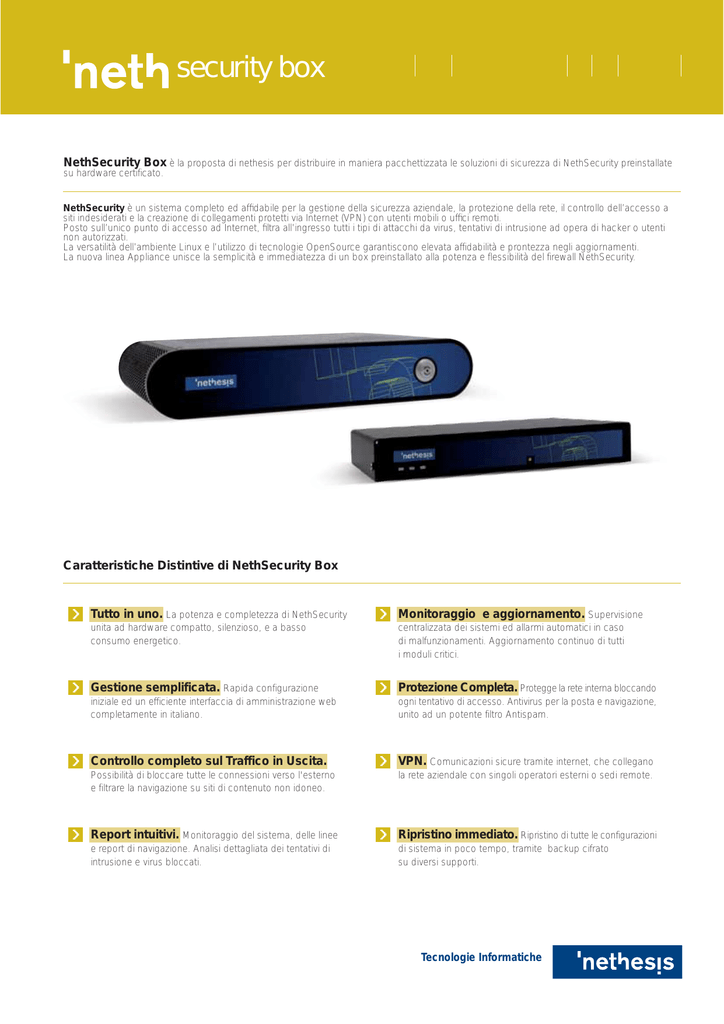 security box NethSecurity Box è la proposta di nethesis per distribuire in maniera pacchettizzata le soluzioni di sicurezza di NethSecurity preinstallate su hardware certificato. NethSecurity è un sistema completo ed affidabile per la gestione della sicurezza aziendale, la protezione della rete, il controllo dell’accesso a siti indesiderati e la creazione di collegamenti protetti via Internet (VPN) con utenti mobili o uffici remoti. Posto sull’unico punto di accesso ad Internet, filtra all’ingresso tutti i tipi di attacchi da virus, tentativi di intrusione ad opera di hacker o utenti non autorizzati. La versatilità dell’ambiente Linux e l’utilizzo di tecnologie OpenSource garantiscono elevata affidabilità e prontezza negli aggiornamenti. La nuova linea Appliance unisce la semplicità e immediatezza di un box preinstallato alla potenza e flessibilità del firewall NethSecurity. Caratteristiche Distintive di NethSecurity Box Tutto in uno. La potenza e completezza di NethSecurity unita ad hardware compatto, silenzioso, e a basso consumo energetico. Monitoraggio e aggiornamento. Supervisione Gestione semplificata. Rapida configurazione iniziale ed un efficiente interfaccia di amministrazione web completamente in italiano. Protezione Completa. Protegge la rete interna bloccando Controllo completo sul Traffico in Uscita. VPN. Comunicazioni sicure tramite internet, che collegano Possibilità di bloccare tutte le connessioni verso l'esterno e filtrare la navigazione su siti di contenuto non idoneo. la rete aziendale con singoli operatori esterni o sedi remote. Report intuitivi. Monitoraggio del sistema, delle linee Ripristino immediato. Ripristino di tutte le configurazioni di sistema in poco tempo, tramite backup cifrato su diversi supporti. e report di navigazione. Analisi dettagliata dei tentativi di intrusione e virus bloccati. centralizzata dei sistemi ed allarmi automatici in caso di malfunzionamenti. Aggiornamento continuo di tutti i moduli critici. ogni tentativo di accesso. Antivirus per la posta e navigazione, unito ad un potente filtro Antispam. Tecnologie Informatiche security box Caratteristiche Tecniche NETH SECURITY Studio Office Enterprise Utenti Max Consigliati 10 25 40 Lan 3 3 4 Email/giorno 2000 5000 8000 Vpn (H2N e N2N) 10 20 30 Processore AMD Geode 500MHz Via C7 V4 1 GHz Intel Celeron M 1 GHz Scheda Alix VIA CN700 Intel 852GM Disco CF 2 GB CF 4 GB HD 80 GB 256 (256) 512 (1024) 512 (1024) Seriale 1 1 1 USB 2 2 4 Dimensioni 28 x 158 x 155 mm 50 x 275 x 172 mm 50 x 275 x 172 mm Fanless Ram MB (max) Tastiera – Vga Presente Non disponibile VPN OpenVPN: Net-to-Net. Host-to-Net (Roadwarrior). Basata su SSL. Attraversa NAT multipli. Dead Peer Detection. Supporto a IP dinamici. Client per Windows 2000 o successivi, Linux e Mac. IPSec: Net-to-Net. Host-to-Net (Roadwarrior). IKE: PSK, Certificati X.509. CA Integrata. Supporto NAT-T. Dead Peer Detection. HMAC: SHA2,SHA1,MD5. Encryption: AES, 3DES, Twofish, Serpent, Blowfish. PPTP: Autenticazione locale. Passthrough. Monitoraggio Gestione Monitoraggio da Centro Servizi Nethesis. Monitoraggio Servizi. Stato del Sistema. Grafici di traffico. Traffico totale. Dettaglio utilizzo Banda. Visualizzazione log con esportazione. Rotazione e conservazione automatica log. Proxy POP3 e SMTP trasparente Proxy POP3 e SMTP trasparente. Blocco degli allegati pericolosi. Antivirus con aggiornamento automatico delle firme. Regole Antispam continuamente aggiornate. Filtri bayesiani e autoapprendimento. Blacklist RBL. Servizi di rete Server DHCP. Server NTP (anche client). DNS Dinamico. DNS Caching DNS Proxy. Gestione host locali. Aggiornamenti Aggiornamenti automatici. Gestione centralizzata da Centro Servizi. Aggiornamenti di versione semplificati e rapidi. Interfaccia di Gestione e Configurazione Semplice ed immediata. Italiano e Inglese. Accesso SSH. Gestione degli utenti. Backup e Restore. Supporto Raid. Controllo della Navigazione Proxy HTTP avanzato. Filtro Contenuti. Scansione Antivirus. Navigazione autenticata: locale, Active Directory, NT, Ldap. URL filtering. Controllo accessi. Content inspection. Sicurezza Firewall Stateful Inspection. Zone separate per DMZ e WiFi. IP pubblici multipli (Alias). Proxy HTTP, SMTP e POP3. Ingress/Egress Packet Filtering. Intrusion Detection. Protezione SYN flood. Protezione ICMP Flood e Anti Spoofing. Blocco traffico in uscita. Gestione Priorità Traffico Per porta. Tipo di Servizio (ToS). Connettività Ethernet 10/100 Mbps. IP Statico o DHCP. ADSL: PPPoA, PPPoE, RFC1483. ISDN (anche due canali). Connessione su richiesta oppure manuale. Riconnessione automatica. Dual Wan (load balance, fail over). Group Nethesis s.r.l. Via degli Olmi, 16/4 61100 Pesaro (PU) t. +39 0721 405516 f. +39 0721 268147 www.nethesis.it service box NethService Box è la proposta Nethesis per fornire in maniera pacchettizzata le soluzioni di gestione reti e moduli verticali di NethService preinstallati su hardware certificato. NethService è la soluzione per risolvere ogni necessità di comunicazione aziendale, protegge la rete aziendale da Internet filtrando virus e spam, integra un server di posta elettronica e un server web per pubblicare informazioni su Internet ed intranet. I servizi di Groupware e il File server permettono una efficace circolazione di informazioni tra gli utenti grazie alla condivisione di agenda, note, attività, rubrica e documenti. Il sistema di gestione fax centralizzato è in grado di sopportare grossi carichi di lavoro e di inoltrare ai rispettivi destinatari, attraverso semplici email, i fax ricevuti. Completano la suite soluzioni verticali specializzate: HotSpot, centralino VoIP e CRM. Basato su hardware dedicato dalle dimensioni ridotte, NethServiceBox unisce l'estrema affidabilità e completezza dei moduli di NethService alla compattezza e praticità di un hardware preinstallato, assicurando un elevato livello di prestazioni. I servizi preinstallati comprendono un primo strato che garantisce la 