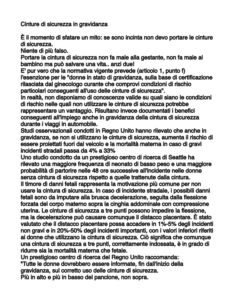 Cinture di sicurezza in gravidanza È il momento di sfatare un mito: se sono incinta non devo portare le cinture di sicurezza. Niente di più falso. Portare la cintura di sicurezza non fa male alla gestante, non fa male al bambino ma può salvare una vita.. anzi due! E' pur vero che la normativa vigente prevede (articolo 1, punto f) l'esenzione per le "donne in stato di gravidanza, sulla base di certificazione rilasciata dal ginecologo curante che comprovi condizioni di rischio particolari conseguenti all'uso delle cinture di sicurezza". In realtà, non disponiamo di conoscenze valide su quali siano le condizioni di rischio nelle quali non utilizzare le cinture di sicurezza potrebbe rappresentare un vantaggio. Risultano invece documentati i benefici conseguenti all'impiego anche in gravidanza della cintura di sicurezza durante i viaggi in automobile. Studi osservazionali condotti in Regno Unito hanno rilevato che anche in gravidanza, se non si utilizzano le cinture di sicurezza, aumenta il rischio di essere proiettati fuori dal veicolo e la mortalità materna in caso di gravi incidenti stradali passa da 4% a 33% Uno studio condotto da un prestigioso centro di ricerca di Seattle ha rilevato una maggiore frequenza di neonato di basso peso e una maggiore probabilità di partorire nelle 48 ore successive all'incidente nelle donne senza cintura di sicurezza rispetto a quelle trattenute dalla cintura. Il timore di danni fetali rappresenta la motivazione più comune per non usare la cintura di sicurezza. In caso di incidente stradale, i possibili danni fetali sono da imputare alla brusca decelerazione, seguita dalla flessione forzata del corpo materno sopra la cinghia addominale con compressione uterina. Le cinture di sicurezza a tre punti possono impedire la flessione, ma la decelerazione può causare comunque il distacco placentare. È stato valutato che il distacco placentare possa accadere in 1%-5% degli incidenti non gravi e in 20%-50% degli incidenti importanti, con i valori inferiori riferiti ai donne che utilizzano la cintura di sicurezza. Ciò significa che comunque una cintura di sicurezza a tre punti, correttamente indossata, è in grado di ridurre sia la mortalità materna che fetale. Un prestigioso centro di ricerca del Regno Unito raccomanda: "Tutte le donne dovrebbero essere informate, fin dall'inizio della gravidanza, sul corretto uso delle cinture di sicurezza. Più in alto e più in basso del pancione, non sopra. Si devono utilizzare cinture di sicurezza a tre punti con il nastro orizzontale posto il più in basso possibile, sotto l'addome gravido, ed il nastro diagonale posto al di sopra dell'addome, facendolo passare tra i seni. La cintura può essere regolata in modo da risultare confortevole e che il meccanismo di blocco non scatti senza motivo" Fonte: www.saperidoc.it