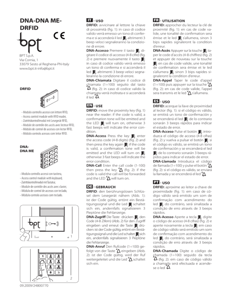 DNA-DNA MEDRFID IT - USO DRFID: avvicinare al lettore la chiave di prossimità (fig. 1): in caso di codice valido verrà emesso un tono di conferma e si accenderà il led , altrimenti 3 beep veloci segnaleranno la condizione di errore. DNA-Accesso Premere il tasto , digitare il codice di accesso (4-8 cifre) (fig. 2) e premere nuovamente il tasto : in caso di codice valido verrà emesso un tono di conferma e si accenderà il led , altrimenti 3 beep veloci segnaleranno la condizione di errore. DNA-Chiamata Digitare il codice di chiamata (1÷100) seguito dal tasto (fig. 2): in caso di codice valido la chiamata verrà inoltrata e si accenderà il led . BPT S.p.A. Via Cornia, 1 33079 Sesto al Reghena-PN-Italy [email protected] DRFID EN - USE - Modulo controllo accessi con lettore RFID, - Access control module with RFID reader, - Zutrittskontrollmodul mit Lesegerät RFID, - Module de contrôle des accès avec lecteur RFID, - Módulo de control de accesos con lector RFID, - Módulo controlo acessos com leitor RFID. DNADNA ME - Modulo controllo accessi con tastiera, - Access control module with keyboard, - Zutrittskontrollmodul mit Tastatur, - Module de contrôle des accès avec clavier, - Módulo de control de accesos con teclado, - Módulo controlo acessos com teclado. DE - GEBRAUCH 1 2 09.2009/24800770 DRFID: move the proximity key (fig. 1) near the reader: if the code is valid, a confirmation tone will be emitted and the LED will turn on, otherwise 3 fast beeps will indicate the error condition. DNA-Access Press the key , enter the access code (4-8 digits) (fig. 2) and then press the key again : if the code is valid, a confirmation tone will be emitted and the LED will turn on , otherwise 3 fast beeps will indicate the error condition. DNA-Call Enter the call code (1-100) then press the key (fig. 2): if the code is valid the call will be forwarded and the LED will turn on. DRFID: den berührungslosen Schlüssel dem Lesegerät nähern (Abb. 1): ist der Code gültig, ertönt ein Bestätigungssignal und die Led schaltet sich ein, andernfalls signalisieren 3 Pieptöne die Fehlanzeige. DNA-Zugriff Die Taste drücken , den Code (4-8 Zifern) (Abb. 2) für den Zugriff eingeben und erneut die Taste drücken: ist der Code gültig, ertönt ein Bestätigungssignal und die Led schaltet sich ein, andernfalls signalisieren 3 Pieptöne die Fehlanzeige. DNA-Anruf Den Rufcode (1÷100) gefolgt von der Taste eingeben (Abb. 2): ist der Code gültig, wird der Ruf weitergeleitet und die Led schaltet sich ein. FR - UTILISATION DRFID: approcher du lecteur la clé de proximité (fig. 1): en cas de code valide, une tonalité de confirmation sera émise et le led s’allumera, sinon 3 bips rapides signaleront la condition d’erreur. DNA-Accès Appuyer sur la touche , taper le code d’accès (4-8 chiffres) (fig. 2) et appuyer de nouveau sur la touche : en cas de code valide, une tonalité de confirmation sera émise et le led s’allumera , sinon 3 bips rapides signaleront la condition d’erreur. DNA-Appel Taper le code d’appel (1÷100) puis appuyer sur la touche (fig. 2): en cas de code valide, l’appel sera transmis et le led s’allumera. ES - USO DRFID: acerque la llave de proximidad al lector (fig. 1): si el código es válido, se emitirá un tono de confirmación y se encenderá el led ; de lo contrario sonarán 3 beeps rápidos para indicar el estado de error. DNA-Acceso Pulse el botón , introduzca el código de acceso (4-8 cifras) (fig. 2) y vuelva a pulsar el botón : si el código es válido, se emitirá un tono de confirmación y se encenderá el led ; de lo contrario sonarán 3 beeps rápidos para indicar el estado de error. DNA-Llamada Introduzca el código de llamada (1÷100) y pulse el botón (fig. 2): si el código es válido, se enviará la llamada y se encenderá el led . PT - USO DRFID: aproxime ao leitor a chave de proximidade (fig. 1): em caso de código válido será emitido um som de confirmação com acendimento do led , do contrário, será sinalizada a condição de erro através de 3 beeps rápidos. DNA-Acesso Aperte a tecla , digite o código de acesso (4-8 cifras) (fig. 2) e aperte novamente a tecla : em caso de código válido será emitido um som de confirmação com acendimento do led , do contrário, será sinalizada a condição de erro através de 3 beeps rápidos. DNA-Chamada Digite o código de chamada (1÷100) seguido da tecla (fig. 2): em caso de código válido a chamada será efectuada e acendese o led . IT - MONTAGGIO m Il montaggio o la rimozione 3 deve avvenire con posto esterno non alimentato. Togliere il tappo proteggi connettore come evidenziato in figura 3 e 4. Montare il modulo controllo accessi con tastiera (DNA-DNA ME) o il modulo controllo accessi con lettore RFID (DRFID) posizionandoli come indicato in figura 3 o 4. EN - INSTALLATION m Assembly and removal must 4 take place when the entry panel is not powered. Remove the connector protection plug as highlighted in figure 3 and 4. Install access control module with keyboard (���������������������� DNA-DNA ME������������ ) or the access control module with RFID reader (DRIF) placing them as indicated in figure 3 or 4. DE - MONTAGE DISPOSAL Do not litter the environment with packing material: make sure it is disposed of according to the regulations in force in the country where the product is used. When the equipment reaches the end of its life cycle, take measures to ensure it is not discarded in the environment. The equipment must be disposed of in compliance with the regulations in force, recycling its component parts wherever possible. Components that qualify as recyclable waste feature the relevant symbol and the material’s abbreviation. retrait avec le poste extérieur non alimenté. Retirer le bouchon de protection du connecteur comme mis en évidence aux figures 3 et 4. Monter les module contrôle accès avec clavier (DNA-DNA ME) ou modu