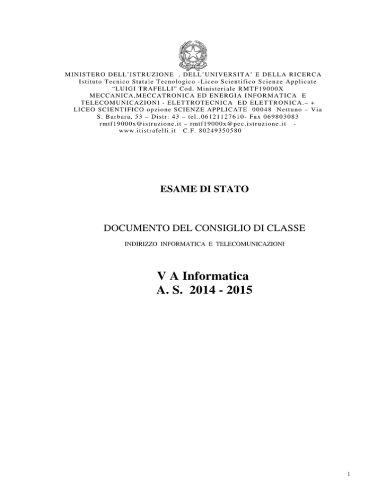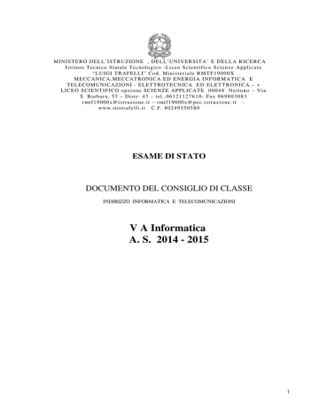 MI NI ST E RO DE LL’I ST RUZI ONE , DE LL’UNI VE RS I T A’ E D E LL A R I C E R C A I stituto T ecnico Statale T ecno lo gico -Liceo Scien t if i c o S c i e n z e Ap p l i c a t e “LUI GI T RAFE LLI ” Co d . Minister i a l e R M T F 1 9 0 0 0 X ME CCANI CA,ME CCAT RONI CA E D E NE RGI A I N F O R M AT I C A E T E LE COMUNI CAZI ONI - E LE T T ROT E CNI CA E D E L E T T R O N I C A.– + LI CE O SCI E NT I FI CO o p zio ne SCI E NZE AP P LI CAT E 0 0 0 4 8 N e t t u n o – V i a S. B ar b ar a, 5 3 – Distr : 4 3 – tel..0 6 1 2 1 1 2 7 6 1 0 - F a x 0 6 9 8 0 3 0 8 3 r mtf1 9 0 0 0 x@istr uzio ne.it – r mtf1 9 0 0 0 x@p e c . i s t r u z i o ne . i t www.itistr afelli.it C.F. 8 0 2 4 9 3 5 0 5 8 0 ESAME DI STATO DOCUMENTO DEL CONSIGLIO DI CLASSE INDIRIZZO INFORMATICA E TELECOMUNICAZIONI V A Informatica A. S. 2014 - 2015 1 1. DESCRIZIONE SINTETICA DELLA SCUOLA 1.1 L'Istituto L’Istituto Tecnico Industriale “ L. Trafelli ” nasce nel 1969 come sede staccata dell’ Istituto “ Severi “ di Roma e viene situato in via Orsenigo. Diventa autonomo nel 1973 e viene intitolato a Luigi Trafelli, studioso nettunese vissuto nella prima metà del Novecento. L’ ubicazione dell’Istituto nell’attuale edificio è del 1982. In più di 30 anni l’Istituto ha formato periti capotecnici nei settori dell’ Elettrotecnica, dell’Elettronica, dell' Informatica e della Meccanica. Dall’anno scolastico 1993-94 è stato attivato anche il corso sperimentale del Liceo Scientifico Tecnologico. Dall'' anno scolastico 2010/2011 è stata avviata la Riforma della Scuola Secondaria Superiore con attivi i seguenti indirizzi: – LICEO SCIENTIFICO – opzione Scienze Applicate; e – ISTITUTO TECNICO – Settore Tecnologico: • Informatica e Telecomunicazioni; • Elettronica ed Elettrotecnica; • Meccanica, Meccatronica ed Energia. 1.1.1. Caratteristiche costitutive dell'offerta formativa Indirizzi LICEO SCIENTIFICO opzione Scienze Applicate ISTITUTO TECNICO - SETT. TECNOLOGICO Informatica e Telecomunicazioni-Biennio Comune ISTITUTO TECNICO - SETT. TECNOLOGICO Informatica Triennio ISTITUTO TECNICO - SETT. TECNOLOGICO Elettronica ed Elettrotecnica.-Biennio Comune ISTITUTO TECNICO - SETT. TECNOLOGICO Elettronica Triennio ISTITUTO TECNICO - SETT. TECNOLOGICO Elettrotecnica Triennio ISTITUTO TECNICO - SETT. TECNOLOGICO Meccanica. Meccatronica ed Energia.-Biennio Comune ISTITUTO TECNICO - SETT. TECNOLOGICO Meccanica. Meccatronica Triennio Corso Serale (Progetto Sirio) Elettronica (nuovo ordin.) Corso Serale (Progetto Sirio) Elettronica e Telecomunicazioni (vecchio ord.) TOTALE Numero classi Numero alunni 2014/15 2014/15 10 227 6 150 8 +1 ART. 179 2 48 2 ART. 18 1 +2 ART. 41 2 38 2+1 ART. 42 2 48 1 17 40 (DI CUI 3 ART.). 808 2 1.2 Studenti e risorse umane - professionali Il bacino di utenza dell’Istituto è molto più vasto del territorio comunale ed è costituito prevalentemente dai territori di Anzio, Ardea con Tor S.Lorenzo ed Aprilia, in misura più limitata da alcune frange del Comune di Pomezia (in prevalenza la zona litoranea di Torvaianica ) e sulla parte viciniore della SS. Nettunense (Lanuvio, Ariccia, Genzano). Questa composizione del bacino di utenza accentua il pendolarismo già insito nella conformazione del territorio: in particolare bisogna osservare che il tasso di pendolarismo extra comunale del 51% circa , va incrementato con un valore stimato del 20% a causa del pendolarismo derivante dalle periferie rurali del comune. Tutto ciò comporta inevitabili incidenze sull’ organizzazione della giornata degli studenti e sui loro tempi di studio, di svago e di aggregazione e va a costituire elemento di attenzione per l’ individuazione di soluzioni che possono conseguire una maggiore rispondenza del servizio alle necessità dell’ utenza. 1.2.1 Studenti Anno Scolastico 2014/15 Biennio Triennio Serale Totale 343 14 400 23 (di cui 3 articolate) 65 3 808 40 (di cui 3 articolate) Numero alunni Numero classi 1.2.2 1.2.3 Pendolarismo A. S. 2014/15 sul totale di 808 studenti Provenienza N° Studenti % Totale Iscritti Anzio Ardea Aprilia Altro Totali 299 78 27 10 414 37,00% 9,65% 3,34% 0,12% 51,23% Personale Anno Scolastico 2014/15 Personale Docente Personale Non Docente N° Docenti T.I. N° Docenti T. D. Direttore Collaboratori Assistenti Assistenti Servizi Generali e Amministrativi Scolastici Amministrativi Tecnici 79 16 Totale Docenti 95 1 11 7 10 Totale Non Docenti 29 3 2. PROFILO PROFESSIONALE DEL PERITO INFORMATICO Il Diplomato in “Informatica e Telecomunicazioni – Articolazione INFORMATICA” • ha competenze specifiche nel campo dei sistemi informatici, dell'elaborazione dell'informazione, delle applicazioni e tecnologie Web, delle reti e degli apparati di comunicazione; • ha competenze e conoscenze che si rivolgono all'analisi, progettazione, installazione e gestione di sistemi informatici, basi di dati, reti di sistemi di elaborazione; • ha competenze orientate alla gestione del ciclo di vita delle applicazioni software; • collabora nella gestione di progetti operando nel quadro delle normative vigenti concernenti la sicurezza e la protezione delle informazioni; • è in grado di collaborare alla pianificazione delle attività di produzione dei sistemi; • esercita, prevalentemente in team, un approccio razionale, concettuale e analitico nell'analisi e nella realizzazione delle soluzioni. . Al termine del percorso quinquennale il Diplomato in “Informatica e Telecomunicazioni – Articolazione INFORMATICA” ottiene le seguenti abilità e competenze: 1. 2. 3. 4. 5. 2.1 configurare, installare e gestire sistemi di elaborazione dati e reti; scegliere dispositivi e strumenti in base alle loro caratteristiche funzionali; gestire progetti secondo le procedure e gli standard previsti; utilizzare le reti e gli strumenti informatici; analizzare il valore, i limiti e i rischi delle varie soluzioni tecniche per la vita sociale e culturale con particolare attenzione alla s