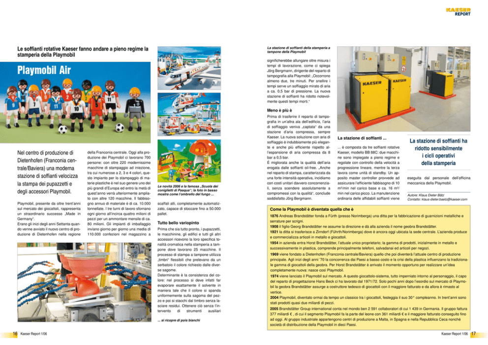 Le soffianti rotative Kaeser fanno andare a pieno regime la stamperia della Playmobil La stazione di soffianti della stamperia a tampone della Playmobil significherebbe allungare oltre misura i tempi di lavorazione, come ci spiega Jörg Bergmann, dirigente del reparto di tampografia alla Playmobil: „Occorrono almeno due, tre minuti. Per snellire i tempi serve un soffiaggio mirato di aria a ca. 0,5 bar di pressione. La nuova stazione di soffianti ha ridotto notevolmente questi tempi morti.“ Playmobil Air Meno è più è Nel centro di produzione di Dietenhofen (Franconia centrale/Baviera) una moderna stazione di soffianti velocizza la stampa dei pupazzetti e degli accessori Playmobil. Playmobil, presente da oltre trent’anni sul mercato dei giocattoli, rappresenta un straordinario successo „Made in Germany“. Erano gli inizi degli anni Settanta quando venne avviato il nuovo centro di produzione di Dietenhofen nella regione della Franconia centrale. Oggi alla produzione dei Playmobil ci lavorano 700 persone: con oltre 220 modernissime macchine di stampaggio ad iniezione, tra cui numerose a 2, 3 e 4 colori, questo impianto per lo stampaggio di materie plastiche è nel suo genere uno dei più grandi d’Europa ed entro la metà di quest’anno verrà ulteriormente ampliato con altre 120 macchine. Il fabbisogno annuo di materiale è di ca. 10.000 tonnellate. I tre turni di lavoro sfornano ogni giorno all’incirca quattro milioni di pezzi per un ammontare mensile di ca. 80 milioni. Gli impianti di imballaggio inviano giorno per giorno una media di 110.000 confezioni nel magazzino a Le novità 2006 e la famosa „Scuola dei coniglietti di Pasqua“; la foto in basso mostra come l’ombrello del fungo ... scaffali alti, completamente automatizzato, capace di stoccare fino a 50.000 pallet. Tutto bello variopinto Prima che sia tutto pronto, i pupazzetti, le macchinine, gli edifici e tutti gli altri accessori ricevono la loro specifica tonalità cromatica nella stamperia a tampone dove lavorano 25 macchine. Il processo di stampa a tampone utilizza „timbri“ flessibili che prelevano da un serbatoio il colore richiesto dalle diverse sagome. Determinante è la consistenza del colore: nel processo si deve infatti far evaporare esattamente il solvente in maniera tale che il colore si spanda uniformemente sulla sagoma del pezzo e poi si stacchi dal timbro senza lasciare residui. Ottenere ciò senza l’intervento di strumenti ausiliari ... si ricopre di pois bianchi 16 Kaeser Report 1/06 Prima di trasferire il reparto di tampografia in un’altra ala dell’edificio, l’aria di soffiaggio veniva „captata“ da una stazione d’aria compressa, sempre Kaeser. La nuova soluzione con aria di soffiaggio è indubbiamente più elegante e anche più efficiente rispetto all’espansione di aria compressa da 8 bar a 0,5 bar. È migliorata anche la qualità dell’aria erogata dalle soffianti oil-free. „Anche nel reparto di stampa, caratterizzata da una forte intensità operativa, incidiamo con costi unitari davvero concorrenziali, senza scendere assolutamente a compromessi con la qualità“, conclude soddisfatto Jörg Bergmann. La stazione di soffianti ... ... è composta da tre soffianti rotative Kaeser, modello BB 88C: due macchine sono impiegate a pieno regime e regolate con controllo della velocità a progressione lineare, mentre la terza lavora come unità di standby. Un apposito master controller provvede ad assicurare l’efficiente fabbisogno di 10 m³/min nel carico base e ca. 16 m³/ min nel carico picco. La manutenzione ordinaria delle affidabili soffianti viene La stazione di soffianti ha ridotto sensibilmente i cicli operativi della stamperia eseguita dal personale dell’officina meccanica della Playmobil. Autore: Klaus Dieter Bätz Contatto: [email protected] Come la Playmobil è diventata quella che è 1876 Andreas Brandstätter fonda a Fürth (presso Norimberga) una ditta per la fabbricazione di guarnizioni metalliche e serrature per scrigni. 1908 il figlio Georg Brandstätter ne assume la direzione e dà alla azienda il nome geobra Brandstätter. 1921 la ditta si trasferisce a Zirndorf (Führth/Norimberga) dove è ancora oggi ubicata la sede centrale. L’azienda produce e commercializza articoli in metallo e giocattoli. 1954 in azienda entra Horst Brandstätter, l’attuale unico proprietario; la gamma di prodotti, inizialmente in metallo e successivamente in plastica, comprende principalmente telefoni, salvadanai ed articoli per negozi. 1969 viene fondato a Dietenhofen (Franconia centrale/Baviera) quello che poi diventerà l’attuale centro di produzione principale. Agli inizi degli anni ’70 la concorrenza dai Paesi a basso costo e la crisi della plastica influenzano la tradizionale gamma di giocattoli della geobra. Per Horst Brandstätter è arrivato il momento opportuno per realizzare un’idea completamente nuova: nasce così Playmobil. 1974 viene lanciato il Playmobil sul mercato. A questo giocattolo-sistema, tutto imperniato intorno al personaggio, il capo del reparto di progettazione Hans Beck ci ha lavorato dal 1971/72. Solo pochi anni dopo l’esordio sul mercato di Playmobil la geobra Brandstätter assurge a costruttore tedesco di giocattoli con il maggiore fatturato e da allora è rimasto al vertice. 2004 Playmobil, diventato ormai da tempo un classico tra i giocattoli, festeggia il suo 30° compleanno. In trent’anni sono stati prodotti quasi due miliardi di pezzi. 2005 Brandstätter Group international conta nel mondo ben 2 591 collaboratori di cui 1 439 in Germania. Il gruppo fattura 377 miliardi € , di cui il segmento Playmobil fa la parte del leone con 361 miliardi € e il maggiore fatturato conseguito fino ad oggi. Al gruppo industriale appartengono centri di produzione a Malta, in Spagna e nella Repubblica Ceca nonché società di distribuzione della Playmobil in dieci Paesi. Kaeser Report 1/06 17