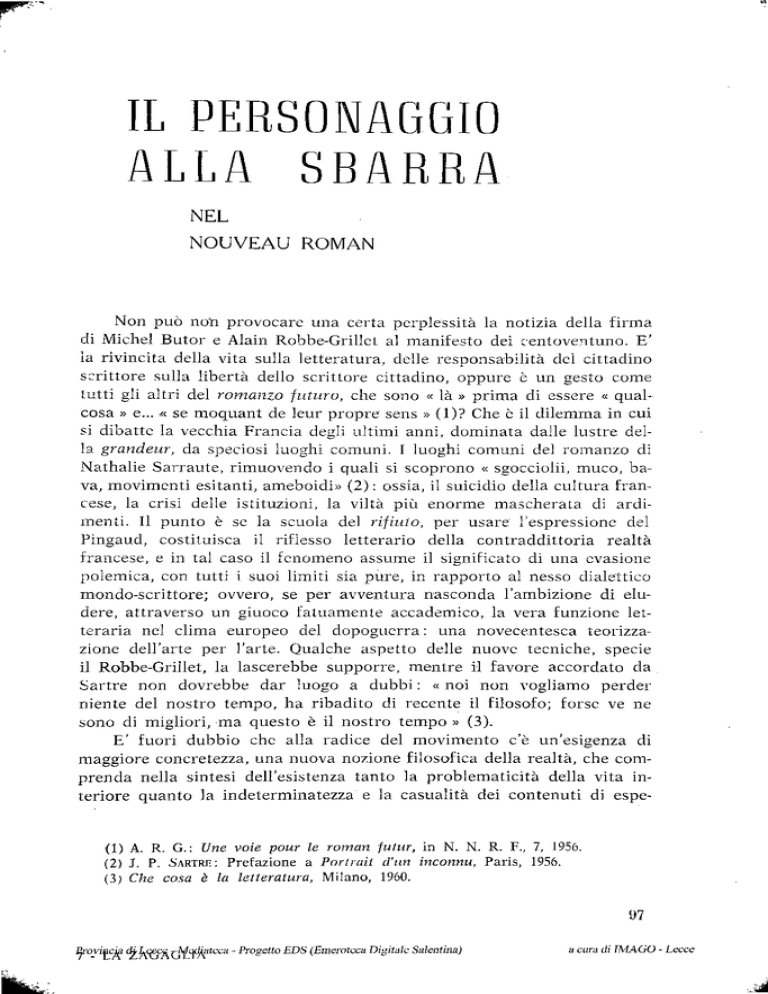 IL PERSOAAGGIO ALLA SBARRA NEL NOUVEAU ROMAN Non può noti provocare una certa perplessità la notizia della firma di Michel Butor e Alain Robbe-Grillet al manifesto dei centoventuno. E' la rivincita della vita sulla letteratura, delle responsabilità del cittadino scrittore sulla libertà dello scrittore cittadino, oppure è un gesto come tutti gli altri del romanzo futuro, che sono « là » prima di essere « qualcosa » e... ,« se moquant de leur propre sens » (1)? Che è il dilemma in cui si dibatte la vecchia Francia degli ultimi anni, dominata dalle lustre della grandeur, da speciosi luoghi comuni. I luoghi comuni del romanzo di Nathalie Sarraute, rimuovendo i quali si scoprono « sgocciolii, muco, bava, movimenti esitanti, ameboidi» (2): ossia, il suicidio della cultura francese, la crisi delle istituzioni, la viltà più enorme mascherata di ardimenti. Il punto è se la scuola del rifiuto, per usare l'espressione del Pingaud, costituisca il riflesso letterario della contraddittoria realtà francese, e in tal caso il fenomeno assume il significato di una evasione polemica, con tutti i suoi limiti sia púre, in rapporto al nesso dialettico mondo-scrittore; ovvero, se per avventura nasconda l'ambizione di eludere, attraverso un giuoco fatuamente accademico, la vera funzione letteraria nel clima europeo del dopoguerra : una novecentesca teorizzazione dell'arte per l'arte. Qualche aspetto delle nuove tecniche, specie il Robbe-Grillet, la lascerebbe supporre, mentre il favore accordato da Sartre non dovrebbe dar luogo a dubbi : « noi non vogliamo perder niente del nostro tempo, ha ribadito di recente il filosofo; forse ve ne sono di migliori, ma questo è il nostro tempo » (3). E' fuori dubbio che alla radice del movimento c'è un'esigenza di maggiore concretezza, una nuova nozione filosofica della realtà, che comprenda nella sintesi dell'esistenza tanto la problematicità della vita interiore quanto la indeterminatezza e la casualità dei contenuti di espe- (1) A. R. G.: Une voie pour le roman futur, in N. N. R. F., 7, 1956. (2) J. P. SARTRE : Prefazione a Portrait d'un inconnu, Paris, 1956. (3) Che cosa è la letteratura, Milano, 1960. 97 _9-oyitck. cihe6cA Gly94(ateca - Progetto EDS (Emeroteca Digitale Salentina) a cura di IM_AGO - Lecce rienza, che sono gli avvenimenti storici e le situazioni sociali : un nuovo realismo, almeno nelle intenzioni. Di qui, le accuse al romanzo tradizionale, le denuncie della psicologia, che temizza e mitizza, del personaggio, esasperato nella dimensione dell'eroe o compresso nella camicia di forza del simbolo, comunque sempre troppo rifinito e ritagliato nell'arte per essere vero nella vita : i rilievi della Sarraute e di Robbe-Grillet vanno da Dostoevskij a Kafka, da Balzac e Flaubert a Camus. Il gran ponte minato, a spiegare la rovina d'oggi, è la Recherche proustiana e 1'Ulixes di Joyce. Più recisa è in questa direzione la condanna della Sarraute, ch'è un po' l'antesignana : « viviamo sommersi in una valanga sempre crescente di opere letterarie che pretendono ancora di essere dei romanzi, in cui un essere senza contorni, indefinibile, inafferrabile e invisibile, un « io » anonimo che è tutto e niente e che il più delle volte non è che un riflesso dello stesso autore, ha usurpato il ruolo del protagonista occupando il posto d'onore. I personaggi che lo circondano, privati di vita propria, non sono altro che visioni, o sogni, incubi, illusioni, riflessi, modalità o dipendenze di quell'io onnipossente » (4). Il che comporta non solo una riforma radicale, stilistica e tecnica, ma un impegno di rapporto dinamico, nello scrittore, tra la sua attività di artista e la realtà storica. Nello stesso saggio, si fa anche giustizia degl'imperativi morali ,del conformismo, che, « presentando ai lettori una realtà ingannevole e mutila, una povera e inerte parvenza, in cui non si ritrova nulla di quanto veramente costituisce la vita, nulla delle vere difficoltà con cui sono alle prese né delle vere lotte che devono affrontare, risvegliano in loro disamore e diffidenza, scoraggiati nel tentativo di trovare nella letteratura quella soddisfazione essenziale che essa sola può dare ». Rimarrebbe da concludere che la chiusura all'uomo, che noi di fatto rinveniamo nei romanzi degli scrittori della scuola, non può essere che strumentale come l'epoche filosofica di Sartre, e quindi, a rigore, la nostra attenzione non dovrebbe essere che rivolta alle novità della tecnica, peraltro notevolmente diversa da scrittore a scrittore, e magari attenderli al varco della resa di quelle stesse tecniche e delle prospettive assegnate al romanzo da venire. Qui noi muoveremo dalle tecniche, ma per tendere soprattutto alla comprensione del fenomeno, limitatamente al rifiuto del « personaggio », e del significato che esso finisce per assumere al momento attuale degli sviluppi del romanzo, non solo francese ma europeo. L'allarme fu dato dalla stessa Sarraute con Tropismes, apparsi nel '39. L'anno del sartriano Le Mur, del suo Erostrato che getta l'ultima zaffata : « Vous serez curieux de savoir ce que peut étre un homme qui (4) L'ere du soupyon, Par. is, 1956. 98 Provincia di Lecce - Mediateca - Progetto EDS (Emeroteca Digitale Salentina) a cura di IMAGO - Lecce n'aime pas les hommes. Eh bien c'est moi »; l'anno dell'Epée de feu di Daniel-Rops, vanamente presaga, perchè la guerra batteva alle porte. Tra gli opposti di una ragione disperata e di una fede inutile, la letteratura di quelle pagine della Sarraute non pretendeva dì avere altro senso che di ripiego, d'indugio, tra ironico e dispettoso, sull'insegnamento più sconcertante degli ultimi decenni : quello di Marcel Proust. E sono pagine cesellate al bulino di un'arte scaltrita, pur nella loro acerbità, allumacature psicologiche, che però disegnano le contorte incertezze di un paesaggio di anime inquiete, battuto dal sesso, ma non sono viziate del vanesio estetismo della « prosa d'arte » italiana, 