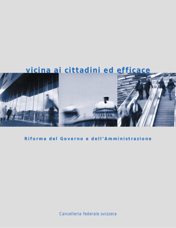 vicina ai cittadini ed efficace Riforma del Governo e dell’Amministrazione Cancelleria federale svizzera Indice Lo Stato in evoluzione 4 La Confederazione: riforme in cantiere 6 Riforma del Governo e dell’Amministrazione 8 Innovazioni nel DFI, nel DFE e nel DFAE 10 Ristrutturazioni nel DDPS e nel DFGP 12 Riforme nel DATEC e nel DFF 14 Nuova politica del personale 16 Bilancio 18 Il processo di riforma continua 20 Impressum Realizzazione Concezione e testo Veste grafica Immagini Edito da Stampa Litografia Cancelleria federale svizzera Dr. Schenker Kommunikation, Berna Punktum, Berna Regula Roost Eduard Rieben (pagg. 6/7), Fritz Friedli (pagg. 10/11) Cancelleria federale svizzera EDMZ Typopress Bern AG La presente pubblicazione (www.admin.ch/ch/rvr) è ottenibile anche in francese e in tedesco. È ottenibile gratuitamente inviando un’etichetta autocollante recante il proprio indirizzo a: BBL EDMZ, 3003 Berna, telefonicamente allo 031 325 50 50, inviando un fax allo 031 325 50 58 o tramite il sito www.admin.ch/edmz (No d’art.104.638.d/f/i). Informazioni più circostanziate sono contenute nel rapporto finale sulla Riforma del Governo e dell’Amministrazione (in lingua tedesca e francese) (www.admin.ch/ch/rvr). Anche esso è ottenibile presso l’EDMZ (No d’art. 104.639.d/f). Introduzione Care lettrici, cari lettori, I cambiamenti sociali, l’apertura dei mercati e le nuove tecnologie modificano profondamente molti aspetti della vita quotidiana. Anche la politica e l’amministrazione sono coinvolte nell’evoluzione in corso e devono adattarsi alle nuove condizioni. La politica crea il quadro necessario affinché l’economia rimanga concorrenziale anche in futuro. Società ed economia necessitano di uno Stato efficace le cui prestazioni siano in grado di rispondere alle alte aspettative dei cittadini, pena la perdita della credibilità. Uno dei fattori chiave in tale contesto è un’amministrazione all’altezza dei tempi. Anche se la Svizzera in questo ambito non deve temere il paragone a livello internazionale, negli ultimi anni pure da noi è aumentata la necessità di riforme. Queste considerazioni hanno indotto il Consiglio federale ad avviare una riforma del Governo e dell’Amministrazione. Partendo dal presupposto che gli alti obiettivi fissati possono essere raggiunti unicamente con l’appoggio di tutti gli interessati e con l’introduzione di una cultura aziendale rinnovata, il Consiglio federale ha coinvolto i collaboratori nel processo di riforma nell’intento di contribuire a superare eventuali timori e di rafforzare l’impegno personale. Il bilancio globale della Riforma del Governo e dell’Amministrazione è nel complesso positivo. E il processo di riforma continua: tra i progetti attualmente in corso si annoverano la riforma della direzione dello Stato e la nuova perequazione finanziaria tra la Confederazione e i Cantoni. Una riforma non consiste solo nella stesura di nuovi organigrammi. A seconda delle finalità nei singoli casi, essa deve sia creare le nuove strutture necessarie, sia unificare o sospendere opportunamente quelle esistenti. Lo Stato deve offrire soluzioni ai problemi dei cittadini, non viceversa. Ottobre 2000 Kaspar Villiger Consigliere federale Annemarie Huber-Hotz Cancelliera federale 4 Mutamenti sociali e tecnologici rappresentano nuove sfide per lo Stato Lo Stato in evoluzione Il mondo cambia In tutto il mondo si assiste all’apertura dei mercati e alla liberalizzazione dei vari rami dell’economia. Le tecnologie di informazione e telecomunicazione si sviluppano a ritmo serrato e la mobilità di persone, capitali e merci ha assunto dimensioni sconosciute fino a poco tempo fa. Servizi e informazioni sono disponibili ovunque e in ogni momento. Aumentano i legami globali. Tra i vari Stati si intensifica la concorrenza per garantire la competitività dei propri mercati. Questi cambiamenti comportano nuove sfide anche per la Svizzera e pongono economia e amministrazione pubblica di fronte a nuovi impegni. La Confederazione, i Cantoni e i Comuni sono chiamati ad agire. Fattori decisivi per le riforme istituzionali Economia Globalizzazione, concorrenza per la competitività dei propri mercati Mobilità di capitali, merci e persone Nuove tecnologie Politica Posizione internazionale della Svizzera Legittimazione statale Identità nazionale Società Evoluzione demografica Cambiamenti culturali Esigenze più elevate del pubblico 5 Di fronte a quest’evoluzione, in una prima fase, politica e amministrazione hanno ampliato notevolmente la gamma di prestazioni statali. Tuttavia, dato che le entrate non riuscivano a coprire le uscite, il deficit statale aumentò drasticamente: nel corso di pochi anni il debito della Confederazione raddoppiò e raggiunse 100 miliardi di franchi. Entrate e spese della Confederazione 1990 – 2000 50 000 40 000 30 000 1990 1991 1992 1993 1994 1995 1996 1997 1998 1999 2000 Entrate in milioni di franchi Spese in milioni di franchi Evoluzione dell’indebitamento della Confederazione 1990 – 2000 Debito in milioni di franchi 110 000 90 000 70 000 50 000 30 000 1990 1991 1992 1993 1994 1995 1996 1997 1998 1999 2000 Una sfida per lo Stato Questa evoluzione mette in pericolo l’attrattiva della Svizzera quale piazza finanziaria, economica e industriale. Nella politica e nell’amministrazione ci si rende conto che non è possibile ampliare illimitatamente le proprie prestazioni. Tuttavia la ricerca di altre soluzioni non implica la fine dell’azione dello Stato. Essa porta invece a ridefinire il rapporto tra Stato e società e tra politica e amministrazione secondo i principi della valorizzazione delle funzioni di base dello Stato, di una maggiore modestia e di una maggiore vicinanza al cittadino. Emergono nuove forme di collaborazione, ad esempio sotto forma della Public-Private-Partnership. 6 La Confederazione si prepara per il futuro La Confederazione: riforme in cantiere Per reagire a questi mutamenti, la Confederazio