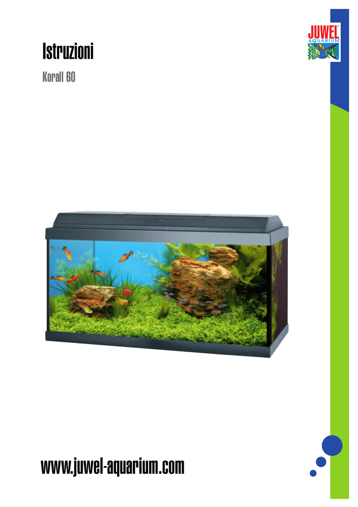 Istruzioni Korall 60 www.juwel-aquarium.com Introduzione Congratulazioni per aver scelto un acquario JUWEL Aquarium. Grazie per la fiducia accordataci. I nostri prodotti vengono sempre costruiti con la massima accuratezza e con l'impiego di tecniche d'avanguardia. Questi progetti sono il risultato di 4 decenni di esperienza e di test scientifici nella produzione degli acquari. Attenzione: Si prega di leggere accuratamente tutti i capitoli del presente manuale d'uso e verificare la completezza della fornitura del vostro acquario JUWEL. Solo così potete mettere in funzione l'acquario senza correre alcun rischio. Tutte le parti elettriche devono essere collegate alla presa di corrente solo alla fine del montaggio. Si prega di osservare le avvertenze sulla sicurezza nonché i consigli per quanto riguarda la manutenzione e la cura di tutti i componenti. Queste istruzioni per l'uso sono state compilate con la massima accuratezza per fornirvi informazioni corrette e dettagliate. Per eventuali errori di stampa e altri tipi di errori non possiamo però assumerci alcuna responsabilità. I dati tecnici sono da ritenersi indicativi. Ci riserviamo il diritto di apportare modifiche tecniche. Staccare dalle prese di corrente la spina di tutti gli apparecchi funzionanti sott'acqua prima che vengano a contatto con l'acqua. Attenzione: Se si impiegano pietre porose o dispositivi di aerazione simili, fare attenzione che vengano inseriti al centro dell'acquario. Quando si impiegano questi dispositivi è possibile che si formino spruzzi o condensa d'acqua sulla lampada che potrebbe scivolare lungo la parete esterna dell'acquario. Se dovesse presentarsi questo fenomeno, non significa che il prodotto è difettoso. Non trasportare l'acquario quando è pieno d'acqua. Nella manutenzione dell'acquario si deve prestare attenzione affinché le incollature non vengano danneggiate. Per la pulizia dell'acquario non si devono utilizzare sostanze tossiche. Avvertenze sulla sicurezza: Questo apparecchio non è adatto per essere utilizzato da persone (bambini inclusi) con limitate capacità fisiche, sensoriali e intellettuali o con poca esperienza e/o poche conoscenze, a meno che non vengano sorvegliate dalle persone addette alla loro sicurezza o non ricevano da loro istruzioni su come usare tale apparecchio. I bambini devono essere sorvegliati per accertarsi che non usino l'apparecchio come un giocattolo. Impiego solo con salvavita, max. 30mA. Le spine degli apparecchi elettrici non devono inumidirsi. Collegare la spina alla presa di corrente ad un altezza tale da formare formare un'ansa nel cavo di alimentazione che consenta il gocciolamento dell'acqua. 2 Collocazione Nella produzione dei nostri acquari JUWEL vengono applicati i metodi più avanzati e l'imballaggio viene eseguito con la massima accuratezza, in modo da evitare l'insorgere di eventuali danni. Il vostro acquario è stato sottoposto a un lungo trasporto. Pertanto consigliamo di controllarne l'ermeticità in un luogo adatto riempiendolo d'acqua. In seguito scegliete il luogo dove collocare l'acquario. Questo posto deve essere piano e sufficientemente robusto ed avere nei pressi una presa di corrente. Si prega di evitare un luogo troppo luminoso e fare attenzione che l'acquario non venga esposto alla luce diretta del sole. L'acquario potrebbe riscaldarsi ulteriormente e la conseguenza potrebbe essere una crescita eccessiva delle alghe. Collocare l'acquario su un mobile adatto per acquari JUWEL. Questi è protetto dagli spruzzi d'avere ed è in sintonia con l'acquario sia nella decorazione, che nelle misure e nella stabilità. Accertarsi che il mobile sia in posizione orizzontale; eventualmente controllarlo con una livella a bolla d'aria. Il vostro acquario JUWEL ha incollato sotto un telaio di sicurezza. Collocare l'acquario con il telaio inferiore direttamente sul mobile. Non utilizzare ulteriori basi di appoggio. Peso dell'acquario pieno d'acqua in kg: 60 Bioflow_Mini_zu Bioflow_Mini_spreng Compac Il filtro JUWEL Bioflow Mini Il sistema di filtraggio JUWEL Bioflow Mini è un sistema biologico molto efficiente con componenti in perfetta sintonia tra di loro. Il montaggio del filtro nell'acquario rende superflui i tubi di collegamento ed esclude qualsiasi perdita. La resa della pompa non viene ridotta da raccordi, tubi di aspirazione o simili. La pompa e la sua resa sono appositamente studiate affinché il filtraggio biologico sia garantito da un flusso ottimale attraverso i materiali filtranti. La struttura del sistema di filtraggio consente di accedere rapidamente ai singoli componenti, quali pompa ed elemento di filtraggio, per cui la pulizia e la manutenzione del sistema di filtraggio risultano molto comodi. 3 Bioflow_Mini_zu Bioflow_Mini_spreng Compact_fein_bunt Messa in funzione del filtro JUWEL Bioflow Mini Si dovrebbe preparare il filtro al funzionamento prima di allestire l'acquario, ma non collegare ancora i componenti elettrici alle prese di corrente. 2 Il filtro JUWEL Bioflow Mini è composto da: - pompa - scatola del filtro 4 - 1 spugna filtrante blu - 4 ventose - scarico Prima di utilizzare il filtro per la prima volta, aprire il coperchio del filtro inferiore e superiore ed estrarre la spugna filtrante e la pompa per sciacquare tutti i componenti in acqua corrente. Korallux Reinserire la spugna filtrante e la pompa nella scatola del filtro e chiudere il coperchio del filtro. Fissare il filtro mediante le ventose nell'angolo posteriore destro dell'acquario. Il bordo superiore della scatola del filtro dovrebbe trovarsi 1 cm sotto la superficie dell'acqua per ottenere un buon flusso nell'acquario. Applicare con attenzione la bocchetta di uscita dall'esterno, attraverso l'apertura, sullo scarico della pompa e accertarsi che sia ben fissata. Il filtro JUWEL Bioflow Mini adesso è pronto a funzionare. Bioflow_Mini_zu Bioflow_Mini_spreng Compact_fein_bunt Si osservi che il sistema di aggio filtr impiega circa 14 giorni affinché nelle spugne blu si fo