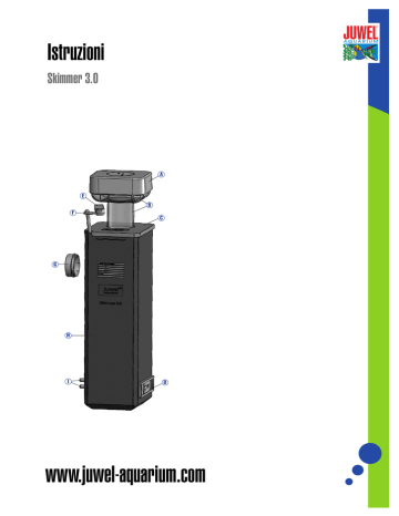 Istruzioni Skimmer 3.0 A E B F C G H I D www.juwel-aquarium.com Introduzione Congratulazioni per aver scelto un acquario JUWEL Aquarium. Grazie per la fiducia accordataci. I nostri prodotti vengono sempre costruiti con la massima accuratezza e con l'impiego di tecniche d'avanguardia. Questi progetti sono il risultato di 4 decenni di esperienza e di test scientifici nella produzione degli acquari. Avvertenze sulla sicurezza: Questo apparecchio non è adatto per essere utilizzato da persone (bambini inclusi) con limitate capacità fisiche, sensoriali e intellettuali o con poca esperienza e/o poche conoscenze, a meno che non vengano sorvegliate dalle persone addette alla loro sicurezza o non ricevano da loro istruzioni su come usare tale apparecchio. I bambini devono essere sorvegliati per accertarsi che non usino l'apparecchio come un giocattolo. Staccare dalle prese di corrente le spine di tutti gli apparecchi funzionanti sott'acqua prima che vengano a contatto con l'acqua. Impiego solo con salvavita, max. 30mA. Le spine degli apparecchi elettrici non devono inumidirsi. Collegare la spina alla presa di corrente ad un altezza tale da formare formare un'ansa nel cavo di alimentazione che consenta il gocciolamento dell'acqua. A) Coperchio coppa della schiuma B) Coppa della schiuma C) Coperchio alloggiamento Skimmer D) Regolatore a cursore scarico acqua E) Regolatore dell'aria F) Tubo dell'aria G) Supporto H) Alloggiamento Skimmer I) Distanziatore 2 JUWEL Skimmer 3.0 Juwel Skimmer 3.0 combina i vantaggi di un prodotto per la schiumatura interna, con il quale l'acqua non lascia l'acquario, con una forma compatta e un'alta capacità di schiumatura. La pompa integrata produce una miscela di aria-acqua fino a 1.500 l/h e garantisce un'efficace schiumatura proteica per acquari ad acqua marina pari a un volume di 100 500 litri. Juwel Skimmer 3.0 non serve però per sostituire un sistema di filtraggio nell'acquario con acqua marina. Nella schiumatura si sfrutta il fatto che si accumulano, soprattutto in acqua salata, molte sostanze cosiddette di superficie nell'interfaccia tra acqua e aria. Questo include le proteine e i loro primi stadi di riduzione (contenenti elementi indesiderati quali azoto e fosforo) ma anche piccolissime particelle di sporcizia (solidi). Montaggio negli acquari JUWEL Juwel Skimmer è previsto per il montaggio nella linea di acquariJuwel Rio, Lido, Vision e Trigon. In questi acquari Juwel, l'apertura per lo Skimmer è già presente e sigillata con un coperchio. Rimuovere questo coperchio, che chiude la copertura. Nota: Set coperchietti per JUWEL Skimmer Se la copertura del vostro acquario JUWEL non dovesse disporre di un supporto adeguato per lo skimmer, si consiglia di rivolgersi al proprio rivenditore specializzato. Qui si può acquistare il set di coperchietti adeguato per lo skimmer come pezzo di ricambio originale JUWEL. Installazione del supporto dello Skimmer Lo Skimmer viene installato e fissato mediante il supporto in dotazione. In tal modo ne viene assicurata la corretta posizione all'interno dell'acquario e quindi risultati ottimali nella schiumatura. L'acquario dovrebbe essere svuotato finché non è possibile asciugare i vetri. Per raggiungere la giusta posizione utilizzare la sagoma in dotazione per posizionare il supporto. 1. Tenere dapprima la sagoma lungo le linee indicate e orientarla come indicato in basso. A 2. Modelli di acquario RIO, LIDO, VISION: appendere la sagoma dall'interno sopra il bordo della lastra laterale sinistra e orientarla rispetto all'angolo posteriore sinistro (vedi figura A). 2. Modello di acquario TRIGON: 25 cm appendere la sagoma dall'interno sopra il bordo della lastra laterale sinistra a una distanza di 25 cm dal bordo esterno posteriore del telaio (vedi figura B). 3. Per evitare che la sagoma possa scivolare la si dovrebbe fissare con un nastro adesivo. B 4. Dopo l'applicazione della sagoma si deve applicare una quantità sufficiente della colla in dotazione JUWEL Conexo (cod.prod. 88355) sul lato esterno del supporto. 5. Incollare il supporto, attraverso l'apertura prevista sulla sagoma, dall'interno contro la lastra dell'acquario, e lasciarlo asciugare per almeno 48 ore. 6. Rimuovere la sagoma al termine del tempo di asciugatura. 48 h 3 Preparazione dello Skimmer 3 - Togliere il coperchio e il collettore di schiuma e rimuovere la parete divisoria dalla vasca. Verificare la corretta posizione orizzontale della spugna sulla griglia. Inserire la pompa nella sede prevista e far passare il cavo di alimentazione attraverso il passacavo inferiore della parete (fig. 1). 3 Inserire il Diffusor con l'adattatore angolare nello scarico della pompa. Collegare il tubo dell'aria nel Diffusor ed introdurre questo nella guida superiore del tubo della parete divisoria (fig. 2). 3 - Mettere il silenziatore tra i due tubi dell'aria e il regolatore dell'aria all'estremità del tubo (fig. 3). - Inserire la parete divisoria nell'alloggiamento (fig. 4) e montare i distanziali sull'alloggiamento (fig. 5). 2 2 2 - Installare il collettore di schiuma e il coperchio della vasca (fig. 6). 1 1 4 6 5 4 Installazione dello Skimmer 1. Inserire lo Skimmer con l'apertura rotonda sul supporto fisso incollato. 2. Installare il coperchio della lampada con l'apertura presente sopra lo Skimmer. 3. Inserire il tubo della coppa della schiuma nell'apertura del coperchio della lampada sopra il collettore della schiuma. 4. Chiudere il collettore della schiuma con il coperchio. Se si vuole chiudere lo spazio tra lo Skimmer e la lastra dell'acquario, passare una striscia di silicone come indicato in figura. In tal modo si evita che i pesci possano andare a nuotare nell'intercapedine. 5 Funzionamento dello Skimmer Collegare il cavo di alimentazione in modo che il vostro skimmer (schiumatore di proteine) sia pronto a funzionare. Ora aprire il regolatore dell'aria ed anche il regolatore a cursore dello scarico dell'acqua finchè la schiuma non raggiunge la metà del gruppo della 