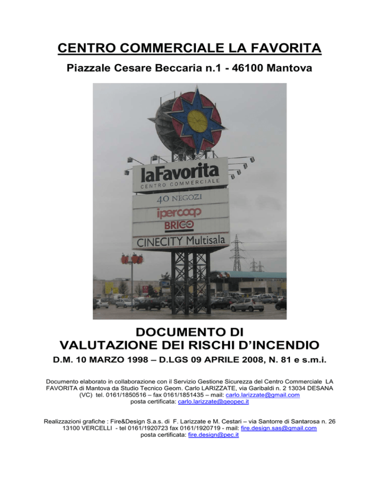 CENTRO COMMERCIALE LA FAVORITA Piazzale Cesare Beccaria n.1 - 46100 Mantova DOCUMENTO DI VALUTAZIONE DEI RISCHI D’INCENDIO D.M. 10 MARZO 1998 – D.LGS 09 APRILE 2008, N. 81 e s.m.i. Documento elaborato in collaborazione con il Servizio Gestione Sicurezza del Centro Commerciale LA FAVORITA di Mantova da Studio Tecnico Geom. Carlo LARIZZATE, via Garibaldi n. 2 13034 DESANA (VC) tel. 0161/1850516 – fax 0161/1851435 – mail: [email protected] posta certificata: [email protected] Realizzazioni grafiche : Fire&Design S.a.s. di F. Larizzate e M. Cestari – via Santorre di Santarosa n. 26 13100 VERCELLI - tel 0161/1920723 fax 0161/1920719 - mail: [email protected] posta certificata: [email protected] Documento di Valutazione Rischi REVISIONI E/O AGGIORNAMENTI EDIZIONE DATA 0 03 gennaio 2015 1 30 settembre 2015 2 18 gennaio 2016 DESCRIZIONE FIRMA(datore di lavoro) Impianto Aggiornamento nominativi addetti vigilanza Aggiornamento nominativi Squadra Emergenza / implementazione rischi 2 Documento di Valutazione Rischi ASPETTI GENERALI 1. PREMESSA La valutazione dei rischi è uno strumento finalizzato alla programmazione delle misure di protezione e prevenzione, quindi, alla più generale organizzazione della prevenzione aziendale volta a salvaguardare la salute e la sicurezza dei lavoratori. Il D. Lgs. 9 aprile 2008, n. 81 ribadisce con ancor più forza l'obbligo della valutazione di tutti i rischi per la sicurezza e la salute dei lavoratori, con la conseguente elaborazione del documento previsto dall'articolo 28. La valutazione riguarderà anche la scelta delle attrezzature di lavoro e delle sostanze o dei preparati chimici impiegati, nonchè la sistemazione dei luoghi di lavoro, tutti i rischi ivi compresi quelli riguardanti gruppi di lavoratori esposti a rischi particolari, tra cui anche quelli collegati allo stress lavoro-correlato e quelli riguardanti le lavoratrici in stato di gravidanza, secondo quanto previsto dal decreto legislativo 26 marzo 2001, n. 151, nonchè quelli connessi alle differenze di genere, all'età, alla provenienza da altri Paesi. Secondo l'art. 28 del D. Lgs. n.81/08 il documento redatto a conclusione della valutazione, deve avere data certa e contenere: • una relazione sulla valutazione di tutti i rischi per la sicurezza e la salute durante l'attività lavorativa, nella quale siano specificati i criteri adottati per la valutazione stessa; • l'indicazione delle misure di prevenzione e di protezione attuate e dei dispositivi di protezione individuali adottati • il programma delle misure ritenute opportune per garantire il miglioramento nel tempo dei livelli di sicurezza • l'individuazione delle procedure per l'attuazione delle misure da realizzare, nonchè dei ruoli dell'organizzazione aziendale che vi debbono provvedere, a cui devono essere assegnati unicamente soggetti in possesso di adeguate competenze e poteri • l'indicazione del nominativo del responsabile del servizio di prevenzione e protezione, del rappresentante dei lavoratori per la sicurezza o di quello territoriale e del medico competente che ha partecipato alla valutazione del rischio • l'individuazione delle mansioni che eventualmente espongono i lavoratori a rischi specifici che richiedono una riconosciuta capacità professionale, specifica esperienza, adeguata formazione e addestramento Nel ns. caso è fondamentale tenere presente che, il Consorzio non presta direttamente attività operativa tramite lavoratori addetti dipendenti; tutti i servizi gestiti e coordinati dal “Consorzio”, sono affidati in appalto a ditte esterne (fornitori di servizi), aventi tutti i requisiti professionali richiesti per lo svolgimento delle specifiche mansioni operative. Quindi non ci troviamo di fronte ad un datore di lavoro vero e proprio, ma avendo il Consorzio strumenti e macchinari sui quali interagiscono 3 Documento di Valutazione Rischi terzi per le normali operazioni di conduzione e manutenzione, si ritiene comunque necessario procedere come indicato nel presente documento. 1.1 Utilizzazione e consultazione Il documento sarà utilizzato come guida da tutti i soggetti facenti parte del sistema organizzativo della sicurezza per applicare al meglio tutte le misure da adottare durante l’attività della Galleria Commerciale in relazione ai fattori di rischio presenti. Tutti saranno tenuti alla piena osservanza ed applicazione delle misure di sicurezza riportate nel presente documento. Le misure, i dispositivi di protezione individuale e le cautele di sicurezza sono: - tassativamente obbligatorie - da impiegare correttamente e continuamente - da osservare personalmente. Il documento dovrà essere custodito presso la Galleria Commerciale alla quale si riferisce la valutazione dei rischi (art. 29 comma 4, D. Lgs. 81/08). 1.2 Revisione Il DVR dovrà essere sottoposto a revisione, ad opportuni intervalli di tempo, per assicurarne l'adeguatezza e l'efficacia nel tempo. Sarà pertanto necessario rielaborare una valutazione dei rischi, ogni qualvolta si introduca un cambiamento tale da modificare la percezione dei rischi sul luogo di lavoro, ad esempio quando viene avviato un nuovo sistema di lavorazione, vengono adottati nuovi agenti chimici e nuove attrezzature per lo svolgimento delle operazioni di manutenzione e/o nuove realizzazioni. L'art. 29 comma 3 del D. Lgs. 81/08 ribadisce, inoltre, che la valutazione dei rischi debba essere aggiornata anche in occasione di modifiche del processo produttivo o dell'organizzazione del lavoro, significative ai fini della salute e della sicurezza dei lavoratori, o in relazione al grado di evoluzione della tecnica, della prevenzione e della protezione o a seguito di infortuni significativi o quando i risultati della sorveglianza sanitaria ne evidenzino la necessità. A seguito di tale rielaborazione, le misure di prevenzione debbono essere aggiornate. 1.3 Definizioni Ricorrenti Si adottano, nel presente documento, le seguenti definizioni, secondo l'art. 2 D. Lgs. 81/08: 