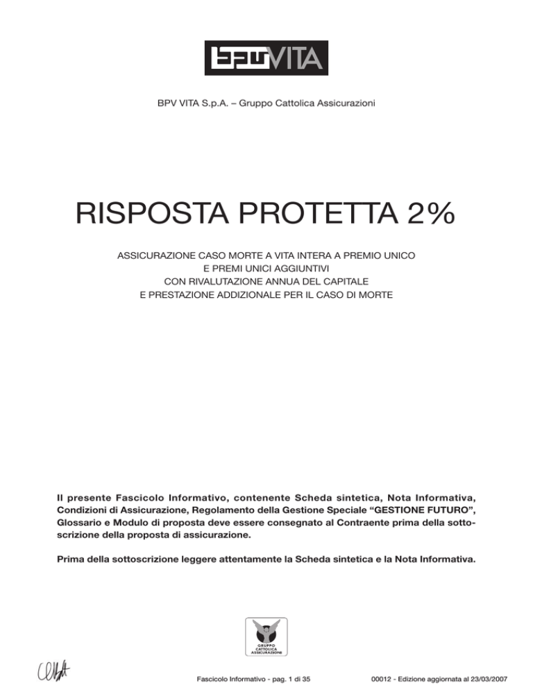 BPV VITA S.p.A. – Gruppo Cattolica Assicurazioni RISPOSTA PROTETTA 2% ASSICURAZIONE CASO MORTE A VITA INTERA A PREMIO UNICO E PREMI UNICI AGGIUNTIVI CON RIVALUTAZIONE ANNUA DEL CAPITALE E PRESTAZIONE ADDIZIONALE PER IL CASO DI MORTE Il presente Fascicolo Informativo, contenente Scheda sintetica, Nota Informativa, Condizioni di Assicurazione, Regolamento della Gestione Speciale “GESTIONE FUTURO”, Glossario e Modulo di proposta deve essere consegnato al Contraente prima della sottoscrizione della proposta di assicurazione. Prima della sottoscrizione leggere attentamente la Scheda sintetica e la Nota Informativa. Fascicolo Informativo - pag. 1 di 35 00012 - Edizione aggiornata al 23/03/2007 SCHEDA SINTETICA ATTENZIONE: LEGGERE ATTENTAMENTE LA NOTA INFORMATIVA PRIMA DELLA SOTTOSCRIZIONE DEL CONTRATTO La presente Scheda sintetica non sostituisce la Nota Informativa. Essa mira a dare al Contraente un’informazione di sintesi sulle caratteristiche, sulle garanzie, sui costi e sugli eventuali rischi presenti nel contratto. 1. Informazioni generali 1.a) Compagnia BPV VITA S.p.A. – Gruppo Cattolica Assicurazioni. 1.b) Denominazione del contratto “RISPOSTA PROTETTA 2%”. 1.c) Tipologia del contratto Le prestazioni assicurate dal presente contratto sono contrattualmente garantite dalla Compagnia e si rivalutano annualmente in base al rendimento di una gestione interna separata di attivi. 1.d) Durata La durata del contratto coincide con la vita dell’Assicurato. È possibile esercitare il diritto di riscatto trascorso un anno dalla data di decorrenza degli effetti del contratto. 1.e) Pagamento dei premi A fronte delle prestazioni previste dal contratto, il Contraente versa un premio unico fissato nel suo ammontare all’atto della sottoscrizione della proposta di assicurazione. L’ammontare minimo del premio unico è di 5.000,00 Euro. Il Contraente potrà versare eventuali successivi premi unici aggiuntivi, di ammontare minimo pari a 1.000,00 Euro. 2. Caratteristiche del contratto Il contratto è una polizza assicurativa sulla vita in cui le prestazioni si incrementano in base al rendimento di una gestione interna separata. Per la comprensione del meccanismo di partecipazione agli utili si rinvia al Progetto esemplificativo dello sviluppo delle prestazioni e del valore di riscatto contenute nella sezione F della Nota Informativa. La Compagnia è tenuta a consegnare il Progetto esemplificativo elaborato in forma personalizzata al più tardi al momento in cui il Contraente è informato che il contratto è concluso. Fascicolo Informativo - pag. 2 di 35 00012 - Edizione aggiornata al 23/03/2007 3. Prestazioni assicurative e garanzie offerte Il contratto prevede le seguenti tipologie di prestazioni: Prestazioni in caso di decesso dell’Assicurato Definizione Descrizione della prestazione Caso morte a vita intera In caso di decesso dell’Assicurato, in qualsiasi epoca avvenga, il pagamento del capitale assicurato ai Beneficiari designati in polizza dal Contraente. Opzioni contrattuali Definizione Descrizione della prestazione Opzione da capitale in rendita vitalizia La conversione del valore di riscatto (o di una parte di esso) in una rendita vitalizia pagabile fino a che l’Assicurato è in vita. Opzione da capitale in rendita certa e poi vitalizia La conversione del valore di riscatto (o di una parte di esso) in una rendita pagabile in modo certo per i primi 5 o 10 anni, a scelta del Contraente, e successivamente fino a che l’Assicurato è in vita. La conversione del valore di riscatto (o di una parte di esso) in una rendita vitalizia pagabile fino al decesso dell’Assicurato e successivamente reversibile, in misura totale o parziale, a favore di una persona fino a che questa è in vita. Opzione da capitale in rendita reversibile Il contratto prevede un tasso annuo di rendimento minimo garantito del 2,00% e una garanzia di consolidamento annuale delle prestazioni. Le partecipazioni agli utili eccedenti la misura minima contrattualmente garantita, una volta dichiarate al Contraente, risultano definitivamente acquisite sul contratto. In caso di riscatto il Contraente sopporta il rischio di ottenere un importo inferiore ai premi versati. Maggiori informazioni sono fornite in Nota Informativa alla sezione B. In ogni caso le coperture assicurative ed i meccanismi di rivalutazione delle prestazioni sono regolati dagli Artt. 11 e 13 delle Condizioni di Assicurazione. 4. Costi La Compagnia, al fine di svolgere l’attività di collocamento e di gestione dei contratti e di incasso dei premi, preleva dei costi secondo la misura e le modalità dettagliatamente illustrate in Nota Informativa alla sezione D. I costi gravanti sui premi e quelli prelevati dalla gestione interna separata riducono l’ammontare delle prestazioni. Per fornire un’indicazione complessiva dei costi che gravano a vario titolo sul contratto, viene di seguito riportato, secondo criteri stabiliti dall’ISVAP, l’indicatore sintetico “Costo percentuale medio annuo”. Il “Costo percentuale medio annuo” indica di quanto si riduce ogni anno, per effetto dei costi, il potenziale tasso di rendimento del contratto rispetto a quello di una analoga operazione che ipoteticamente non fosse gravata da costi. A titolo di esempio, se per una durata del contratto pari a 15 anni il “Costo percentuale medio annuo” del 10° anno è pari all’1%, significa che i costi complessivamente gravanti sul contratto in caso di riscatto al 10° anno riducono il potenziale tasso di rendimento nella misura dell’1% per ogni anno di durata del rapporto assicurativo. Il “Costo percentuale medio annuo” del 15° anno indica di quanto si riduce ogni anno, per effetto dei costi, il potenziale tasso di rendimento in caso di mantenimento del contratto fino a scadenza. Il predetto indicatore ha una valenza orientativa in quanto calcolato su livelli prefissati di premio e durate ed impiegando un’ipotesi di rendimento della gestione interna sep