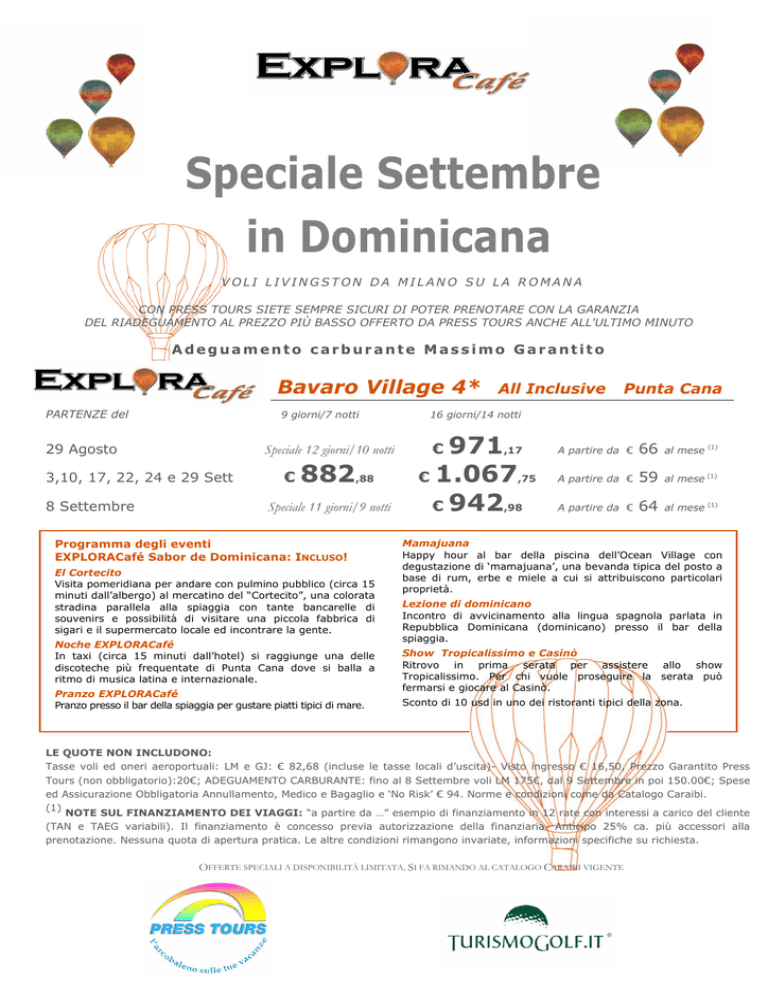 Speciale Settembre in Dominicana VOLI LIVINGSTON DA MILANO SU LA ROMANA CON PRESS TOURS SIETE SEMPRE SICURI DI POTER PRENOTARE CON LA GARANZIA DEL RIADEGUAMENTO AL PREZZO PIÙ BASSO OFFERTO DA PRESS TOURS ANCHE ALL'ULTIMO MINUTO Adeguamento carburante Massimo Garantito Bavaro Village 4* PARTENZE del 9 giorni/7 notti 29 Agosto Speciale 12 giorni/10 notti 3,10, 17, 22, 24 e 29 Sett 8 Settembre € 882 ,88 Speciale 11 giorni/9 notti Programma degli eventi EXPLORACafé Sabor de Dominicana: INCLUSO! El Cortecito Visita pomeridiana per andare con pulmino pubblico (circa 15 minuti dall’albergo) al mercatino del “Cortecito”, una colorata stradina parallela alla spiaggia con tante bancarelle di souvenirs e possibilità di visitare una piccola fabbrica di sigari e il supermercato locale ed incontrare la gente. Noche EXPLORACafé In taxi (circa 15 minuti dall’hotel) si raggiunge una delle discoteche più frequentate di Punta Cana dove si balla a ritmo di musica latina e internazionale. Pranzo EXPLORACafé Pranzo presso il bar della spiaggia per gustare piatti tipici di mare. All Inclusive Punta Cana 16 giorni/14 notti 971 € 1.067 € 942 € ,17 ,75 ,98 A partire da € 66 al mese (1) A partire da € 59 al mese (1) A partire da € 64 al mese (1) Mamajuana Happy hour al bar della piscina dell’Ocean Village con degustazione di ‘mamajuana’, una bevanda tipica del posto a base di rum, erbe e miele a cui si attribuiscono particolari proprietà. Lezione di dominicano Incontro di avvicinamento alla lingua spagnola parlata in Repubblica Dominicana (dominicano) presso il bar della spiaggia. Show Tropicalissimo e Casinò Ritrovo in prima serata per assistere allo show Tropicalissimo. Per chi vuole proseguire la serata può fermarsi e giocare al Casinò. Sconto di 10 usd in uno dei ristoranti tipici della zona. LE QUOTE NON INCLUDONO: Tasse voli ed oneri aeroportuali: LM e GJ: € 82,68 (incluse le tasse locali d’uscita)- Visto ingresso € 16,50, Prezzo Garantito Press Tours (non obbligatorio):20€; ADEGUAMENTO CARBURANTE: fino al 8 Settembre voli LM 175€, dal 9 Settembre in poi 150.00€; Spese ed Assicurazione Obbligatoria Annullamento, Medico e Bagaglio e ‘No Risk’ € 94. Norme e condizioni come da Catalogo Caraibi. (1) NOTE SUL FINANZIAMENTO DEI VIAGGI: “a partire da …” esempio di finanziamento in 12 rate con interessi a carico del cliente (TAN e TAEG variabili). Il finanziamento è concesso previa autorizzazione della finanziaria. Anticipo 25% ca. più accessori alla prenotazione. Nessuna quota di apertura pratica. Le altre condizioni rimangono invariate, informazioni specifiche su richiesta. OFFERTE SPECIALI A DISPONIBILITÀ LIMITATA. SI FA RIMANDO AL CATALOGO CARAIBI VIGENTE Speciale Settembre in Dominicana VOLO LIVINGSTON DA MILANO SU LA ROMANA CON PRESS TOURS SIETE SEMPRE SICURI DI POTER PRENOTARE CON LA GARANZIA DEL RIADEGUAMENTO AL PREZZO PIÙ BASSO OFFERTO DA PRESS TOURS ANCHE ALL'ULTIMO MINUTO Adeguamento carburante Massimo Garantito Gran Bahia Principe Punta Cana 5* All Inclusive PARTENZE del 29 Agosto 3,10, 17, 22, 24 e 29 Sett 8 Settembre 9 giorni/ 7 notti Speciale 12 giorni/10 notti € 953 ,47 Speciale 11 giorni/9 notti Punta Cana 16 giorni/ 14 notti 1.073 € 1.202 € 1.033 € ,77 A partire da € 73 al mese (1) ,69 A partire da € 64 al mese (1) ,99 A partire da € 68 al mese (1) Barcelò Bavaro Beach & Caribe 4* All Inclusive PARTENZE del 29 Agosto 3,10, 17, 22, 24 e 29 Sett 8 Settembre 9 giorni/ 7 notti Speciale 12 giorni/10 notti € 890 ,55 Speciale 11 giorni/9 notti Punta Cana 16 giorni/ 14 notti 990 € 1.099 € 968 € ,47 ,68 ,43 A partire da € 66 al mese (1) A partire da € 59 al mese (1) A partire da € 66 al mese (1) Viva Wyndham Dominicus Beach 4* All Inclusive PARTENZE del 29 Agosto 3,10, 17, 22, 24 e 29 Sett 8 Settembre 9 giorni/ 7 notti Speciale 12 giorni/10 notti € 847 ,13 Speciale 11 giorni/9 notti 16 giorni/ 14 notti 921 € 1.000 € 896 € ,64 ,13 ,97 A partire da € 61 al mese (1) A partire da € 57 al mese (1) A partire da € 59 al mese (1) Hotel Dominican Bay 3* All Inclusive PARTENZE del 29 Agosto 3,10, 17, 22, 24 e 29 Sett 8 Settembre 9 giorni/ 7 notti Speciale 12 giorni/10 notti € 796 ,94 Speciale 11 giorni/9 notti Bayahibe Boca Chica 16 giorni/ 14 notti 848 € 904 € 831 € ,52 A partire da € 57 al mese (1) ,58 A partire da € 52 al mese (1) ,65 A partire da € 55 al mese (1) LE QUOTE NON INCLUDONO: Tasse voli ed oneri aeroportuali: LM e GJ: € 82,68 (incluse le tasse locali d’uscita)- Visto ingresso € 16,50, Prezzo Garantito Press Tours (non obbligatorio): 20€; ADEGUAMENTO CARBURANTE: fino al 8 Settembre voli LM 175€, dal 9 Settembre in poi 150.00€; Spese ed Assicurazione Obbligatoria Annullamento, Medico e Bagaglio e ‘No Risk’ € 94. Norme e condizioni come da Catalogo Caraibi. (1) NOTE SUL FINANZIAMENTO DEI VIAGGI: “a partire da …” esempio di finanziamento in 12 rate con interessi a carico del cliente (TAN e TAEG variabili). Il finanziamento è concesso previa autorizzazione della finanziaria. Anticipo 25% ca. più accessori alla prenotazione. Nessuna quota di apertura pratica. Le altre condizioni rimangono invariate, informazioni specifiche su richiesta. OFFERTE SPECIALI A DISPONIBILITÀ LIMITATA. SI FA RIMANDO AL CATALOGO CARAIBI VIGENTE