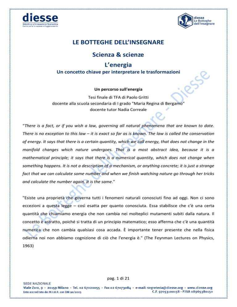 LE BOTTEGHE DELL’INSEGNARE Scienza & scienze L’energia Un concetto chiave per interpretare le trasformazioni Un percorso sull'energia Tesi finale di TFA di Paolo Gritti docente alla scuola secondaria di I grado "Maria Regina di Bergamo" docente tutor Nadia Correale “There is a fact, or if you wish a law, governing all natural phenomena that are known to date. There is no exception to this law – it is exact so far as is known. The law is called the conservation of energy. It says that there is a certain quantity, which we call energy, that does not change in the manifold changes which nature undergoes. That is a most abstract idea, because it is a mathematical principle; it says that there is a numerical quantity, which does not change when something happens. It is not a description of a mechanism, or anything concrete; it is just a strange fact that we can calculate some number and when we finish watching nature go through her tricks and calculate the number again, it is the same.” "Esiste una proprietà che governa tutti i fenomeni naturali conosciuti fino ad oggi. Non ci sono eccezioni a questa legge – così esatta per quanto conosciuta. Essa stabilisce che c'è una certa quantità che chiamiamo energia che non cambia nei molteplici mutamenti subiti dalla natura. Il concetto è astratto, poiché si tratta di un principio matematico; esso afferma che c'è una quantità numerica che non cambia qualsiasi cosa accada. È importante tener presente che nella fisica odierna noi non abbiamo cognizione di ciò che l'energia è." (The Feynman Lectures on Physics, 1963) pag. 1 di 21 Premessa Il concetto di energia è uno dei più importanti concetti fisici della scienza contemporanea e della pratica ingegneristica. Negli ultimi anni l’uso di questa parola è diventato pressoché quotidiano, si parla infatti di energia tutte le volte che ci riferiamo al costo del combustibile per trasporto o per riscaldamento, all’elettricità utilizzata per l’illuminazione o per il funzionamento di apparecchiature, alla quantità di alimenti che consumiamo ecc. Il concetto di energia è talmente centrale nella scienza e nella società, che è considerato una 'competenza' fondamentale: non a caso fa parte di una delle tre competenze di base per l'asse scientifico-tecnologico da raggiungere entro il 10° anno di scolarità (documento MPI del 22 Agosto 2007). La prima parte di questo lavoro è un’introduzione storica del concetto di energia, in cui viene presentato il percorso scientifico che pian piano ha portato all’affermazione di questo concetto. Può essere vista come la sintesi di una lezione che il docente presenta alla classe, al fine di introdurre l’argomento cercando di creare curiosità e interesse. Personalmente credo che presentare argomenti scientifici parlando della storia che ha portato alla loro affermazione sia un modo per mostrare ai ragazzi che le scoperte scientifiche non avvengono solo come isolata intuizione di un ricercatore ma come progressiva conquista di elementi sempre più approfonditi che hanno consentito l’ampliarsi delle nostre conoscenze. La seconda parte invece mette a confronto due metodologie didattiche diverse per affrontare l’argomento, il primo quello tradizionale delle “forme di energia” e il secondo quello più moderno dei “portatori di energia”. pag. 2 di 21 Introduzione In modo sintetico possiamo definire la fisica come quella scienza che si occupa di ciò che è (le cose) e di ciò che accade (i fenomeni). Per indagare sulle cause e sugli effetti dei fenomeni, costruendo modelli che possano rendere tali fenomeni predicibili e controllabili, la fisica ha bisogno di una grande quantità di leggi e principi generali. Esistono casi relativamente semplici in cui non è difficile riuscire a fare previsioni circa l’evoluzione temporale di un fenomeno. Un oggetto che cade da una certa altezza, ad esempio, rappresenta un fenomeno in cui su un corpo agisce la sola forza di gravità (ovviamente trascurando gli attriti) e che, grazie alle leggi del moto e della dinamica classica, siamo in grado di controllare facendo, ad esempio, previsioni molto accurate sulla variazione della posizione o della velocità: Ma i fenomeni a cui assistiamo quotidianamente non sono sempre assimilabili a situazioni o modelli così semplici. Se pensiamo a fenomeni in cui sono presenti forze che variano nel tempo e nelle posizioni è quasi impossibile fare previsioni in modo semplice circa la loro evoluzione temporale. Per risolvere anche queste situazioni la fisica cerca delle vere e proprie scappatoie, non indagando più le grandezze che variano continuamente, bensì concentrandosi su quelle grandezze che rimangono invariate nel tempo (invarianti) e che hanno portato alla definizione delle leggi di conservazione. Sapere che in un dato sistema esiste una grandezza che rimane invariata nel tempo non ci permette di controllare quel sistema, ma di certo ci fornisce delle informazioni preziose per comprendere quanto meno quello che non potrà succedere perché in contrasto con ciò che tali leggi affermano. pag. 3 di 21 Breve storia del concetto di energia L’evoluzione del concetto di energia è proprio la storia dei tentativi di comprendere il cambiamento attraverso ciò che rimane invariato. Il primo frutto di questa ricerca scientifica degli invarianti della natura fu la dottrina dell’indistruttibilità degli atomi, Democrito (V secolo a.C.) affermava infatti “niente viene dal niente e niente può diventare niente”, Epicuro (IV secolo a.C.) aggiungerà “altrimenti tutto può venire da tutto”. La conservazione non era attribuita solo alla materia ma anche al moto degli atomi stessi che veniva considerato come indefinitamente ridistribuito e mai completamente annullato. Sotto questa concezione tutti i fenomeni dell’universo consistevano in ridistribuzioni di materia-movimento. Sebbene in questi concetti si possa già intravedere l’idea di conservazione (nul