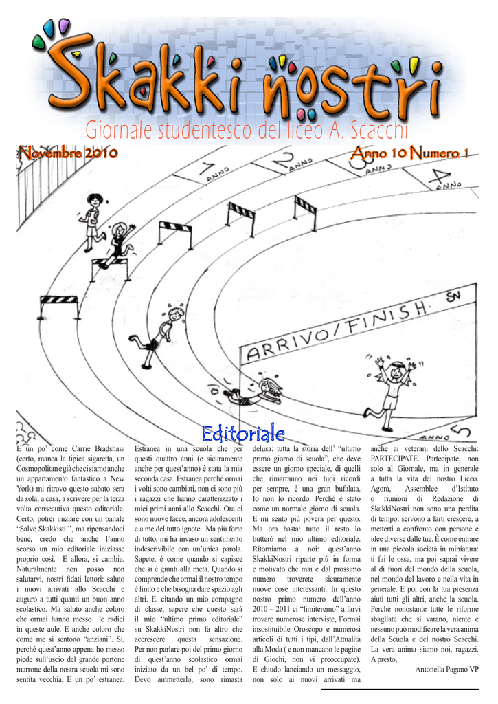 Giornale studentesco del liceo A. Scacchi Novembre 2010 E un po’ come Carrie Bradshaw (certo, manca la tipica sigaretta, un Cosmopolitan e già che ci siamo anche un appartamento fantastico a New York) mi ritrovo questo sabato sera da sola, a casa, a scrivere per la terza volta consecutiva questo editoriale. Certo, potrei iniziare con un banale “Salve Skakkisti!”, ma ripensandoci bene, credo che anche l’anno scorso un mio editoriale iniziasse proprio così. E allora, si cambia. Naturalmente non posso non salutarvi, nostri fidati lettori: saluto i nuovi arrivati allo Scacchi e auguro a tutti quanti un buon anno scolastico. Ma saluto anche coloro che ormai hanno messo le radici in queste aule. E anche coloro che come me si sentono “anziani”. Si, perché quest’anno appena ho messo piede sull’uscio del grande portone marrone della nostra scuola mi sono sentita vecchia. E un po’ estranea. Anno 10 Numero 1 Estranea in una scuola che per questi quattro anni (e sicuramente anche per quest’anno) è stata la mia seconda casa. Estranea perché ormai i volti sono cambiati, non ci sono più i ragazzi che hanno caratterizzato i miei primi anni allo Scacchi. Ora ci sono nuove facce, ancora adolescenti e a me del tutto ignote. Ma più forte di tutto, mi ha invaso un sentimento indescrivibile con un’unica parola. Sapete, è come quando si capisce che si è giunti alla meta. Quando si comprende che ormai il nostro tempo è finito e che bisogna dare spazio agli altri. E, citando un mio compagno di classe, sapere che questo sarà il mio “ultimo primo editoriale” su SkakkiNostri non fa altro che accrescere questa sensazione. Per non parlare poi del primo giorno di quest’anno scolastico ormai iniziato da un bel po’ di tempo. Devo ammetterlo, sono rimasta delusa: tutta la storia dell’ “ultimo primo giorno di scuola”, che deve essere un giorno speciale, di quelli che rimarranno nei tuoi ricordi per sempre, è una gran bufalata. Io non lo ricordo. Perché è stato come un normale giorno di scuola. E mi sento più povera per questo. Ma ora basta: tutto il resto lo butterò nel mio ultimo editoriale. Ritorniamo a noi: quest’anno SkakkiNostri riparte più in forma e motivato che mai e dal prossimo numero troverete sicuramente nuove cose interessanti. In questo nostro primo numero dell’anno 2010 – 2011 ci “limiteremo” a farvi trovare numerose interviste, l’ormai insostituibile Oroscopo e numerosi articoli di tutti i tipi, dall’Attualità alla Moda ( e non mancano le pagine di Giochi, non vi preoccupate). E chiudo lanciando un messaggio, non solo ai nuovi arrivati ma anche ai veterani dello Scacchi: PARTECIPATE. Partecipate, non solo al Giornale, ma in generale a tutta la vita del nostro Liceo. Agorà, Assemblee d’Istituto o riunioni di Redazione di SkakkiNostri non sono una perdita di tempo: servono a farti crescere, a metterti a confronto con persone e idee diverse dalle tue. È come entrare in una piccola società in miniatura: ti fai le ossa, ma poi saprai vivere al di fuori del mondo della scuola, nel mondo del lavoro e nella vita in generale. E poi con la tua presenza aiuti tutti gli altri, anche la scuola. Perché nonostante tutte le riforme sbagliate che si varano, niente e nessuno può modificare la vera anima della Scuola e del nostro Scacchi. La vera anima siamo noi, ragazzi. A presto, Antonella Pagano VP INTERVISTA MAGISTRALE 2 di Valerio Iacovone V P Già nella scorsa assemblea si è parlato della fatidica terza prova ministeriale e lei aveva detto che non c’erano ancora indicazioni precise a proposito. Se n’è poi saputo qualcosa? Non ancora, credo che purtroppo per quest’anno sia difficile l’arrivo di qualsiasi novità a tal proposito se non all’ultimo momento, a livello sperimentale. Si sa solo che dall’anno prossimo andrà a regime una forma di terza prova a livello nazionale. Appena sapremo qualcosa, lo porteremo subito a conoscenza di tutti. Ovviamente quest’anno ci sono stati diversi tagli, dovuti anche a qualche problema economico della scuola. Un esempio è quello del laboratorio di chimica, che è stato bonificato, ma è ancora inaccessibile a causa della mancanza del tecnico. Qual è il problema principale della scuola dovuto ai tagli? Non è vero che i laboratori non sono accessibili. Il problema principale, effettivamente, è quello del dimezzamento dei tecnici; in realtà, secondo l’ordinamento, alla nostra scuola non ne spetterebbe neanche uno: vengono assegnati solo agli istituti che hanno materie che prevedono istituzionalmente lo svolgimento di una parte del programma in laboratorio (come matematica applicata). Per fortuna siamo riusciti ad averli anche noi e, in effetti, è sempre utile avere un tecnico di laboratorio: aiuta la didattica. Erano arrivati addirittura quattro tecnici ma, in seguito alle varie finanziarie, ne sono stati tagliati, in tutti gli istituti, la metà. Quest’anno avremo quindi solo un tecnico per i laboratori informatici ed uno per quelli scientifici (scienze, fisica e chimica). Ho chiesto quindi ai tecnici di concordare con i docenti un calendario che consenta di lavorare meglio e contemporaneamente ho raccomandato ai docenti di rendersi indipendenti dai tecnici ed autonomi nella lezione in laboratorio. Non è detto che per fare una lezione d’informatica ci sia bisogno del tecnico una volta avviata l’attività. Il problema è aggravato dal fatto che l’unico tecnico dei laboratori scientifici sia attualmente in malattia, però i professori dei dipartimenti di matematica, fisica e scienze mi hanno detto che loro si stanno attrezzando per svolgere le esperienze anche senza tecnico. Già da tempo la Gelmini e il governo in generale ci “chiedono” di non Sommario 2- 11 22 - 23 12 - 16 24 - 25 26 17 -19 27 20 28-29 21 2 Skakki Matti 30- 31 portare la politica a scuola. Ci si domanda come si possa pensare che escludere la discussione su qualsiasi argomento, a maggior ragione quello politico,