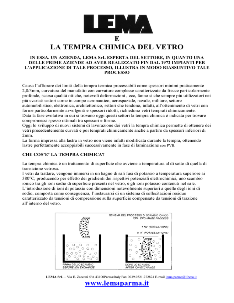 E LA TEMPRA CHIMICA DEL VETRO IN ESSA. UN AZIENDA, LEMA SrL ESPERTA DEL SETTORE, IN QUANTO UNA DELLE PRIME AZIENDE AD AVER REALIZZATO FIN DAL 1972 IMPIANTI PER L’APPLICAZIONE DI TALE PROCESSO, ILLUSTRA IN MODO RIASSUNTIVO TALE PROCESSO Causa l’affiorare dei limiti della tempra termica processabili come spessori minimi praticamente 2,8/3mm, curvatura del manufatto con curvature complesse caratterizzate da frecce particolarmente profonde, scarsa qualità ottiche, notevoli deformazioni , ecc, fanno si che sempre più utilizzatori nei più svariati settori come in campo aeronautico, aerospaziale, navale, militare, settore automobilistico, elettronica, architettonico, settori che tendono, infatti, all’ottenimento di vetri con forme particolarmente avvolgenti e spessori ridotti, richiedono vetri temprati chimicamente. Data la fase evolutiva in cui si trovano oggi questi settori la tempra chimica è indicata per trovare compromessi spesso ottimali tra spessori e forme. Oggi lo sviluppo di nuovi sistemi di lavorazione dei vetri la tempra chimica permette di ottenere dei vetri precedentemente curvati e poi temprati chimicamente anche a partire da spessori inferiori di 2mm. La forma impressa alla lastra in vetro non viene infatti modificata durante la tempra, ottenendo lastre perfettamente accoppiabili successivamente in fase di laminazione con PVB. CHE COS’E’ LA TEMPRA CHIMICA? La tempra chimica è un trattamento di superficie che avviene a temperatura al di sotto di quella di transizione vetrosa. I vetri da trattare, vengono immersi in un bagno di sali fusi di potassio a temperatura superiore ai 380°C, producendo per effetto dei gradienti dei rispettivi potenziali elettrochimici, uno scambio ionico tra gli ioni sodio di superficie presenti nel vetro, e gli ioni potassio contenuti nel sale. L’introduzione di ioni di potassio con dimensioni notevolmente superiori a quelle degli ioni di sodio, comporta come conseguenza, l’instaurarsi di un sistema di sollecitazioni residue caratterizzato da tensioni di compressione sulla superficie compensate da tensioni di trazione all’interno del vetro. LEMA SrL – Via E. Zacconi 5/A 43100Parma/Italy Fax 0039.0521.272824 E-mail [email protected] www.lemaparma.it LA TEMPRA CHIMICA DIVENTA INDISPENSABILE NELLE SEGUENTI SITUAZIONI: Quando lo spessore del vetro da temprare, è inferiore ai 2,5mm. Sotto questo spessore, diventa infatti molto difficile e quasi impraticabile, l’applicazione del processo di tempra termica Nel caso di vetri con curvatura molto complesse o caratteristiche dimensionali che non potrebbero essere in alcun modo prese in considerazione dagli impianti di tempra termica. Necessità di resistenze meccaniche superiori a quelle normalmente ottenibili dalla tempra termica, nel caso di applicazioni industriali o architettoniche particolari Necessità di resistenze agli urti superiori a quelle ottenibili con la tempra tradizionale termica. Necessità di ottenere oltre alla resistenza meccanica, elevati requisiti ottici o totale assenza di deformazioni superficiali sul vetro, per applicazioni di tipo industriale o veicolare. PROPRIETA’ DEL VETRO TEMPRATO CHIMICAMENTE Proprietà fisiche Tipo di vetro Vetro sodo-calcico Materiali vetrosi con composizioni chimiche speciali Spessore vetro Da 0,5 mm Dimensioni massime vetro 3200x2200 Proprietà meccaniche Profondità di penetrazione 20-100 micron Resistenza alla flessione M:O:R: ASTM C 158-95: 300-600 Mpa Valori diversi (più spinti ) di quelli sopra riportati sono ottenibili in relazione alla durata ed alla temperatura del ciclo; i valori vanno selezionati in base alle particolari esigenze progettuali e alle condizioni di impiego dei manufatti Lavorazione Il vetro temprato chimicamente può essere successivamente tagliato, molato, forato, decorato e sagomato GLI IMPIANTI LEMA E’ di fondamentale importanza che il trattamento si effettui su macchine dotate di sistemi di sicurezza e protezione completamente automatici, per non rischiare di rovinare i vetri e il bagno. Le unità LEMA, sono frutto d’anni di studio ed esperienza in collaborazione con le maggiori industrie del vetro. Prodotte sin dal 1972, raggiungono un elevato grado di perfezione, possibile solo grazie alla profonda conoscenza del processo al quale le macchine si devono rigorosamente attenere. LEMA SrL – Via E. Zacconi 5/A 43100Parma/Italy Fax 0039.0521.272824 E-mail [email protected] www.lemaparma.it Tabella delle resistenze Una tabella comparativa sui diversi requisiti della resistenza del vetro trasformato può dare al progettista qualche elemento utile per la scelta della tipologia di vetro più appropriata in rapporto ad una specifica applicazione. Tipo di Vetro Ricotto Indurito da 2.3 a 8 30/70 Temprato termico da 3.2 a 19 30/70 Temprato chimico da 0.7 a 19 300/400 Spessore (mm) Compressione superficiale [N/mq] Spessore zona compressa Resistenza alla flessione [N/mq] Resistenza [ °C] Frammentazione da 2.3 a 19 0 0 20% spessore del vetro 120/200 Fino a 100/120 micron 30/40 20% spessore del vetro 50/100 30 Pezzi grandi taglienti 40/100 Pezi medi in Parte taglienti 110/180 Pezzi piccoli Non taglienti * Over 200 Pezzi grandi taglienti 250/600 * Il vetro temperato termico è l'unico prodotto monolitico che può essere considerato "Vetro di Sicurezza". Tutti gli altri vetri, per essere ritenuti tali, devono essere stratificati. LEMA SrL – Via E. Zacconi 5/A 43100Parma/Italy Fax 0039.0521.272824 E-mail [email protected] www.lemaparma.it