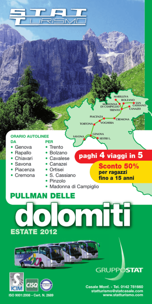 MARILLEVA MARILLEVA BOLZANO BOLZANO SAN MADONNA SAN CASSIANO DI MADONNA CAMPIGLIO CASSIANO DI CAMPIGLIO CANAZEI TRENTO CANAZEI TRENTO PIACENZA PIACENZA TORTONA TORTONA ORARIO AUTOLINEE PER DA • • • • • • Genova Rapallo Chiavari Savona Piacenza Cremona • • • • • • • • SAVONA SAVONA VOGHERA VOGHERA CREMONA CREMONA GENOVA GENOVA SESTRI L. SESTRI L. Trento Bolzano paghi viaggi in Cavalese Canazei Sconto 50% Ortisei per ragazzi S. Cassiano fino a 15 anni Pinzolo Madonna di Campiglio 4 5 PULLMAN DELLE dolomiti ESTATE 2012 ISO 9001:2008 - Cert. N. 2689 Casale Monf. - Tel. 0142 781660 [email protected] www.statturismo.com Sconto 50% per ragazzi fino a 15 anni ANDATA C A 5.00 5.04 5.09 5.14 5.36 5.42 5.45 6.00 5.05 5.08 5.11 5.15 5.35 6.05 6.20 6.25 7.20 7.35 7.50 8.40 9.40 11.40 12.00 13.15 13.22 13.25 13.30 13.35 13.50 13.53 14.00 14.02 14.05 14.08 14.09 14.11 14.12 14.13 14.15 14.20 DOLOMITI Savona • SESTRI • GENOVA • Piacenza Cremona • Trento • CANAZEI paghi 4 viaggi in 5 RITORNO D B a SAVONA (P.zza del Popolo - fermata bus) 16.55 Albisola (Bagni Colombo) 16.50 Celle (Via Aurelia - fermata bus) 16.45 Varazze (C.so Matteotti - fermata bus) 16.40 Voltri (Via Pra - angolo uscita autostrada - fermata bus) 16.16 Pegli (Hotel Mediterranèe - fermata bus) 16.08 Sestri Ponente (Via Merano 24/r - fermata bus) 16.05 p GENOVA (P.zza della Vittoria 2- 4 - lato INPS - fermata STAT) 15.45 a SESTRI LEVANTE (P.zza Italia 4 - fermata bus Ag. La Vela) 16.45 Cavi di Lavagna (P.zza Stazione FS) 16.42 Lavagna (P.zza Stazione FS) 16.39 Chiavari (Edicola fronte Stazione FS) Chiavari (Stazione FS - fermata bus) 16.35 Rapallo (P.zza delle Nazioni - fermata bus) Rapallo (Casello Autostradale - P.zzale Genova - fermata bus) 16.20 p GENOVA (P.zza della Vittoria 2- 4 - lato INPS - fermata STAT) 15.45 a 15.30 GENOVA (P.zza della Vittoria 2- 4 - lato INPS - fermata STAT) GENOVA (P.zza Acquaverde - Stazione Principe) 15.20 TORTONA (Autostazione) PRENOTAZIONE OBBLIGATORIA 14.15 VOGHERA (Stazione FS) PRENOTAZIONE OBBLIGATORIA 14.00 VOGHERA (Casello Autostrada) PRENOTAZIONE OBBLIGATORIA Broni-Stradella (Autogrill Pavesi - A21 TO-PC) PRENOT. OBBLIGATORIA 13.45 PIACENZA (Via Gorra - Stadio - parcheggio scambiatore) H 13.15 CREMONA (Autostazione) 12.40 p 9.50 TRENTO (Autostazione) a 9.25 TRENTO (Autostazione) Cavalese (Autostazione - Via Marconi) m. 1000 8.08 Tesero (fermata bus - P.zza Cesare Battisti) m. 900 8.02 Panchià (fermata bus) m. 981 7.56 Ziano (fermata bus - P.zza Italia) m. 953 7.53 PREDAZZO (Autostazione) m. 1014 7.50 MOENA (Autostazione) m. 1184 7.35 Soraga (fermata bus - P.zza CIOK) m. 1210 7.32 VIGO DI FASSA (fermata bus - HTL Astoria) 7.25 VIGO DI FASSA (fermata bus - S.Giovanni-hotel Dolomiti) 7.23 POZZA DI FASSA (Località Vac) 7.20 PERA DI FASSA (HTL Rizzi) m. 1315 7.17 Mazzin (fermata bus - Ufficio Turistico) m. 1315 7.16 Campestrin (fermata bus - Albergo Fassa) m. 1373 7.15 Fontanazzo (fermata bus - Albergo Ciamol) m. 1373 7.13 CAMPITELLO (fermata bus - P.zza Centrale) m. 1448 7.10 CANAZEI (fermata bus Piazza Marconi) m. 1465 7.05 p 7.00 CANAZEI ALBA (fermata bus - Albergo Alba) FERMATE p a p a p a p a A Lunedì, Giovedì e Sabato dal 30/6 al 1/9. Corse supplementari Sabato 8 e 15 settembre. B Martedì, Venerdì e Domenica dal 1/7 al 2/9. Corse supplementari Domenica 9 e 16 settembre. C Da Savona e Sestri Levante Sabato e Lunedì dal 30/6 al 18/8. D Fino a Savona e Sestri Levante Venerdì e Domenica dal 1/7 al 19/8. NOTA: Nel viaggio di ritorno a seconda delle condizioni del traffico, a discrezione del conducente, l’ordine delle fermate a Genova potrà essere invertito. INVERNO 2012 / 2013 Da Dicembre a Marzo. Per gli orari consultare “PULLMAN DELLA NEVE” 2012 / 2013. H Collegamenti da Piacenza centro per via Gorra gestiti da TEMPI AGENZIA (navetta Stadio e linea 8). INFO: 800 211 173 SOSTE: VEDI NOTA ◆ Sconto 50% per ragazzi fino a 15 anni ANDATA C A 5.00 5.04 5.09 5.14 5.36 5.42 5.45 6.00 5.05 5.08 5.11 5.15 5.35 6.05 6.20 6.25 7.20 7.35 7.50 8.40 9.40 11.40 12.35 12.55 13.25 13.35 13.40 13.55 14.15 14.16 14.20 14.21 14.35 14.55 15.10 15.15 15.16 15.20 15.30 DOLOMITI SAVONA • Sestri • GENOVA • Cremona Bolzano • Ortisei • SAN CASSIANO paghi 4 viaggi in 5 RITORNO B D a SAVONA (P.zza del Popolo - fermata bus) 16.55 Albisola (Bagni Colombo) 16.50 Celle (Via Aurelia-fermata bus) 16.45 Varazze (C.so Matteotti - ferm.bus) 16.40 Voltri (Via Pra - angolo uscita autostrada - fermata bus) 16.16 Pegli (Hotel Mediterranèe-fermata bus) 16.08 Sestri Ponente (Via Merano 24/r - fermata bus) 16.05 p GENOVA (P.zza della Vittoria 2- 4 - lato INPS - fermata STAT) 15.45 a SESTRI LEVANTE (P.zza Italia 4 - fermata bus Ag. La Vela) 16.45 Cavi di Lavagna (P.zza Stazione FS) 16.42 Lavagna (P.zza Stazione FS) 16.39 Chiavari (Edicola fronte Stazione FS) Chiavari (Stazione FS - fermata bus) 16.35 Rapallo (P.zza delle Nazioni - fermata bus) Rapallo (Casello Autostradale - P.zzale Genova - fermata bus) 16.20 p GENOVA (P.zza della Vittoria 2- 4 - lato INPS - fermata STAT) 15.45 a 15.30 GENOVA (P.zza della Vittoria 2- 4 - lato INPS - fermata STAT) GENOVA (P.zza Acquaverde - Stazione Principe) 15.20 TORTONA (Autostazione) PRENOTAZIONE OBBLIGATORIA 14.15 VOGHERA (Stazione FS) PRENOTAZIONE OBBLIGATORIA 14.00 VOGHERA (Casello Autostrada) PRENOTAZIONE OBBLIGATORIA Broni-Stradella (Autogrill Pavesi - A21 TO-PC) PRENOT. OBBLIGATORIA 13.45 PIACENZA (Via Gorra - Stadio - parcheggio scambiatore) H 13.15 CREMONA (Autostazione) 12.40 TRENTO (Autostazione) 9.50 p 9.00 BOLZANO (Autostazione) a 8.40 BOLZANO (Autostazione) Fiè a Sciliar (fermata bus - fronte Ufficio Informazioni) 8.15 SIUSI (Autostazione fronte ufficio informazioni) m. 998 8.10 Castelrotto (Piazzale partenze bus) m. 1060 8.05 ORTISEI (Autostazione - P.zza S. Antone) 7.45 S. CRISTINA (fermata bus - Municipio) m. 1428 7.35 S. CRISTINA (hotel Dosses) 7.34 SELVA DI VALGARDENA (fermata bus - hotel Oswald) 7.30 SELVA DI VALGARDENA (ferm