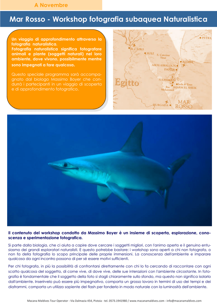 A Novembre Mar Rosso - Workshop fotografia subaquea Naturalistica Un viaggio di approfondimento attraverso la fotografia naturalistica. Fotografia naturalistica significa fotografare animali e piante (soggetti naturali) nel loro ambiente, dove vivono, possibilmente mentre sono impegnati a fare qualcosa. Questo speciale programma sarà accompagnato dal biologo Massimo Boyer che condurrà i partecipanti in un viaggio di scoperta e di approfondimento fotografico. Il contenuto del workshop condotto da Massimo Boyer è un insieme di scoperta, esplorazione, conoscenza e sperimentazione fotografica. Si parte dalla biologia, che ci aiuta a capire dove cercare i soggetti migliori, con l'animo aperto e il genuino entusiasmo dei grandi esploratori naturalisti. E questo potrebbe bastare: i workshop sono aperti a chi non fotografa, o non fa della fotografia lo scopo principale delle proprie immersioni. La conoscenza dell'ambiente e imparare qualcosa da ogni incontro possono di per sé essere motivi sufficienti. Per chi fotografa, in più la possibilità di confrontarsi direttamente con chi lo fa cercando di raccontare con ogni scatto qualcosa del soggetto, di come vive, di dove vive, delle sue interazioni con l'ambiente circostante. In fotografia è fondamentale che il soggetto della foto si stagli chiaramente sullo sfondo, ma questo non significa isolarlo dall'ambiente. Inserirvelo può essere più impegnativo, comporta un grosso lavoro in termini di uso dei tempi e dei diaframmi, comporta un utilizzo sapiente del flash per fonderlo in modo naturale con la luminosità dell'ambiente. Macana Maldives Tour Operator - Via Dalmazia 454, Pistoia - tel. 0573.1941980 / www.macanamaldives.com - [email protected] Programma e condizioni Shark Expedition 2015 Mar Gibuti—Whale Rosso - Workshop fotografia subaquea Naturalistica Viaggio 07 notti Crociera Su M/Y Etoile con volo charter da Milano/Roma 22—29 novembre Quota individuale da €1165 OPERATIVI VOLO I voli charter per l’Egitto possono subire variazioni di orario, anche notevoli, fino a 24 ore prima della partenza. PROGRAMMA DI VIAGGIO Giorno 1 - Arrivo a bordo, assegnazione delle cabine, briefing, rinfresco di benvenuto. Giorno 2 - Partenza da Sharm el Sheikh la spettacolare laguna di El Dahara. Durante il tragitto i sub avranno modo di effettuare la check dive ed un’immersione nelle adiacenze del Parco Marino di Ras Mohammed, mentre chi vorrà potrà dedicarsi ai bagni ed allo snorkeling. Arrivati a El Dahara ,ci godremo i mille colori del tramonto in laguna con lo sfondo del deserto roccioso che ci circonda ed i subacquei effettueranno una immersione al tramonto o una notturna. Giorno 3- La mattina di buon’ora inizieremo l’esplorazione e la scoperta di una delle aree più colorate e sconosciute del Mar Rosso, dove saremo circondati da nuvole di pesci di ogni forma e colore e, con un po’ di fortuna, sarà possibile avere incontri inaspettati con grandi pelagici ed enormi pastinache. Potremo inoltre rilassarci fra bagni nelle basse acque cristalline, fra reef incontaminati e visitare una meravigliosa lingua di sabbia bianchissima semiaffiorante dove potremo dedicarci a bagni, snorkeling, sole e relax. Giorno 4- In mattinata, navigando fra un dedalo di meravigliosi reef (dove effettueremo soste per immergerci), ci sposteremo nella laguna di Shaab Ali dove pernotteremo ed effettueremo una notturna, durante la quale, con un po’ di fortuna, saremo circondati dai delfini. Giorno 5- Bagno in laguna, immergendoci e facendo snorkeling nei reef di Shag Rock, El Shebna, El Negsh e Shaab El Durk dove si celano gigantesche formazioni incontaminate di corallo duro (la zona non è normalmente frequentata da sub ed anche i pescatori la evitano in quanto i coralli duri impediscono la pesca con le reti) dove potremo osservare i numerosi pelagici di passo. Quindi torneremo in laguna per rilassarci, in attesa della cena, fra aperitivi e stuzzichini. Giorno 6- Alle prime luci dell’alba partiremo e potremo decidere se immergersi sul famoso relitto del Thistlegorm o, se le condizioni meteo-marine lo permetteranno, continuare la navigazione verso nord alla scoperta di nuovi reef e lagune (El Mamalh, El Gtafa, Abo Rashdan, etc..). Sarà organizzata una cena beduina a base di pesce fresco e pane fatto al momento in barca o sulla spiaggia. Giorno 7- Continueremo l’esplorazione di questa area, magari anche scoprendo nuovi punti di immersione con l’ausilio di cartografia, ecoscandaglio e GPS. Nel pomeriggio torneremo verso l’area di Ras Mohammed pernottando a El Dahara o al relitto del Dunraven per effettuare un’immersione al tramonto (nel rispetto del no fly). Giorno 8- Mentre ci rilasseremo con un’abbondante colazione l’equipaggio inizierà la navigazione verso il porto. Qualora il volo fosse la sera sarà comunque nostra cura lasciarvi godere in assoluto relax le ultime ore di mare e sole in località balneare attrezzata. La quota comprende: Crociera 7 notti nel Mar Rosso Egiziano, con trattamento di pensione completa (soft drink ai pasti) 3 immersioni al giorno + notturna, compatibilmente con il programma, esclusi giorno 1 e 7-8. Bombole e zavorra. Trasferimento aeroporto - barca e ritorno. Volo Charter da Milano/Roma a Sharm El Sheikh AR Assicurazione di base medico/bagaglio Snack salati, frutta, biscotti, the, caffè ed acqua sempre a disposizione. Partecipazione al workshop di fotografia naturalistica tenuto da Massimo Boyer, biologo e fotografo subacqueo. Tasse porti Visto di ingresso in Egitto (ca.25 € da pagare all’arrivo in Egitto); La tariffa non comprende: Visto di ingresso in Egitto da pagarsi all'arrivo a Sharm, circa 25 euro. Polizza assicurativa personale per attività subacquea (possibilità di attivarla direttamente a bordo per un costo di ca. 20€ per l’intera settimana – non obbligatoria). Tassa di ingresso al Parco Marino di Ras Mohammed (ca.5 €). Alcoolici (disponibili a pagamento a bordo). Soft drinks fuori pasto. Noleg
