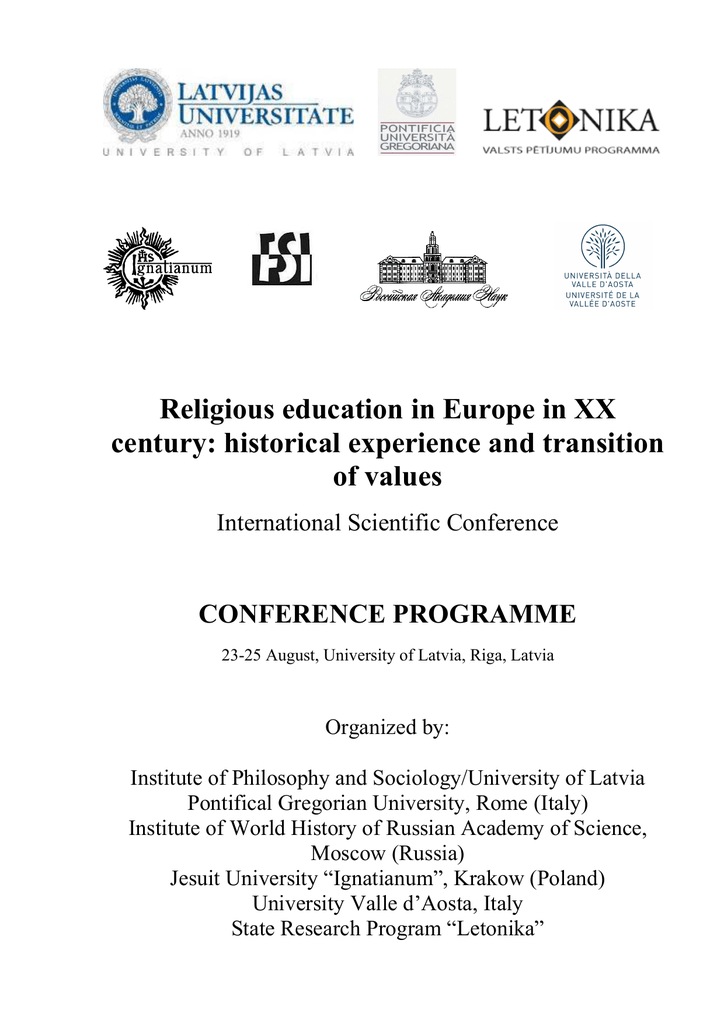 Religious education in Europe in XX century: historical experience and transition of values International Scientific Conference CONFERENCE PROGRAMME 23-25 August, University of Latvia, Riga, Latvia Organized by: Institute of Philosophy and Sociology/University of Latvia Pontifical Gregorian University, Rome (Italy) Institute of World History of Russian Academy of Science, Moscow (Russia) Jesuit University “Ignatianum”, Krakow (Poland) University Valle d’Aosta, Italy State Research Program “Letonika” Programme Sunday, August 23 Arrival in Riga Cultural program 13.00 – 16.00 – guided tour in the Old Riga (in English, Russian and Italian) Monday, August 24 (Raiņa bulv. 19, Small Aula) 9.00 Registration and Coffee 10.00 – 10.30 Opening and Plenary Session Indriķis Muižnieks, Rector of University of Latvia Marek Inglot, Pontifical Gregorian University, Rome Alexey Komarov, Institute of World History of Russian Academy of Science, Moscow (Russia) Maurizio Piseri, University Valle d’Aosta, Italy Maija Kūle, Director of Institute of Philosophy and Sociology Plenary Session Chair: Marek Inglot 10.30 – 12.30 Maija Kūle (Institute of Philosophy and Sociology/Latvia) The meaning of teaching religion, philosophy and humanities: past and contemporary age of globalization Angelo Gaudio (The University of Udine/Italy) Catholic education in modern Italy 1861-2011 Natalja Suhova (St.Tihon’s Orthodox University/Russia) The religious schools of Russian Orthodox Church. From the “new - course” to “upgrade:” 19431990 Nadezhda Beljakova (Institute of World History/ Russia) The models of education of the Soviet Evangelical communities: institutionalization and experience of teaching behind the legal boarders. Solveiga Krūmiņa – Koņkova (Institute of Philosophy and Sociology/Latvia) Religious education models in Europe and discussions on religious education in Latvia from 1990 up to 2000 12.30-14.00 – Lunch Session II Chair: Maija Kūle 14.00 – 15.30 Aleksey Beglov (Institute of World History/Russia) The Orthodox religious education in underground: 1918-1990 Inese Runce (Institute of Philosophy and Sociology/Latvia) The Catholic Education system in the interwar period in Latvia Irina Paert (University of Tartu/Estonia) Educational work with young people in the Orthodox communities in the Baltic States 1918– 1939 15.30 – 16.00 - Coffee break Session III Chair: Maurizio Piseri 16.00 – 17.30 Sergey Michalchenko (University of Brjansk/Russia) The theological faculties of Serbian, Horvath and Slovenian Kingdom (Yugoslavia) in 20s and 30s of 20th century by the eyes of Russian emigrant Svetlana Bogojavlenska (University of Mainz/Germany) The role of Orthodoxy in the state schools of Russian minority in Latvia in 20s and 30s of 20th century Regina Laukaityte (Institute of Lithuanian History/Lithuania) Monastic schools in Lithuania: Two starting positions at the beginning and at the end of the ХХ century Discussions 18.00 - Conference dinner August 25, (Raiņa bulv. 19, Small Aula) Session IV Chair: Solveiga Krūmiņa - Koņkova 10.00 – 12.00 Clauss Peter Sajak (University of Münster/Germany) No Inducation without Education - The German Way of Catholic Religious Education since 1945 Māra Kiope (Institute of Philosophy and Sociology/Latvia) Religious education in the Catholic Church of Latvia after the Second Vatican Council in the situation of totalitarian atheistic regime Angelo Bianchi (Catholic University of Milan/Italy) Giovanni Battista Montini and the intellectual and religious formation of the students of the FUCI (Federation of Italian Catholic university students). Aleksandrs Stepanovs (Riga Higher Institute of Religious Science of the Pontifical Lateran University/Latvia) Folk religiosity in the Latvian Roman Catholic Church in the Soviet period: 1940-1991. Religious education and image of the suffering Christ Vanessa Pollastro (The Archive of Catholic Social Movement in Italy) Italian Catholic Workers in the Period after WWII: Organizational choices and cultural leanings. Discussions 12.00 – 13.30 - lunch Session V Chair: Evgenia Tokareva 13.30 – 15.00 Fernando Bellelli (University of Modena and Reggio Emilia/Italy) The influence of Rosmini in Italian pedagogy in 20th century Proterej Nikolaj Tchernokrak (Saint-Serge, France) The Russian emigre center of religious education in Paris Ingrīda Trups-Kalne (Riga Higher Institute of Religious Science of the Pontifical Lateran University/Latvia) Sociopsychological foundations of moral fostering and education in the 20th century: overcoming the practical complications of the liberal paradigm Vladimir Ameltchenkov (father Seraphim) (Moscow, Russia) Religious education in Smolensk in 20th century Discussions 14.30 – 15.00 – Coffee break Session VI Chair: Irina Paert 15.00 – 16.30 Jānis Vējš (Institute of Philosophy and Sociology/Latvia) Toleration and Critical Thinking (Educational Experience) Skaidrīte Kalvāne (sister Klāra PIJ) (Riga Higher Institute of Religious Science of the Pontifical Lateran University/Latvia) Religious upbringing in the Soviet times in Latvia: ministry of the Congregation of the Sisters of Poor Child Jesus Svetlana Volgina (The Grebenschikov’s Seminary) Religious education and upbringing of Riga’s Old believers in 90s of 20th century 16.30 - Closing of conference 17.00 - Visit to the Grebenschikov’s Old Believers Community in Riga: tour and dinner. Welcoming and presentation by Illarions Ivanovs Organizing and Scientific Committee Marek Inglot, Pontifical Gregorian University, Rome (Italy) Evgenia Tokareva, Institute of World History of Russian Academy of Science, Moscow (Russia) Maurizio Piseri, University Valle d’Aosta, Italy Maija Kūle, Institute of Philosophy and Sociology/University of Latvia Inese Runce, Institute of Philosophy and Sociology/University of Latvia Solveiga Krūmiņa – Koņkova, Institute of Philosophy and Sociology/University of Latvia Nade