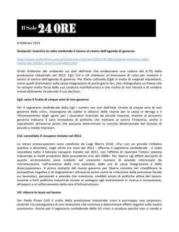 8 febbraio 2013 Sindacati: invertire la rotta mettendo il lavoro al