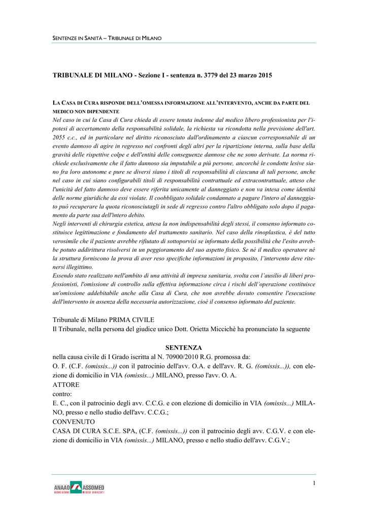 SENTENZE IN SANITÀ – TRIBUNALE DI MILANO TRIBUNALE DI MILANO - Sezione I - sentenza n. 3779 del 23 marzo 2015 LA CASA DI CURA RISPONDE DELL’OMESSA INFORMAZIONE ALL’INTERVENTO, ANCHE DA PARTE DEL MEDICO NON DIPENDENTE Nel caso in cui la Casa di Cura chieda di essere tenuta indenne dal medico libero professionista per l'ipotesi di accertamento della responsabilità solidale, la richiesta va ricondotta nella previsione dell'art. 2055 c.c., ed in particolare nel diritto riconosciuto dall'ordinamento a ciascun corresponsabile di un evento dannoso di agire in regresso nei confronti degli altri per la ripartizione interna, sulla base della gravità delle rispettive colpe e dell'entità delle conseguenze dannose che ne sono derivate. La norma richiede esclusivamente che il fatto dannoso sia imputabile a più persone, ancorché le condotte lesive siano fra loro autonome e pure se diversi siano i titoli di responsabilità di ciascuna di tali persone, anche nel caso in cui siano configurabili titoli di responsabilità contrattuale ed extracontrattuale, atteso che l'unicità del fatto dannoso deve essere riferita unicamente al danneggiato e non va intesa come identità delle norme giuridiche da essi violate. Il coobbligato solidale condannato a pagare l'intero al danneggiato può recuperare la quota riconosciutagli in sede di regresso contro l'altro obbligato solo dopo il pagamento da parte sua dell'intero debito. Negli interventi di chirurgia estetica, attesa la non indispensabilità degli stessi, il consenso informato costituisce legittimazione e fondamento del trattamento sanitario. Nel caso della rinoplastica, è del tutto verosimile che il paziente avrebbe rifiutato di sottoporvisi se informato della possibilità che l'esito avrebbe potuto addirittura risolversi in un peggioramento del suo aspetto fisico. Se né il medico operatore né la struttura forniscono la prova di aver reso specifiche informazioni in proposito, l’intervento deve ritenersi illegittimo. Essendo stato realizzato nell'ambito di una attività di impresa sanitaria, svolta con l’ausilio di liberi professionisti, l'omissione di controllo sulla effettiva informazione circa i rischi dell’operazione costituisce un'omissione addebitabile anche alla Casa di Cura, che non avrebbe dovuto consentire l'esecuzione dell'intervento in assenza della necessaria autorizzazione, cioè il consenso informato del paziente. Tribunale di Milano PRIMA CIVILE Il Tribunale, nella persona del giudice unico Dott. Orietta Miccichè ha pronunciato la seguente SENTENZA nella causa civile di I Grado iscritta al N. 70900/2010 R.G. promossa da: O. F. (C.F. (omissis...)) con il patrocinio dell'avv. O.A. e dell'avv. R. G. ((omissis...)), con elezione di domicilio in VIA (omissis...) MILANO, presso l'avv. O. A. ATTORE contro: E. C., con il patrocinio degli avv. C.C.G. e con elezione di domicilio in VIA (omissis...) MILANO, presso e nello studio dell'avv. C.C.G.; CONVENUTO CASA DI CURA S.C.E. SPA, (C.F. (omissis...)) con il patrocinio degli avv. C.G.V. e con elezione di domicilio in VIA (omissis...) MILANO, presso e nello studio dell'avv. C.G.V.; 1 TRIBUNALE DI MILANO – SEZIONE I - SENTENZA N. 3779/2015 CONCLUSIONI (omissis...) IN FATTO E IN DIRITTO Con atto di citazione ritualmente notificato O. F. ha convenuto in giudizio il dr. E. C. e la Casa di Cura S.C.E. e, dedotta la responsabilità del medico che esegui l'intervento di rinoplastica il 27.02.2002 e della struttura convenuta, ne ha chiesto la condanna al risarcimento dei danni. In particolare l'attore ha affermato: - che l'intervento di chirurgia estetica a cui si era sottoposto aveva determinato un peggioramento estetico e funzionale; o che per rimediare tale situazione avrebbe dovuto sottoporsi ad altro intervento chirurgico; - che i sanitari non l'avevano reso edotto dei rischi e delle possibili conseguenze postoperatorie. Ha chiesto che fosse accertata la responsabilità dei convenuti per omessa informazione sull'intervento e per inadempimento e ha chiesto il risarcimento dei danni alla persona e patrimoniali sia con riferimento a quanto sborsato per l'intervento malriuscito, sia per l'intervento in emenda da realizzare. Si è costituito il dr. E. C. che ha contestato le deduzioni attoree e affermato: - che O. F. si era rivolto a lui per risolvere esclusivamente problemi di natura estetica e non funzionale; - che l'intervento era stato eseguito in conformità ai protocolli medici; - che non vi era necessità di raccogliere un consenso scritto. Ha negato la necessità di un intervento in emenda, genericamente contestato le deduzioni avversarie in ordine al danno e chiesto il rigetto delle domande o in subordine il contenimento della condanna nei minimi. Si è costituita Casa di Cura S.C.E. affermando: - che il chirurgo aveva informato il paziente che aveva dato validamente il consenso all'intervento e che comunque dall'intervento non era derivato un peggioramento ma anzi un miglioramento estetico; - che anche la funzione respiratoria aveva tratto giovamento dall'intervento. Ha comunque negato la propria responsabilità affermando che non aveva stipulato alcun contratto con O. F., che il dr. C. operava presso la clinica convenuta e era stato retribuito direttamente dal cliente; che il dr. C. non era legato alla struttura da vincoli di subordinazione. Ha infine contestato i danni lamentati e chiesto il rigetto delle domande attorce. In via subordinata ha chiesto la condanna in via di regresso del convenuto C. a tenerla indenne. 1. L'attore addebita ai convenuti la cattiva esecuzione dell'intervento di rinoplastica - con finalità estetica -, che ha determinato esiti peggiorativi dell'aspetto fisico e della funzionalità respiratoria, nonché l'omessa informazione sui rischi connessi all'intervento che, ove conosciuti da F. l'avrebbe determinato a non sottoporsi all'intervento. 2. Non vi è contestazione in ordine al rapporto contrattuale intercorso tra O. F. e E. C., al quale l'attore si è 