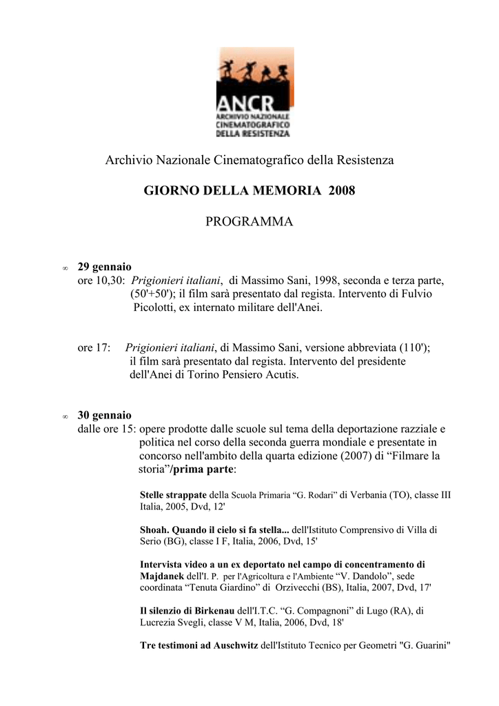 Archivio Nazionale Cinematografico della Resistenza GIORNO DELLA MEMORIA 2008 PROGRAMMA • 29 gennaio ore 10,30: Prigionieri italiani, di Massimo Sani, 1998, seconda e terza parte, (50'+50'); il film sarà presentato dal regista. Intervento di Fulvio Picolotti, ex internato militare dell'Anei. ore 17: • Prigionieri italiani, di Massimo Sani, versione abbreviata (110'); il film sarà presentato dal regista. Intervento del presidente dell'Anei di Torino Pensiero Acutis. 30 gennaio dalle ore 15: opere prodotte dalle scuole sul tema della deportazione razziale e politica nel corso della seconda guerra mondiale e presentate in concorso nell'ambito della quarta edizione (2007) di “Filmare la storia”/prima parte: Stelle strappate della Scuola Primaria “G. Rodari” di Verbania (TO), classe III Italia, 2005, Dvd, 12' Shoah. Quando il cielo si fa stella... dell'Istituto Comprensivo di Villa di Serio (BG), classe I F, Italia, 2006, Dvd, 15' Intervista video a un ex deportato nel campo di concentramento di Majdanek dell'I. P. per l'Agricoltura e l'Ambiente “V. Dandolo”, sede coordinata “Tenuta Giardino” di Orzivecchi (BS), Italia, 2007, Dvd, 17' Il silenzio di Birkenau dell'I.T.C. “G. Compagnoni” di Lugo (RA), di Lucrezia Svegli, classe V M, Italia, 2006, Dvd, 18' Tre testimoni ad Auschwitz dell'Istituto Tecnico per Geometri "G. Guarini" di Torino, Italia, 2007, Dvd, 31' IG Farben. La fabbrica della morte dell'I.T.C. “G. Compagnoni” di Lugo (RA), classe V, Italia, 2006, Dvd, 22' • 31 gennaio dalle ore 15: opere prodotte dalle scuole sul tema della deportazione razziale e politica nel corso della seconda guerra mondiale e presentate in concorso nell'ambito della quarta edizione (2007) di “Filmare la storia”/seconda parte: Sergio De Simone: Napoli 29.11.1937/Amburgo, Bullenhuser damm 20.4.1945 dell'Istituto d'Istruzione Superiore “Saluzzo- Plana”, Liceo Linguistico di Alessandria, classe V A, Italia, 2005/2006, Dvd, 23' Auschwitz: l'orrore nazista dell'I. Tecnico Industriale “G. Marconi” di Tortona (AL), classe V BS, Italia, 2005/2006, Dvd, 11' Meditate che questo è stato del Liceo Artistico “M. Rosso” di Lecco, classe IV A, Italia, 2006, Dvd, 5' Un treno per Auschwitz dell'Interscuola di Lecco : Liceo Artistico “M. Rosso”, I. Tecnico Industriale “S. Badoni”, I. Tecnico Commerciale “G. Parini”, Liceo Scientifico “G. B. Grassi”, classi IV, Italia, 2006, Dvd, 17' Auschwitz 2007 dell'Istituto Professionale per i Servizi Commerciali, Turistici e Sociali "Bosso- Monti" di Torino, Italia, 2007, Dvd, 15' Anche questa è vita dell'Istituto Professionale per la Cinematografia e Tv "F. Fellini" di Torino, classi II, III, IV e V, Italia, 2006, Dvd, 16' Testimoni, luoghi, memorie. Viaggi di studio nei lager nazisti 1998-2006 dell'Istituto Tecnico Industriale "G. B. Pininfarina" di Moncalieri (TO), classi del laboratorio multimediale, Italia, 2006, Dvd, 17' ore 19,30: Prigionieri italiani, di Massimo Sani, seconda e terza parte, (50'+50'), replica per gli studenti dei Ctp e dei corsi serali. Il film sarà introdotto. Intervento del presidente dell'Anei di Torino Pensiero Acutis Su richiesta proiezioni al mattino per le scuole anche mercoledì 30 gennaio Sala proiezioni del Museo Diffuso della Resistenza, della Deportazione, della Guerra, dei Diritti e della Libertà corso Valdocco 4/a, TORINO