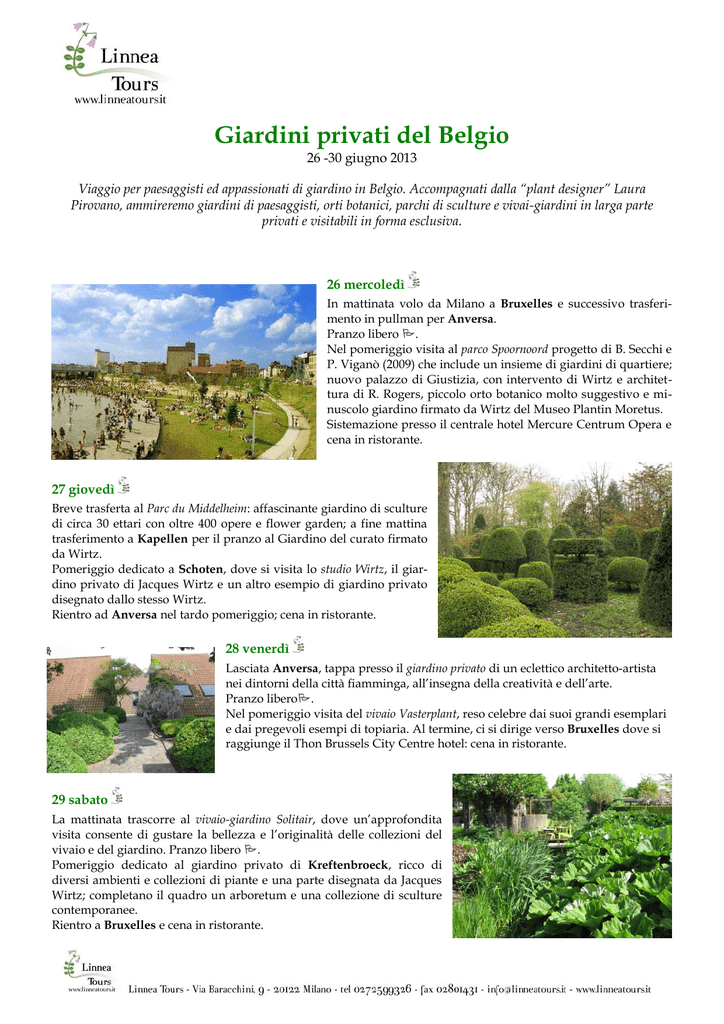 Giardini privati del Belgio 26 -30 giugno 2013 Viaggio per paesaggisti ed appassionati di giardino in Belgio. Accompagnati dalla “plant designer” Laura Pirovano, ammireremo giardini di paesaggisti, orti botanici, parchi di sculture e vivai-giardini in larga parte privati e visitabili in forma esclusiva. 26 mercoledì In mattinata volo da Milano a Bruxelles e successivo trasferimento in pullman per Anversa. Pranzo libero . Nel pomeriggio visita al parco Spoornoord progetto di B. Secchi e P. Viganò (2009) che include un insieme di giardini di quartiere; nuovo palazzo di Giustizia, con intervento di Wirtz e architettura di R. Rogers, piccolo orto botanico molto suggestivo e minuscolo giardino firmato da Wirtz del Museo Plantin Moretus. Sistemazione presso il centrale hotel Mercure Centrum Opera e cena in ristorante. 27 giovedì Breve trasferta al Parc du Middelheim: affascinante giardino di sculture di circa 30 ettari con oltre 400 opere e flower garden; a fine mattina trasferimento a Kapellen per il pranzo al Giardino del curato firmato da Wirtz. Pomeriggio dedicato a Schoten, dove si visita lo studio Wirtz, il giardino privato di Jacques Wirtz e un altro esempio di giardino privato disegnato dallo stesso Wirtz. Rientro ad Anversa nel tardo pomeriggio; cena in ristorante. 28 venerdì Lasciata Anversa, tappa presso il giardino privato di un eclettico architetto-artista nei dintorni della città fiamminga, all’insegna della creatività e dell’arte. Pranzo libero. Nel pomeriggio visita del vivaio Vasterplant, reso celebre dai suoi grandi esemplari e dai pregevoli esempi di topiaria. Al termine, ci si dirige verso Bruxelles dove si raggiunge il Thon Brussels City Centre hotel: cena in ristorante. 29 sabato La mattinata trascorre al vivaio-giardino Solitair, dove un’approfondita visita consente di gustare la bellezza e l’originalità delle collezioni del vivaio e del giardino. Pranzo libero . Pomeriggio dedicato al giardino privato di Kreftenbroeck, ricco di diversi ambienti e collezioni di piante e una parte disegnata da Jacques Wirtz; completano il quadro un arboretum e una collezione di sculture contemporanee. Rientro a Bruxelles e cena in ristorante. 30 domenica Trasferimento in pullman all’Albert Boulevard, ancora una volta firmato da Wirtz, e al piccolo parco Reine Vert, firmato da Dhont. Visita dei giardini della Maison d’Erasmus a Bruxelles (una parte progettata da Pechère e una parte più nuova del paesaggista Benoit Fondu). Pranzo libero . Nel pomeriggio visita della casa museo in stile art déco dei coniugi David e Alice Van Buuren con giardino disegnato dal paesaggista belga Renè Pechère. Al termine, trasferimento in aeroporto e volo di rientro a Milano. Quota di partecipazione gruppo minimo 15 partecipanti euro 1.080 acconto euro 400 Basata sulle tariffe aeree/tasse aeroportuali oggi in vigore, comprende viaggio aereo in classe turistica, trasporto kg. 20 di bagaglio, sistemazione in camera a due letti presso gli hotel citati, trattamento di pernottamento e prima colazione, pasti come da programma, trasferimenti escursioni visite e ingressi come da programma, servizio di guida/accompagnatore a cura di Laura Pirovano, materiale di documentazione. La quota non comprende gli extra in genere, 4 pasti liberi , le bevande, i facchinaggi, le mance (prevedere 20 euro da consegnare all’accompagnatore all’inizio del viaggio) e quanto non espressamente citato nel programma. Supplementi sistemazione in camera singola gestione pratica euro euro 150 40 Alberghi hotel Mercure Centrum Opera () - Anversa ..................................... www.accorhotels.com - tel. 0032/32327675 Thon Brussels City Centre hotel () - Bruxelles.......................................www.thonhotels.be - tel. 0032/27007878 Orari mercoledì 26 giugno domenica 30 giugno ritrovo a Milano Malpensa, banchi accettazione Brussels Airlines ............................. ore 7,00 volo Brussels Airlines - SN 3154 Milano/Bruxelles ............................................ ore 8,55/10,30 volo Brussels Airlines - SN 3159 Bruxelles/Milano Malpensa ....................... ore 18,30/20,05 Documenti necessari Carta di identità idonea all’espatrio (considerato non valido il timbro di proroga) o passaporto in corso di validità. Annotazioni Necessario prendere attenta visione delle “condizioni generali di partecipazione ai viaggi” riportate sul catalogo Linnea Tours. ver 04/13