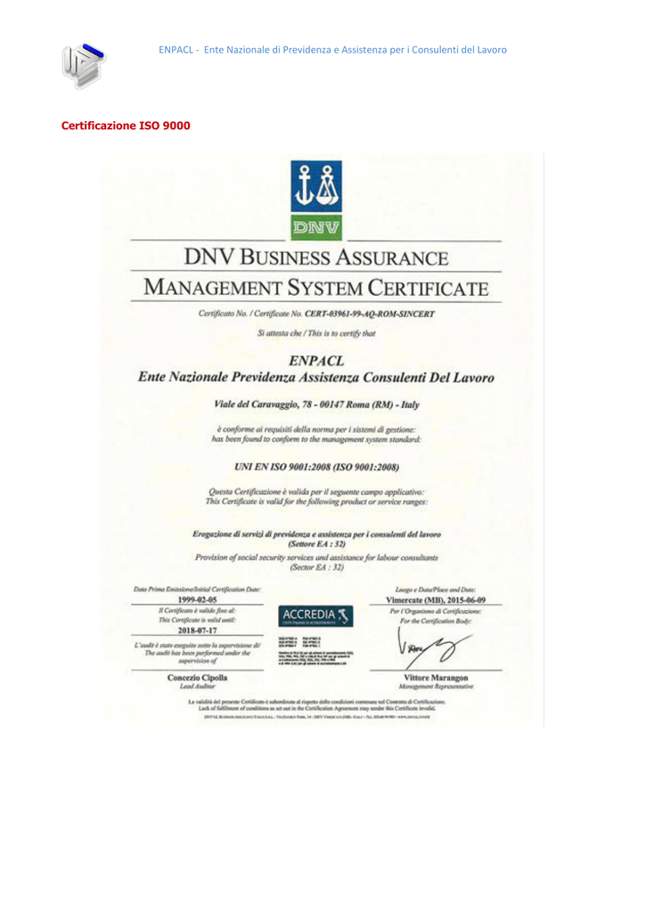 ENPACL - Ente Nazionale di Previdenza e Assistenza per i Consulenti del Lavoro Certificazione ISO 9000