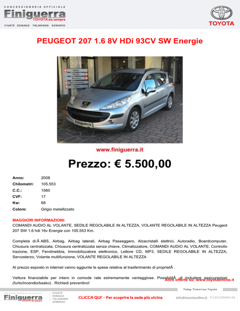 PEUGEOT 207 1.6 8V HDi 93CV SW Energie Prezzo: € 5.500,00 Anno: 2008 Chilometri: 105.553 C.C.: 1560 CVF: 17 Kw: 68 Colore: Grigio metallizzato MAGGIORI INFORMAZIONI: COMANDI AUDIO AL VOLANTE, SEDILE REGOLABILE IN ALTEZZA, VOLANTE REGOLABILE IN ALTEZZA Peugeot 207 SW 1.6 hdi 16v Energie con 105.553 Km. Completa di: ABS, Airbag, Airbag laterali, Airbag Passeggero, Alzacristalli elettrici, Autoradio, Boardcomputer, Chiusura centralizzata, Chiusura centralizzata senza chiave, Climatizzatore, COMANDI AUDIO AL VOLANTE, Controllo trazione, ESP, Fendinebbia, Immobilizzatore elettronico, Lettore CD, MP3, SEDILE REGOLABILE IN ALTEZZA, Servosterzo, Volante multifunzione, VOLANTE REGOLABILE IN ALTEZZA Al prezzo esposto in internet vanno aggiunte le spese relative al trasferimento di proprietà . Vettura finanziabile per intero in comode rate estremamente vantaggiose. Possibilità di includere assicurazioni Altre offerte su: www.toyotaonline.it (furto/incendio/kasko) . Richiedi preventivo! L'auto è esposta presso la sede di Osnago (Lc):Via Copernico 1/A. Telefono 039 9280032. La sede di Osnago è facilmente raggiungibile dalla tangenziale est di Milano, nelle vicinanze degli aeroporti di Linate e Orio al Serio. Le sedi del gruppo Finiguerra: Civate (lc) via provinciale 41 tel 0341-420100 Osnago (lc) via copernico 1/A tel 039-9280032 Poggiridenti (so) via centrale venina 4 tel 0342-564164 Talamona (so) via stelvio tel 0342-613985 Queste informazioni NON sono le informazioni precontrattuali previste dal D.Lgs 21/2014, ma una semplice indicazione sommaria del veicolo offerto che dovrà essere completata da specifiche informazioni precontrattuali fornite dal Venditore proponente prima che assumiate impegni. ELENCO ACCESSORI: ABS, Airbag, Airbag laterali, Airbag Passeggero, Controllo trazione, ESP, Fendinebbia, Alzacristalli elettrici, Boardcomputer, Chiusura centralizzata, Climatizzatore, Servosterzo, Autoradio, Lettore CD, MP3, Volante multifunzione, Immobilizzatore elettronico, Chiusura centralizzata senza chiave Altre offerte su: www.toyotaonline.it
