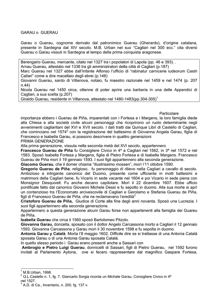 GARAU o GUERAU Garau o Guerau, cognome derivato dal patronimico Guerau (Gherardo), d’origine catalana, presente in Sardegna dal XIV secolo. M.B. Urban nel suo “Cagliari nel 300 ecc.” cita diversi Guerau o Garau vissuti in Sardegna al tempo della prima conquista aragonese. Berengario Guerau, mercante, citato nel 1327 tra i popolatori di Lapola (pp. 46 e 393). . Arnau Guerau, attestato nel 1336 tra gli amministratori della città di Cagliari (p.187) Marc Guerau nel 1327 ebbe dall’Infante Alfonso l’ufficio di “rabinatur carnicerie iudeorum Castri Callari” come a dire macellaio degli ebrei (p.146) Giovanni Guerau, sardo di Villanova, notaio, fu maestro razionale nel 1459 e nel 1474 (p. 207 n.44) Nicola Guerau nel 1450 circa, ottenne di poter aprire una barberia in una delle Appendici di Cagliari, a sua scelta (p.207) Giraldo Guerau, residente in Villanova, attestato nel 1480-1483(pp.304-305)1 Particolare importanza ebbero i Guerau de Piña, imparentati con i Fortesa e i Margens, la loro famiglia diede alla Chiesa e alla società civile alcuni personaggi che ricoprirono un ruolo determinante negli avvenimenti cagliaritani del XVI e XVII secolo. I dati tratti dai Quinque Libri di Castello di Cagliari, che cominciano nel 15742 con la registrazione del battesimo di Giovanna Angela Garau, figlia di Francesco e Isabella Garau, si possono descrivere in quattro generazioni PRIMA GENERAZIONE Alla prima generazione, vissuta nella seconda metà del XVI secolo, appartennero Francesco Guerau de Piña fu Consigliere Civico in 4ª a Cagliari nel 1562, in 3ª nel 1572 e nel 1583. Sposò Isabella Fortesa y Margens, figlia di Pietro Fortesa e di Isabella Margens. Francesco Guerau de Piña morì il 19 gennaio 1593. I suoi figli appartennero alla seconda generazione. Giacomo Guerau, che il domer chiama “illustrissimo mossen”, morì l’11 ottobre 1590. Gregorio Guerau de Piña, religioso, fu personaggio di rilievo nella Cagliari a cavallo di secolo. Ambizioso e intrigante canonico del Duomo, presente come ufficiante in molti battesimi e matrimoni della Cagliari bene, fu Vicario in sede vacante nel 1604 e poi Vicario in sede piena con Monsignor Desquivell. Fu anche decano capitolare. Morì il 22 dicembre 1607. Ebbe ufficio pontificale fatto dal canonico Giovanni Michele Dessì e fu sepolto in duomo. Alla sua morte si aprì un contenzioso tra l’Economato arcivescovile di Cagliari e Gerolamo e Stefania Guerau de Piña, figli di Francesco Guerau de Piña, che ne reclamavano l’eredità3 Cristoforo Guerau de Piña, Giudice di Corte alla fine degli anni novanta. Sposò una Lucrezia. I suoi figli appartennero alla seconda generazione. Appartennero a questa generazione alcuni Garau forse non appartenenti alla famiglia dei Guareu de Piña. Isabella Guerau che circa il 1560 sposò Bartolomeo Pitzolo. Giovanna Garau, donzella, sposato con il dottor Angelo Carcassona morto a Cagliari il 12 gennaio 1593. Giovanna Carcassona y Garau morì il 30 novembre 1598 e fu sepolta in duomo. Antonia Garau y Català. Morta l’8 maggio 1602. Difficile dire se si trattasse di una Antonia Català sposata Garau o di una Antonia Garau sposata Català. In quello stesso periodo i Garau erano presenti anche a Sassari con Ambrogio e Pietro Luigi Guerau, donnicelli di Sassari, figli di Pietro Guerau, nel 1592 furono invitati al Parlamento Aytona, ove si fecero rappresentare dal magnifico Gaspare Fortesa, 1 M.B.Urban, 1998. Q.L.Castello n. 1, fg. 7. Giancarlo Sorgia ricorda un Michele Garau, Consigliere Civico in 4ª nel 1527. 3 A.D. di Ca., Inventario, n. 200, fg. 137 v. 2 Consigliere Civico di Cagliari e fratello di Isabella moglie di Francesco Guerau de Piña4. Potrebbe essere una prova della parentela tra i Guerau di Sassari e quelli di Cagliari. SECONDA GENERAZIONE Alla seconda generazione appartennero A) i figli di Francesco Guerau de Piña e Isabella Fortesa Gerolamo Guerau de Piña y Fortesa, sposò Simona Jorge figlia di Francesco Jorge di Anna Torrellas, consanguinei in 4° grado avendo in comune il bisnonno Michele Margens, ma non la bisnonna5. I suoi 11 figli9 dei quali morirono albat, appartennero alla terza generazione. Stefania Guerau de Piña y Fortesa, sposò Antioco Fortesa y Margens con il quale aveva un rapporto di consanguineità di 3° grado da un lato e di 2° grado dall’altro. Antioco Fortesa, infatti, figlio di Pietro Fortesa e di Isabella Margens, era zio materno di Stefania Guerau de Piña.. Giovanna Angela Guerau y Fortesa, battezzata nel 1574 dal canonico Giovanni Battista Tristani e padrini don Guido Dedoni e donna Angela Blancafort. Antonio Guerau (de Piña?) sposò Clara Virdis. I loro figli appartennero alla terza generazione. B) I figli di Cristoforo e Lucrezia Guerau de Piña Paola Francesca Maddalena Guerau, battezzata il 25 lugio 1597 dal canonico Monserrato Ravena e padrini don Giovanni Dejar e donna Margheriyta de Çervellon. Paola Benedetta Margherita Guerau, battezzata il 25 luglio 1597 dal canonico Monserrato Ravena e gli stessi padrini della sorella6. Isabella Garau, figlia del Giudice Garau. Di lei si ha notizia il 12 giugno 1603, quando fece da padrina al battesimo di Giovanni Benedetto Soler, figlio del Reggente la Cancelleria. Elena Guerau, il 28 settembre 1631 sposò don Antonio Canales de Vega, vedovo, Giudice della Reale Udienza. Le nozze, celebrate in duomo dal canonico Giacomo Spiga, ebbero per testimoni il dottor Francesco Cors, Giudice di Corte, e don Giovanni Meli. C) Appartennero alla seconda generazione anche Salvatore Garau, naturale di Villanova, che il 14 ottobre 1607 sposò in duomo Maria Corsi, naturale di Gesturi. Le nozze, celebrate in casa dal domer Michele Murgia, ebbero per testimoni don Melchiorre Torrella, 4° barone di Capoterra, e Paoleta Porcella, figlia del barone di Serdiana. I loro figli appartennero alla terza generazione. Battista Guerau, beneficiato del duomo, circa 1607. TERZA GENERAZIONE Appartennero alla terza generazione A) i figli di Gerolamo