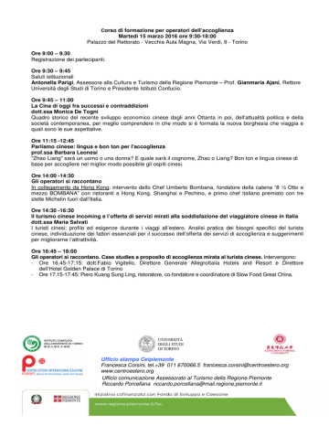 Corso di formazione per operatori dell’accoglienza Martedì 15 marzo 2016 ore 9:30-18:00 Palazzo del Rettorato - Vecchia Aula Magna, Via Verdi, 9 - Torino Ore 9:00 – 9.30 Registrazione dei partecipanti. Ore 9:30 – 9:45 Saluti istituzionali Antonella Parigi, Assessore alla Cultura e Turismo della Regione Piemonte – Prof. Gianmaria Ajani, Rettore Università degli Studi di Torino e Presidente Istituto Confucio. Ore 9:45 – 11:00 La Cina di oggi fra successi e contraddizioni dott.ssa Monica De Togni Quadro storico del recente sviluppo economico cinese dagli anni Ottanta in poi, dell'attualità politica e della società contemporanea, per meglio comprendere in che modo si è formata la nuova borghesia che viaggia e quali sono le sue aspettative. Ore 11:15 -12:45 Parliamo cinese: lingua e bon ton per l'accoglienza prof.ssa Barbara Leonesi "Zhao Liang" sarà un uomo o una donna? E quale sarà il cognome, Zhao o Liang? Bon ton e lingua cinese di base per accogliere nel miglior modo possibile gli ospiti cinesi. Ore 14:00 -14:30 Gli operatori si raccontano In collegamento da Hong Kong: intervento dello Chef Umberto Bombana, fondatore della catena “8 ½ Otto e mezzo BOMBANA” con ristoranti a Hong Kong, Shanghai e Pechino, e primo chef italiano premiato con tre stelle Michelin fuori dall’Italia. Ore 14:30 -16:30 Il turismo cinese incoming e l’offerta di servizi mirati alla soddisfazione del viaggiatore cinese in Italia dott.ssa Maria Salvati I turisti cinesi: profilo ed esigenze durante i viaggi all’estero. Analisi pratica dei bisogni specifici del turista cinese, individuazione dei fattori essenziali per il successo dell’offerta dei servizi di accoglienza e suggerimenti per migliorarne l’attrattività. Ore 16:45 – 18:00 Gli operatori si raccontano. Case studies a proposito di accoglienza mirata al turista cinese. Intervengono: - Ore 16.45-17.15: dott.Fabio Vigitello, Direttore Generale AllegroItalia Hotels and Resort e Direttore dell’Hotel Golden Palace di Torino - Ore 17.15-17.45: Piero Kuang Sung Ling, ristoratore, co-fondatore e coordinatore di Slow Food Great China. Ufficio stampa Ceipiemonte Francesca Corsini, tel.+39 011 670066.5 [email protected] www.centroestero.org Ufficio comunicazione Assessorato al Turismo della Regione Piemonte Riccardo Porcellana [email protected] Corso di formazione per operatori dell’incoming Mercoledì 16 marzo 2016 ore 9:30-18:00 Cavallerizza Reale, Sala multifunzione 1 -Via Verdi, 9 - Torino Sono uguali i primi 2 interventi del mattino, sono differenti quelli del pomeriggio Ore 13:45 -15:45 Il turismo cinese incoming e l'Italia dott.ssa Maria Salvati Introduzione ai flussi turistici cinesi verso i paesi dell’area Schengen, tipologie e caratteristiche dei viaggi in Italia (durata, mete conosciute e/o preferite), promozione e vendita di pacchetti turistici sul mercato cinese. Esempi di itinerari di viaggio in Italia. Ore 16:00 – 17:45 Il turismo cinese incoming e il Piemonte dott.ssa Monica Corgnati Presentazione di strumenti mirati all'accoglienza dei sempre più numerosi turisti dell’area est-asiatica presenti in Piemonte: ospitalità e business etiquette, in particolare nel settore del lusso. Esempi di Itinerari di viaggio in Piemonte. Ore 17:45 – 18:15 Il turismo cinese incoming e il Piemonte Incontro con Emanuela Moroni, Presidente GIA Piemonte, associazione di categoria Guide, interpreti e accompagnatori turistici. Ufficio stampa Ceipiemonte Francesca Corsini, tel.+39 011 670066.5 [email protected] www.centroestero.org Ufficio comunicazione Assessorato al Turismo della Regione Piemonte Riccardo Porcellana [email protected]