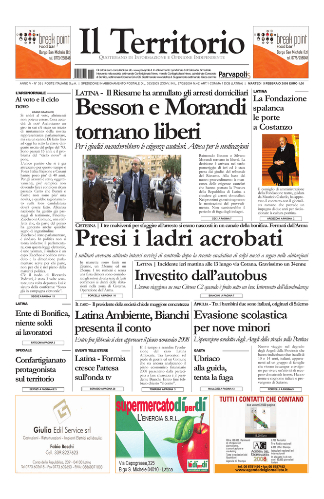 Il Territorio QUOTIDIANO DI INFORMAZIONE E OPINIONE INDIPENDENTE Gli articoli sono consultabili sul sito www.parvapolis.it. In abbinamento: quindicinale 6 di Sabaudia; bimestrale Intervento nella società; settimanale Confartigianato News, mensile Confagricoltura News, quindicinale Consorzio di Bonifica, settimanale Cronana Q4 e Q5; bisettimanale www.telefree.it. Supplemento settimanale Gioca con Noi Besson e Morandi tornano liberi LATINA - Il Riesame ha annullato gli arresti domiciliari ANNO V - N° 35 | POSTE ITALIANE S.p.A. | SPEDIZIONE IN ABBONAMENTO POSTALE D.L. 353/2003 (CONV. IN L. 27/02/2004 N.46) ART.1 COMMA 1 DCB (LATINA) | MARTEDÌ 5 FEBBRAIO 2008 EURO 1,00 L’ARCINORMALE Al voto e il ciclo novo LIDANO GRASSUCCI Si andrà al voto, altrimenti non poteva essere. Cosa accadrà da noi? Archiviamo un giro in cui c’è stato un inizio di mutamento della nostra rappresentanza parlamentare, ma era un cenno. Di fatto fino ad oggi ha retto la classe dirigente uscita dal golpe del ’93. Sono passati 15 anni e il problema del “ciclo novo” si pone. L’unico partito che si è già attrezzato per questo tempo è Forza Italia: Fazzone e Cusani hanno poco piu’ di 40 anni. Per gli azzurri è stato, oggettivamente, piu’ semplice non dovendo fare i conti con alcun passato. Certo che Burani e Conte non sono piu’ una novità, e qualche ragionamento sulla loro candidatura dovrà essere fatto. Alleanza nazionale ha gestito già passaggi di testimone, FinestraZaccheo in Comune, una staffetta che, da parte del primo ha generato anche qualche segno di ingratitudine. Zaccheo è stato parlamentare, è sindaco. In politica non si torna indietro: il parlamentare, con questa legge elettorale, è uno yesman, il sindaco è un capo. Zaccheo è politico avveduto e la dimensione parlamentare serve per chi parte, non per chi è nel pieno della maturità politica. C’è il nodo di Riccardo Pedrizzi, è stato 3 volte senatore, una volta deputato. Lui è sicuro della conferma: “Sono già in campagna elettorale”. SEGUE A PAGINA 15 LATINA Ente di Bonifica, niente soldi ai lavoratori FATICONI A PAGINA 3 SPECIALE Confartigianato protagonista sul territorio SERVIZI A PAGINA 4 E 5 Per i giudici mancherebbero le esigenze cautelari. Attesa per le motivazioni Raimondo Besson e Silvano Morandi tornano in libertà. La decisione è arrivata nel tardo pomeriggio di ieri ed è stata presa dai giudici del tribunale del Riesame. Alla base del nuovo provvedimento la mancanza delle esigenze cautelari che hanno portato la Procura della Repubblica di Latina a chiedere gli arresti domiciliari. Nei prossimi giorni si sapranno le motivazioni del provvedimento. Non sussisterebbe il pericolo di fuga degli indagati. La Fondazione spalanca le porte a Costanzo LATINA Il consiglio di amministrazione della Fondazione teatro, guidata da Maurizio Galardo, ha approvato il contratto con il giornalista romano che prevede un impegno di due anni per rivoluzionare la cultura pontina. Presi i ladri acrobati CECI A PAGINA 7 ARDIZZONI A PAGINA 2 CISTERNA | I tre malviventi per sfuggire all’arresto si erano nascosti in un canale della bonifica. Fermati dall’Arma I militari avevano attivato intensi servizi di controllo dopo la recente escalation di colpi messi a segno nelle abitazioni In manette sono finiti un 22enne, un 33enne ed un 23enne. I tre rumeni e senza una fissa dimora sono considerati gli autori di una serie di furti commessi ai danni delle abitazioni nella zona di Cisterna. Operazione dell’Arma. PORCELLI A PAGINA 10 Investito dall’autobus LATINA | Incidente ieri mattina alle 13 lungo via Corana. Gravissimo un 34enne L’uomo viaggiava su una Citroen C2 quando è finito sotto un bus. Interevento dell’eliambulanza BIANCONI A PAGINA 7 Latina Ambiente, Bianchi Evasione scolastica per nove minori presenta il conto IL CASO - Il presidente della società chiede maggiore concretezza APRILIA - Tra i bambini due sono italiani, originari di Salerno Entro fine febbraio si deve approvare il piano economico 2008 L’operazione condotta dagli Angeli della strada sulla Pontina Latina - Formia cresce l’attesa sull’onda tv EVENTI TELE ETERE SERVIZIO A PAGINA 28 E’ il tempo a scandire l’evoluzione del caso Latina Ambiente. Tra lavoratori sul piede di guerra ed un Comune che sta ancora analizzando il piano economico finanziario 2008 presentato dalla partecipata a fare chiarezza è il presidente Bianchi. Entro fine febbraio chiesto “il conto”. TOMASINI A PAGINA 3 Ubriaco alla guida, tenta la fuga GAETA MALLOZZI A PAGINA 13 Nuovo viaggio nel degrado degli Angeli della Provincia che hanno individuato due fratelli di 10 e 14 anni, italiani, appartenenti ad un gruppo di famiglie che vivono in camper e svolgono per vivere un’attività di recupero di materiali ferrosi. Hanno nome e cognome italiani e provengono da Salerno. PORCELLI A PAGINA 9 PAGINA 2 Il Territorio POLITICA | MARTEDÌ 5 FEBBRAIO 2008 Costanzo apre il sipario su Latina LATINA - Il consiglio di amministrazione della Fondazione ha approvato il contratto biennale con il giornalista romano Il compenso stabilito è di 100 mila euro lordi, comprensivi della consulenza ai "grandi eventi". Il progetto della rinascita del teatro è arrivato alla fase conclusiva. Si riparte dai contenuti lasciando in disparte un’ immagine sinora legata più ad un nome che ad una stagione di eccellenze ROBERTA ARDIZZONI Il teatro D’Annunzio torna ad essere una pagina bianca su cui Maurizio Costanzo, con il supporto del presidente della Fondazione Maurizio galardo e del sindaco Zaccheo, potrà scrivere una storia che partendo dalle tradizioni Latina potrà ampliare I propri orizzonti a livello regionale e nazionale. Il consiglio di amministrazione ha approvato ieri il contratto del nuovo direttore artistico già concordato tra i legali del noto giornalista e quelli dell'amministrazione comunale. Una sferzata di adrenalina per la cultura made in Latina dopo anni di sofferenza e di potenziali