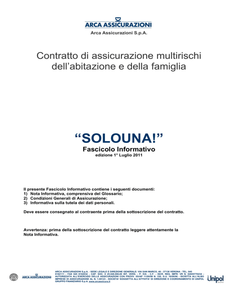 Arca Assicurazioni S.p.A. Contratto di assicurazione multirischi dell’abitazione e della famiglia “SOLOUNA!” Fascicolo Informativo edizione 1° Luglio 2011 Il presente Fascicolo Informativo contiene i seguenti documenti: 1) Nota Informativa, comprensiva del Glossario; 2) Condizioni Generali di Assicurazione; 3) Informativa sulla tutela dei dati personali. Deve essere consegnato al contraente prima della sottoscrizione del contratto. Avvertenza: prima della sottoscrizione del contratto leggere attentamente la Nota Informativa. ARCA ASSICURAZIONI S.p.A. - SEDE LEGALE E DIREZIONE GENERALE: VIA SAN MARCO, 48 - 37138 VERONA - TEL. 045 8182111 - FAX 045 8102034 - CAP. SOC. € 25.026.000,00 INT. VERS. - P. IVA - C.F. - ISCR. REG. IMPR. VR N. 02655770234 AUTORIZZATA ALL'ESERCIZIO DELLE ASSICURAZIONI CON PROVV. ISVAP 11/09/96 N. 330, G.U. 18/09/96 - ISCRITTA ALL'ALBO IMPRESE DI ASSICURAZIONE AL N. 1.00123 - SOCIETA' SOGGETTA ALL'ATTIVITA' DI DIREZIONE E COORDINAMENTO DI UNIPOL GRUPPO FINANZIARIO S.p.A. www.arcassicura.it Arca Assicurazioni S.p.A. “SOLOUNA!” 1) Nota Informativa, comprensiva del Glossario Indice: • Nota Informativa • Glossario p. 2 p. 8 Nota Informativa, comprensiva del glossario “SOLOUNA!” - Pagina 1 di 10 aggiornato al 1° Luglio 2011 Nota Informativa NOTA INFORMATIVA La presente Nota Informativa è redatta secondo lo schema predisposto dall’ISVAP, ma il suo contenuto non è soggetto alla preventiva approvazione dell’ISVAP. La presente Nota Informativa viene consegnata da Arca Assicurazioni S.p.A. a tutti coloro che intendono stipulare il contratto “SOLOUNA!” al fine di illustrarne le caratteristiche in conformità con quanto previsto dal D. Lgs. n. 209/2005 e relativi regolamenti attuativi. La invitiamo pertanto a leggere con attenzione tutte le indicazioni della presente Nota Informativa e delle relative Condizioni di Assicurazione, prima della sottoscrizione della polizza. I titoli delle clausole e le parti che prevedono oneri e obblighi a carico del contraente e dell'assicurato, nullità, decadenze, esclusioni, sospensioni e limitazioni della garanzia, rivalse, nonché le informazioni qualificate come “Avvertenze” sono evidenziati in questo modo e sono da leggere con particolare attenzione. Per consultare gli aggiornamenti delle informazioni contenute nella presente Nota Informativa e nel Fascicolo Informativo non derivanti da innovazioni normative si rinvia al sito internet: www.arcassicura.com. Arca Assicurazioni S.p.A. comunicherà per iscritto al contraente le modifiche derivanti da future innovazioni normative. Per ogni chiarimento, Arca Assicurazioni le ha messo a disposizione il numero verde 800-849089 per darle tutte le risposte necessarie. La Nota Informativa si articola in tre sezioni: A. INFORMAZIONI SULL'IMPRESA DI ASSICURAZIONE B. INFORMAZIONI SUL CONTRATTO C. INFORMAZIONI SULLE PROCEDURE LIQUIDATIVE E SUI RECLAMI A. Informazioni sull’impresa di assicurazione 1. Informazioni Generali a) Arca Assicurazioni S.p.A. è una società soggetta all’attività di direzione e coordinamento di Unipol Gruppo Finanziario S.p.A. b) Sede Legale e Direzione Generale in Italia, Via San Marco, 48 - 37138 Verona c) Recapito telefonico. 045.8182111; Sito Internet www.arcassicura.com; posta elettronica [email protected]. d) Arca Assicurazioni S.p.A. è stata autorizzata all’esercizio dell’attività assicurativa con Provvedimento ISVAP n. 330 dell’11 settembre 1996 (G.U. n. 219 del 18/09/1996) ed è iscritta all’Albo delle imprese assicurative al numero 1.00123. 2. Informazioni sulla situazione patrimoniale dell’impresa Le informazioni che seguono sono relative all’ultimo bilancio approvato relativo all’esercizio 2010. Patrimonio netto pari a 38,3 milioni di euro. Capitale sociale 25,0 milioni di euro. Totale riserve patrimoniali 26,5 milioni di euro. Indice di solvibilità pari a 1,19; tale indice rappresenta il rapporto tra l’ammontare del margine di solvibilità disponibile pari a 38.336 migliaia di euro e l’ammontare del margine di solvibilità richiesto dalla normativa vigente pari a 32.095 migliaia di euro. Nota Informativa, comprensiva del glossario “SOLOUNA!” - Pagina 2 di 10 aggiornato al 1° Luglio 2011 Nota Informativa B. Informazioni sul contratto Avvertenza: il prodotto è a tacito rinnovo pertanto, in mancanza di disdetta, da comunicarsi mediante lettera raccomandata almeno 30 giorni prima della scadenza del contratto, il contratto è prorogato per un anno e così successivamente (art. 4 delle Condizioni Generali di Assicurazione, di seguito denominate CGA). E’ opzionabile il non tacito rinnovo con conseguente decadenza della garanzia automaticamente alle ore 24:00 della data di scadenza contratto indicata in polizza. 3. Coperture assicurative offerte – Limitazioni ed esclusioni “Solouna!” è una copertura assicurativa multirischi: - dei danni materiali all’abitazione e suo contenuto, quali ad esempio danni da Incendio del fabbricato e del contenuto, Furto del contenuto, Eventi atmosferici e altri danni; - dei danni ai terzi riconducibili alla responsabilità civile delle conseguenze di fatti della vita privata dell’assicurato e dei componenti della sua famiglia di diritto e di fatto; - dei danni fisici alle persone componenti la famiglia di diritto e di fatto dell’assicurato purché nominativamente individuati, a seguito di infortunio occorso nella vita privata; - del danno economico da infortunio occorso alle persone assicurate componenti la famiglia di diritto e di fatto dell’assicurato, purché nominativamente individuati, con conseguente ricovero in struttura ospedaliera, tramite l’erogazione di un importo fisso giornaliero (diaria). Inoltre, per i casi di emergenza legati alla vita privata quali: guasti relativi all’abitazione, necessità di un medico o di consulenze di carattere medico è possibile richiedere l’intervento di un supporto specializzato, tale sezione è stata affidata dalla