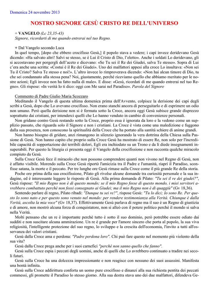 Domenica 24 novembre 2013 NOSTRO SIGNORE GESÙ CRISTO RE DELL'UNIVERSO + VANGELO (Lc 23,35-43) Signore, ricordarti di me quando entrerai nel tuo Regno. + Dal Vangelo secondo Luca In quel tempo, [dopo che ebbero crocifisso Gesù,] il popolo stava a vedere; i capi invece deridevano Gesù dicendo: «Ha salvato altri! Salvi se stesso, se è Lui il Cristo di Dio, l’eletto». Anche i soldati Lo deridevano, gli si accostavano per porgergli dell’aceto e dicevano: «Se Tu sei il Re dei Giudei, salva Te stesso». Sopra di Lui c’era anche una scritta: «Costui è il Re dei Giudei». Uno dei malfattori appesi alla croce Lo insultava: «Non sei Tu il Cristo? Salva Te stesso e noi!». L’altro invece lo rimproverava dicendo: «Non hai alcun timore di Dio, tu che sei condannato alla stessa pena? Noi, giustamente, perché riceviamo quello che abbiamo meritato per le nostre azioni; Egli invece non ha fatto nulla di male». E disse: «Gesù, ricordati di me quando entrerai nel tuo Regno». Gli rispose: «In verità Io ti dico: oggi con Me sarai nel Paradiso». Parola del Signore Commento di Padre Giulio Maria Scozzaro Meditando il Vangelo di questa ultima domenica prima dell'Avvento, colpisce la derisione dei capi degli scribi a Gesù, dopo che Lo avevano crocifisso. Non erano stanchi ancora di perseguitarlo e di esprimere un odio non umano. Però quella derisione non si è fermata sotto la Croce, ancora oggi Gesù subisce grande disprezzo soprattutto dai cristiani, per intenderci quelli che Lo hanno venduto in cambio di convenienze personali. Non gridano contro Gesù restando sotto la Croce, proprio essa è ignorata da loro e la vedono come un supplizio passato, che riguarda solo il Signore e non i cristiani. La Croce è vista come una maledizione e fuggono dalla sua presenza, non conoscono la spiritualità della Croce che ha portato alla santità schiere di anime grandi. Non hanno bisogno di gridare, anzi rimangono in silenzio ignorando la vera dottrina della Chiesa sulla Passione di Gesù. Non hanno capito che proprio sulla Croce Gesù ha mostrato di essere Re, non solo per l'incredibile capacità di sopportazione dei terribili dolori, Egli era inchiodato su un Trono e da lì diede insegnamenti insuperabili. Per questo la liturgia ci presenta oggi il Vangelo della crocifissione e non racconta qualche miracolo compiuto da Gesù. Sulla Croce Gesù fece il miracolo che non possono comprendere quanti non vivono nel Regno di Gesù, non è affatto visibile. Morendo sulla Croce Gesù riportò l'amicizia tra il Padre e l'umanità, riaprì il Paradiso, sconfisse satana, la morte e il peccato. Per tre lunghe ore Gesù rimase sulla Croce come il più grande Re della storia. Poche ore prima della sua crocifissione, Pilato gli rivolse alcune domande tra curiosità personale e la sua indagine, ed è interessante leggere le risposte di Gesù. Alla prima domanda di Pilato: "Tu sei il re dei giudei?", Gesù rispose: "Il mio Regno non è di questo mondo; se il mio Regno fosse di questo mondo, i miei servitori avrebbero combattuto perché non fossi consegnato ai Giudei; ma il mio Regno non è di quaggiù" (Gv 18,36). Sentendo parlare di regno, Pilato ribadì: "Dunque tu sei re?", rispose Gesù: "Tu lo dici; Io sono Re. Per questo Io sono nato e per questo sono venuto nel mondo: per rendere testimonianza alla Verità. Chiunque è dalla Verità, ascolta la mia voce" (Gv 18,37). Effettivamente Gesù parlava di regno ma il suo è un Regno di giustizia e di amore, non mostrò alcuna forza di conquistatore, non si alleò con il potere politico perchè il mondo si salva nella Verità. Molti pensano che un re è importante perchè tutto è sotto il suo dominio, però potrebbe essere odiato dai sudditi e non suscitare alcuna ammirazione. Un re è grande per l'amore sincero che porta al popolo, la sua viva religiosità, l'intelligente protezione del suo regno, lo sviluppo e la crescita dell'economia, l'invito a tutti all'osservanza dei valori cristiani. Gesù dalla Croce ama e perdona: "Padre perdona loro". Chi può fare questo nel momento più violento della sua vita? Gesù dalla Croce prega anche per i suoi carnefici "perchè non sanno quello che fanno". Gesù sulla Croce espia i peccati degli uomini, anche di quelli che Lo avrebbero continuato a tradire nei secoli futuri. Gesù sulla Croce ha una dolcezza impressionante e non reagisce con nessuno dei suoi assassini. Manifesta una bontà infinita. Gesù sulla Croce addirittura conforta un uomo pure crocifisso e dinanzi alla sua richiesta pentita dei peccati commessi, gli promette il Paradiso lo stesso giorno. Alla sua destra stava uno dei due malfattori, difendeva Ge- sù e rimproverava l'altro ladrone che continuava a dileggiare il Signore. Il malfattore che si era pentito dei suoi peccati, chiese a Gesù una proposta enorme: entrare nel suo Regno con Lui. Illuminato dalla Grazia il peccatore ebbe una contrizione perfetta, il dispiacere dei peccati commessi, il pentimento insieme a un perfetto atto di amore di Dio. È questo atto di amore a permettere questa contrizione che annulla tutti i peccati in quanto alla colpa e alle pene. È abbastanza raro questo perfetto atto di amore e chi lo compie non sa di averlo fatto. Chi non riesce a compierlo per tantissimi motivi, nel pentimento della Confessione compie un atto di contrizione imperfetta «Tra gli atti del penitente, la contrizione occupa il primo posto. Essa è "il dolore dell'animo e la riprovazione del peccato commesso, accompagnati dal proposito di non peccare più in avvenire". Quando proviene dall'amore di Dio amato sopra ogni cosa, la contrizione è detta "perfetta" (contrizione di carità). Tale contrizione rimette le colpe veniali; ottiene anche il perdono dei peccati mortali, qualora comporti la ferma risoluzione di ricorrere, appena possibile, alla confessione sacramentale. La contrizione detta "imperfetta" (o "attrizione") è, anch'essa, un dono di Dio, un impulso dello Spirito Santo. Nasce dalla consideraz
