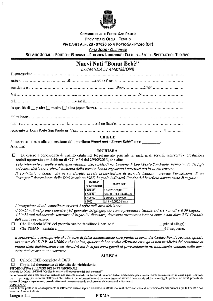 Domanda di ammissione Bonus Bebè