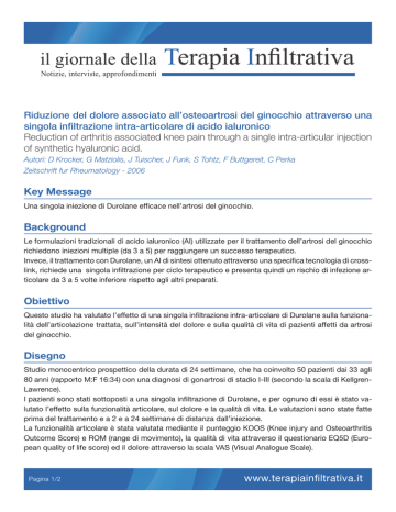 Riduzione del dolore associato all’osteoartrosi del ginocchio attraverso una singola infiltrazione intra-articolare di acido ialuronico Reduction of arthritis associated knee pain through a single intra-articular injection of synthetic hyaluronic acid. Autori: D Krocker, G Matziolis, J Tuischer, J Funk, S Tohtz, F Buttgereit, C Perka Zeitschrift fur Rheumatology - 2006 Key Message Una singola iniezione di Durolane efficace nell’artrosi del ginocchio. Background Le formulazioni tradizionali di acido ialuronico (AI) utilizzate per il trattamento dell’artrosi del ginocchio richiedono iniezioni multiple (da 3 a 5) per raggiungere un successo terapeutico. Invece, il trattamento con Durolane, un AI di sintesi ottenuto attraverso una specifica tecnologia di crosslink, richiede una singola infiltrazione per ciclo terapeutico e presenta quindi un rischio di infezione articolare da 3 a 5 volte inferiore rispetto agli altri preparati. Obiettivo Questo studio ha valutato l’effetto di una singola infiltrazione intra-articolare di Durolane sulla funzionalità dell’articolazione trattata, sull’intensità del dolore e sulla qualità di vita di pazienti affetti da artrosi del ginocchio. Disegno Studio monocentrico prospettico della durata di 24 settimane, che ha coinvolto 50 pazienti dai 33 agli 80 anni (rapporto M:F 16:34) con una diagnosi di gonartrosi di stadio I-III (secondo la scala di KellgrenLawrence). I pazienti sono stati sottoposti a una singola infiltrazione di Durolane, e per ognuno di essi è stato valutato l’effetto sulla funzionalità articolare, sul dolore e la qualità di vita. Le valutazioni sono state fatte prima del trattamento e a 2 e a 24 settimane di distanza dall’iniezione. La funzionalità articolare è stata valutata mediante il punteggio KOOS (Knee injury and Osteoarthritis Outcome Score) e ROM (range di movimento), la qualità di vita attraverso il questionario EQ5D (European quality of life score) ed il dolore attraverso la scala VAS (Visual Analogue Scale). Pagina 1/2 www.terapiainfiltrativa.it Risultati La percezione soggettiva della funzionalità articolare e la qualità di vita sono risultate migliorate già dopo 2 settimane di trattamento e tutti i parametri valutati sono migliorati in modo significativo nelle 22 settimane successive. Infatti, alla prima visita di follow-up non si è riscontrata una diminuzione significativa del dolore; ma a 24 settimane si è invece osservata una riduzione significativa della sintomatologia dolorosa rispetto alla situazione di partenza (-25%, p<0,001). (Figura 1) Il trattamento con Durolane ha, inoltre, determinato un miglioramento significativo di tutti i parametri presi in esame nel questionario KOOS, già alla prima visita. Inoltre, alla fine del follow-up si sono registrati progressi considerevoli in merito alle attività quotidiane e alla qualità di vita (rispettivamente del 19% e 56% rispetto al basale; p>0,001) che è risultata migliorata anche secondo la scala EQD, con un incremento del 21 e del 36% rispettivamente a 2 e 24 settimane (p<0,001). Figura 1 100 VAS (mm) 75 50 * 25 0 Valutazione del dolore tramite Scala Visiva Analogica al baseline ed alle visite di controllo. Prima della terapia A 2 settimane A 24 settimane A 24 settimane dall’iniezione si è poi osservato un aumento del ROM attivo, passato da 109° a 115° (p=0,006). Il cross-link caratteristico del prodotto ne aumenta l’emivita e ne consente quindi l’utilizzo in monosomministrazione, a tutto vantaggio anche della sicurezza e della tollerabilità, come dimostrato dalla bassa percentuale di complicanze osservata nello studio (gonfiore nel 18% dei casi) e dall’assenza di complicanze gravi, reazioni allergiche e fenomeni di sensibilizzazione. Conclusioni I dati di questo studio dimostrano che l’azione di Durolane si manifesta in modo relativamente lento, ma duraturo, grazie ad un effetto legato alla sua degradazione nettamente più lenta rispetto a quella delle altre preparazioni di AI non cross-linkate. Una singola iniezione intra-articolare di Durolane si è dimostrata efficace nella riduzione del dolore e degli altri sintomi legati all’artrosi del ginocchio, ed è caratterizzata da un miglior rapporto rischio-beneficio rispetto alle altre preparazioni di acido ialuronico disponibili in commercio che richiedono un maggior numero di infiltrazioni per ciclo terapeutico. Durolane appare superiore anche al trattamento con glucocorticoidi, perché, sebbene agisca più lentamente, l’effetto di riduzione del dolore ottenuto è più duraturo nel tempo, inoltre, richiedendo una sola iniezione, esso è preferibile e più vantaggioso sia rispetto alle preparazioni tradizionali di AI (basso e medio peso molecolare, non cross-linkate) sia ai glucocorticoidi. Pagina 2/2 www.terapiainfiltrativa.it