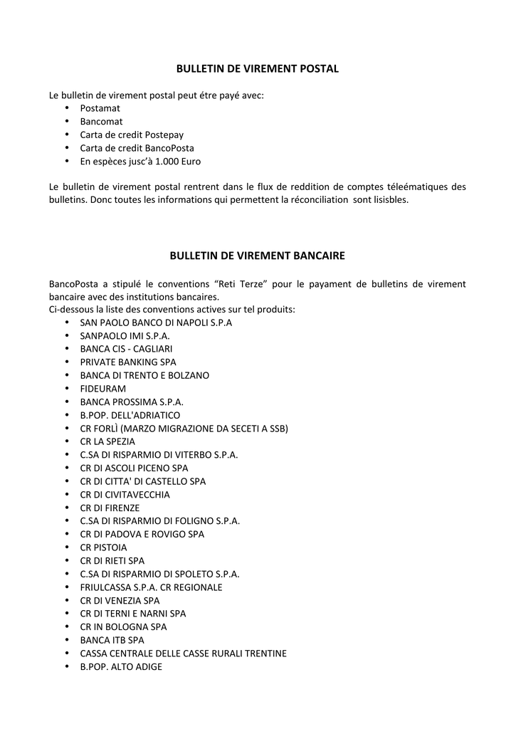BULLETIN DE VIREMENT POSTAL Le bulletin de virement postal peut étre payé avec: • Postamat • Bancomat • Carta de credit Postepay • Carta de credit BancoPosta • En espèces jusc’à 1.000 Euro Le bulletin de virement postal rentrent dans le flux de reddition de comptes téleématiques des bulletins. Donc toutes les informations qui permettent la réconciliation sont lisisbles. BULLETIN DE VIREMENT BANCAIRE BancoPosta a stipulé le conventions “Reti Terze” pour le payament de bulletins de virement bancaire avec des institutions bancaires. Ci-‐dessous la liste des conventions actives sur tel produits: • SAN PAOLO BANCO DI NAPOLI S.P.A • SANPAOLO IMI S.P.A. • BANCA CIS -‐ CAGLIARI • PRIVATE BANKING SPA • BANCA DI TRENTO E BOLZANO • FIDEURAM • BANCA PROSSIMA S.P.A. • B.POP. DELL'ADRIATICO • CR FORLÌ (MARZO MIGRAZIONE DA SECETI A SSB) • CR LA SPEZIA • C.SA DI RISPARMIO DI VITERBO S.P.A. • CR DI ASCOLI PICENO SPA • CR DI CITTA' DI CASTELLO SPA • CR DI CIVITAVECCHIA • CR DI FIRENZE • C.SA DI RISPARMIO DI FOLIGNO S.P.A. • CR DI PADOVA E ROVIGO SPA • CR PISTOIA • CR DI RIETI SPA • C.SA DI RISPARMIO DI SPOLETO S.P.A. • FRIULCASSA S.P.A. CR REGIONALE • CR DI VENEZIA SPA • CR DI TERNI E NARNI SPA • CR IN BOLOGNA SPA • BANCA ITB SPA • CASSA CENTRALE DELLE CASSE RURALI TRENTINE • B.POP. ALTO ADIGE • • • • • • • • • • • • • • • • • • • • • • • • • • • • • • • • • • • • • • • • • • • • • • UNICREDIT BANCA BANCA CR FIRENZE SPA BANCA CARIGE SPA CASSA DI RISPARMIO DI GENOVA E IMPERIA IW BANK SPA BANCA REGGIANA CREDITO COOPERATIVO CREDITO COOPERATIVO BOLOGNESE S.C. BANCA MEDIOLANUM S.P.A. CASSA DI RISPARMIO DI CARRARA BANCA MONTE LUCCA CASSA DI RISPARMIO DI SAVONA BANCA CESARE PONTI BANCA ROMAGNA CENTRO SOC. COOPERATIVA CASSA DI RISPARMIO DI PISTOIA E PESCIA SPA CASSA DI RISPARMIO DI ORVIETO CASSA DI RISPARMIO DELLA SPEZIA BANCA DI CESENA-‐CREDITO COOPERATIVO DI CESENA E RONTA CASSA DI RISPARMIO DI CIVITAVECCHIA BANCA REALE S.P.A. UNIPOL BANCA S.P.A. BANCA DI FORLÌ CREDITO COOPERATIVO CASSA DI RISPARMIO DI BRA BANCA MONTE DEI PASCHI DI SIENA ROMAGNA EST BANCA DI CREDITO COOPERATIVO BANCA DEL CANAVESE -‐ CREDITO COOPERATIVO DI VISCHE SC CREDITO COOPERATIVO REGGIANO SOC. COOPERATIVA CASSA DI RISPARMIO DI SAVIGLIANO CASSA RURALE ED ARTIGIANA BOVES BANCA DI CARAGLIO, DEL CUNEESE E DELLA RIVIERA DEI FIORI BANCA DI CREDITO COOPERATIVO VALDOSTANA B.C.C. DI CASALGRASSO E SANT'ALBANO STURA BANCA DI CREDITO COOPERATIVO DI CHERASCO BANCA DI CREDITO COOPERATIVO DI BENE VAGIENNA BANCA DI CREDITO COOPERATIVO DI CASTENASO CREDITO EMILIANO BANCA DI CREDITO COOPERATIVO DI ALBA, LANGHE E ROERO BANCA CREDITO COOPERATIVO PIANFEI E ROCCA DE'BALDI BANCA DI CREDITO COOPERATIVO DI MACERONE BANCA DEL CILENTO BANCA DI LEGNANO SELLA HOLDING BANCA CASSA DI RISPARMIO DI ALESSANDRIA BANCA POPOLARE DI MILANO CASSA DI RISPARMIO DI SAN MINIATO BANCA DEL LAVORO E DEL PICCOLO RISPARMIO BANCA DI PIACENZA BANCA DI CREDITO COOPERATIVO DI GATTEO • • • • • • • • • • • • • • • • • • • • • • • • • • • • • • • • • • • • • • • • • • • • • • BNL ISTITUTO DI MONETA ELETTRONICA EUROPEO BANCA DI CREDITO COOPERATIVO DI MONTERENZIO SC BANCA BSI ITALIA SPA FINDOMESTIC BANCA SPA BANCA DI CREDITO COOPERATIVO DI SAN MARZANO DI S.G. BANCA POPOLARE DI FONDI CREDITO COOPERATIVO REGGIANO TELECOM ITALIA SPA BANCA DI VERONA CCCADIDAVID SCPA CASSA DI RISPARMIO DI CESENA DEUTSCHE BANK BANCA DI CAVOLA E SASSUOLO BANCA POPOLARE PUGLIESE BANCA ALPI MARITTIME CREDITO COOPERATIVO CARRU' BANCA POPOLARE DEL LAZIO CREDITO DI RIMAGNA SPA B.C.C. DEL BELICE BANCA DI BOLOGNA CREDITO COOPERATIVO BCC LERCARA FRIDDI FINECOBANK BANCA GENERALI SPA BANCA POPOLARE DI SPOLETO SPA BANCA POPOLARE DI BARI BANCA AGRICOLA POPOLARE DI RAGUSA BANCA SANTA GIULIA SPA BANCA DI CREDITO COOPERATIVO S. MARCO BENACO BANCA CERD. COOP. COSTERMANO FLASHBANK SPA CARICHIETI BANCA ITB BANCA SVILUPPO ECONOMICO CASSA DI RISPARMIO DELLA PROVINCIA DI TERAMO CASSA DI RISPARMIO DI CENTO CASSA DI RISPARMIO DI FERRARA BANCO DESIO VENETO BANCO DESIO TOSCANA BANCO DI DESIO E DELLA BRIANZA BANCO DESIO LAZIO BANCA DI CREDITO COOPERATIVO DI SALA DI CESENATICO S.C. CASSA RISPARMIO RAVENNA S.P.A. BANCA DI CREDITO COOPERATIVO VALMARECCHIA BANCA POPOLARE DI MANTOVA S.P.A. WEBANK S.P.A. BANCA DI ROMAGNA S.P.A.-‐ EASY NET CASSA DEI RISPARMI DI MILANO E DELLA LOMBARDIA S.P.A. • • • • • • • • • • • • • • • • • • • • BANCA DI IMOLA S.P.A. RAIFFEISENKASSE MERAN GEN.M.B.H. BANCA COOPERATIVA VALSABBINA BANCO DI LUCCA E DEL TIRRENO SPA BANCA FEDERICO DEL VECCHIO S.P.A. COGETECH S.P.A. BANCA ETRURIA SAFO SISTEMI S.R.L. BANCA AGRICOLA MANTOVANA BANCA DI CREDITO COOPERATIVO GENOVESE BANCA TOSCANA CREDIPLUS SOCIETA' FINANZIARIA BANCA DI CREDITO COOPERATIVO DEI CASTELLI ROMANI OLSA INFORMATICA FIN PRESTO ING DIRECT N.V. EMILBANCA BANCA DEL PIEMONTE SPA BANCA PASSADORE & C. SPA BANCA DELLA PROVINCIA DI MACERATA S.P.A. Le bulletin de virement bancaire rentrent dans le flux de reddition de comptes téleématiques des bulletins. Donc toutes les informations qui permettent la réconciliation sont lisisbles. BULLETIN PAYE AU BUREAU DE TABAC Le bulletin peut étre payé également dans les bureaus de tabac afiliés à la banque ITB. Qui son munis de téerminal habilité. Le payement est géré en temps réel avec émission d’un reçu semblale à celui de notre bulletin (comprenant le timbre) . Le bulletin payé de cette façon rentrent dans le flux de reddition de comptes téleématiques des bulletins. Donc toutes les informations qui permettent la réconciliation sont lisisbles