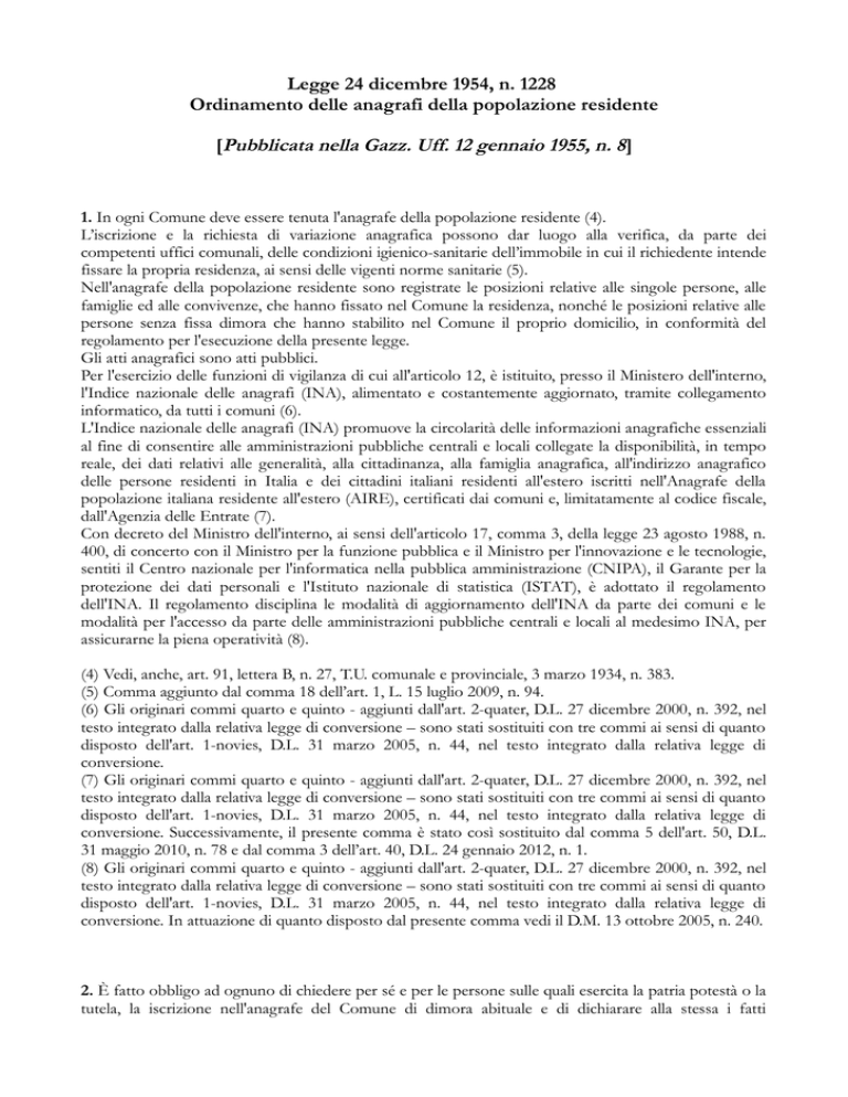 Legge 24 dicembre 1954, n. 1228 Ordinamento delle anagrafi della popolazione residente [Pubblicata nella Gazz. Uff. 12 gennaio 1955, n. 8] 1. In ogni Comune deve essere tenuta l'anagrafe della popolazione residente (4). L’iscrizione e la richiesta di variazione anagrafica possono dar luogo alla verifica, da parte dei competenti uffici comunali, delle condizioni igienico-sanitarie dell’immobile in cui il richiedente intende fissare la propria residenza, ai sensi delle vigenti norme sanitarie (5). Nell'anagrafe della popolazione residente sono registrate le posizioni relative alle singole persone, alle famiglie ed alle convivenze, che hanno fissato nel Comune la residenza, nonché le posizioni relative alle persone senza fissa dimora che hanno stabilito nel Comune il proprio domicilio, in conformità del regolamento per l'esecuzione della presente legge. Gli atti anagrafici sono atti pubblici. Per l'esercizio delle funzioni di vigilanza di cui all'articolo 12, è istituito, presso il Ministero dell'interno, l'Indice nazionale delle anagrafi (INA), alimentato e costantemente aggiornato, tramite collegamento informatico, da tutti i comuni (6). L'Indice nazionale delle anagrafi (INA) promuove la circolarità delle informazioni anagrafiche essenziali al fine di consentire alle amministrazioni pubbliche centrali e locali collegate la disponibilità, in tempo reale, dei dati relativi alle generalità, alla cittadinanza, alla famiglia anagrafica, all'indirizzo anagrafico delle persone residenti in Italia e dei cittadini italiani residenti all'estero iscritti nell'Anagrafe della popolazione italiana residente all'estero (AIRE), certificati dai comuni e, limitatamente al codice fiscale, dall'Agenzia delle Entrate (7). Con decreto del Ministro dell'interno, ai sensi dell'articolo 17, comma 3, della legge 23 agosto 1988, n. 400, di concerto con il Ministro per la funzione pubblica e il Ministro per l'innovazione e le tecnologie, sentiti il Centro nazionale per l'informatica nella pubblica amministrazione (CNIPA), il Garante per la protezione dei dati personali e l'Istituto nazionale di statistica (ISTAT), è adottato il regolamento dell'INA. Il regolamento disciplina le modalità di aggiornamento dell'INA da parte dei comuni e le modalità per l'accesso da parte delle amministrazioni pubbliche centrali e locali al medesimo INA, per assicurarne la piena operatività (8). (4) Vedi, anche, art. 91, lettera B, n. 27, T.U. comunale e provinciale, 3 marzo 1934, n. 383. (5) Comma aggiunto dal comma 18 dell’art. 1, L. 15 luglio 2009, n. 94. (6) Gli originari commi quarto e quinto - aggiunti dall'art. 2-quater, D.L. 27 dicembre 2000, n. 392, nel testo integrato dalla relativa legge di conversione – sono stati sostituiti con tre commi ai sensi di quanto disposto dell'art. 1-novies, D.L. 31 marzo 2005, n. 44, nel testo integrato dalla relativa legge di conversione. (7) Gli originari commi quarto e quinto - aggiunti dall'art. 2-quater, D.L. 27 dicembre 2000, n. 392, nel testo integrato dalla relativa legge di conversione – sono stati sostituiti con tre commi ai sensi di quanto disposto dell'art. 1-novies, D.L. 31 marzo 2005, n. 44, nel testo integrato dalla relativa legge di conversione. Successivamente, il presente comma è stato così sostituito dal comma 5 dell'art. 50, D.L. 31 maggio 2010, n. 78 e dal comma 3 dell’art. 40, D.L. 24 gennaio 2012, n. 1. (8) Gli originari commi quarto e quinto - aggiunti dall'art. 2-quater, D.L. 27 dicembre 2000, n. 392, nel testo integrato dalla relativa legge di conversione – sono stati sostituiti con tre commi ai sensi di quanto disposto dell'art. 1-novies, D.L. 31 marzo 2005, n. 44, nel testo integrato dalla relativa legge di conversione. In attuazione di quanto disposto dal presente comma vedi il D.M. 13 ottobre 2005, n. 240. 2. È fatto obbligo ad ognuno di chiedere per sé e per le persone sulle quali esercita la patria potestà o la tutela, la iscrizione nell'anagrafe del Comune di dimora abituale e di dichiarare alla stessa i fatti determinanti mutazione di posizioni anagrafiche, a norma del regolamento, fermo restando, agli effetti dell'art. 44 del Codice civile, l'obbligo di denuncia del trasferimento anche all'anagrafe del Comune di precedente residenza. L'assenza temporanea dal Comune di dimora abituale non produce effetti sul riconoscimento della residenza. Ai fini dell’obbligo di cui al primo comma, la persona che non ha fissa dimora si considera residente nel comune dove ha stabilito il proprio domicilio. La persona stessa, al momento della richiesta di iscrizione, è tenuta a fornire all’ufficio di anagrafe gli elementi necessari allo svolgimento degli accertamenti atti a stabilire l’effettiva sussistenza del domicilio. In mancanza del domicilio, si considera residente nel comune di nascita (9). È comunque istituito, senza nuovi o maggiori oneri a carico del bilancio dello Stato, presso il Ministero dell’interno un apposito registro nazionale delle persone che non hanno fissa dimora. Con decreto del Ministro dell’interno, da adottare nel termine di centottanta giorni dalla data di entrata in vigore della presente disposizione, sono stabilite le modalità di funzionamento del registro attraverso l’utilizzo del sistema INA-SAIA (10). Ai fini dell'obbligo di cui al primo comma, la persona che non ha fissa dimora si considera residente nel Comune ove ha il domicilio, e in mancanza di questo, nel Comune di nascita. Per i nati all'estero si considera Comune di residenza quello di nascita del padre o, in mancanza, quello della madre. Per tutti gli altri, soggetti all'obbligo della residenza, ai quali non possano applicarsi i criteri sopra indicati, è istituito apposito registro presso il Ministero dell'interno. Il personale diplomatico e consolare straniero, nonché il personale straniero da esso dipendente, non sono soggetti all'obbligo dell'iscrizione anagrafica. (9) Comma così sostituito dal comma 38 dell’art. 3, L. 15 luglio 2009, n. 
