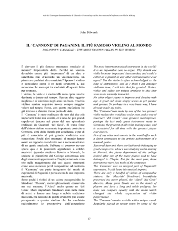 Atti del Convegno Internazionale di Liuteria - Proceedings of the International Conference on Violin Making John Dilworth IL ‘CANNONE’ DI PAGANINI: IL PIÙ FAMOSO VIOLINO AL MONDO PAGANINI’S ‘CANNONE’: THE MOST FAMOUS VIOLIN IN THE WORLD È davvero il più famoso strumento musicale al mondo? Impossibile dirlo. Perché un violino dovrebbe essere più ‘importante’ di un altro e sarebbero mai d’accordo un violoncellista, un pianista o qualsiasi altro musicista? Spesso il violino è conosciuto come il re degli strumenti e, dal momento che sono qui tra violinisti, dò questo fatto per scontato. I violini, le viole e i violoncelli sono opere uniche destinate a durare nel tempo. Nessun altro oggetto migliora e si valorizza negli anni; un buon, vecchio violino sembra acquisire invece sempre maggior valore nel tempo. Forse, con questa prefazione ho già iniziato a chiarire il mio punto di vista. Il ‘Cannone’ è stato realizzato da uno dei due più importanti liutai mai esistiti, ed è uno dei più grandi capolavori (ancora nel pieno del suo splendore) realizzati da Guarneri ‘del Gesù’. Si tratta forse dell’ultimo violino veramente importante costruito a Cremona, città della liuteria per eccellenza, e per di più è associato al più grande violinista mai conosciuto. Pochi altri strumenti al mondo hanno avuto un rapporto così diretto con i successi artistici di un genio musicale. Sebbene si possono trovare sparsi qua e là pianoforti appartenuti a celebri musicisti (quando studiavo liuteria a Newark, la sezione di pianoforte del College conservava uno degli strumenti appartenuti a Chopin) è tuttavia vero che nella maggioranza dei casi questi strumenti erano solo un mezzo per il compositore. Al contrario il ‘Cannone’ era parte integrante del modo di esprimersi di Paganini e porta ancora la sua impronta musicale. Sono pochi i violini di un valore paragonabile: lo Stradivari ‘Messia’, meravigliosamente conservato ma mai suonato, l’‘Alard’ anche questo un ‘del Gesù’. Molti importanti Stradivari sono nelle mani di artisti e hanno una lunga e nobile tradizione musicale, ma nessuno di questi strumenti può essere paragonato a questo violino che ha cambiato radicalmente le prospettive dell’esecuzione The most important musical instrument in the world? It is an impossible case to argue. Why should one violin be more ‘important’ than another, and would a cellist or a pianist or any other instrumentalist ever agree? But the violin is often acknowledged as the king of instruments, and as I think I am amongst violinists here, I will take that for granted. Violins, violas and cellos are unique artefacts in that they seem to be virtually immortal. No other object seems to improve and develop with age. A great old violin simply seems to get greater and greater. So perhaps in a very basic way, I have already made my point. The ‘Cannone’ was made by one of the two greatest violin makers the world has so far seen, and is one of Guarneri ‘del Gesù’s’ own greatest masterpieces, perhaps the last truly great instrument made in Cremona, the greatest of all violin making cities, and is associated for all time with the greatest player ever known. Few if any other instruments in the world offer such a direct connection to the artistic achievement of a musical genius. Scattered here and there are keyboards belonging to great composers; while I was studying violin making at Newark, the piano department of the college looked after one of the many pianos said to have belonged to Chopin. But for the most part, these instruments were just tools of the composer. The ‘Cannone’ was an integral part of Paganini’s expression. It still bears his musical imprint. There are only a handful of violins of comparable stature: the ‘Messiah’ Stradivari, beautifully preserved but never played, the ‘Alard’ ‘del Gesù’ likewise. Many great Strads are in the hands of players and have a long and noble pedigree, but none can compare equally with the violin which changed the whole expectation of violin performance. The ‘Cannone’ remains a violin with a unique sound. Regularly played in recent years by some of the 17 violinistica. Il ‘Cannone’ resta uno strumento dal suono unico. Negli ultimi anni viene regolarmente suonato da alcuni dei più celebri concertisti; ha il potere di sorprendere sia l’artista che il pubblico con la sua intensità e la sua sonorità, la sua potenza e le sue note acute, la sua aggressività quasi animalesca, combinata con una sontuosa varietà di sfumature del suono. Tutto questo proviene da un violino con il manico dalla forma obsoleta, corto e poco inclinato, pressoché mai toccato da un restauratore dal 1937. Si tratta in ogni caso di un vero e proprio fenomeno. Ho conosciuto il ‘Cannone’ per la prima volta durante la mostra tenutasi a New York nel 1994: ‘I capolavori di Giuseppe Guarneri del Gesù’ organizzata da Peter Biddulph. Prima avevo visto delle foto, ero stato anche a Genova, ma per qualche ragione il violino non era esposto, ed infine mi ero documentato in maniera approfondita riguardo a questo strumento. Come giovane liutaio avevo trovato difficoltà a reperire informazioni sul ‘Cannone’. All’epoca lo strumento era custodito a Genova in maniera molto discreta, ma da allora i curatori hanno fatto un buon lavoro per diffondere una maggiore informazione riguardo questo importante violino. Ero molto emozionato quando nel 1990 Peter [Biddulph] mi aveva comunicato di aver raggiunto un accordo con la città di Genova per esporre il violino in una mostra con altri ventiquattro strumenti realizzati da Guarneri ‘del Gesù’, una collezione senza precedenti. Vedete, il mio compito, insieme a Roger Hargrave, era quello di esaminare tutti gli strumenti, misurarli e fornire una descrizione per il catalogo che è stato successivamente pubblicato nel 1998. Insieme a Stewart Pollens del Metropolitan Museum, abbiamo pas