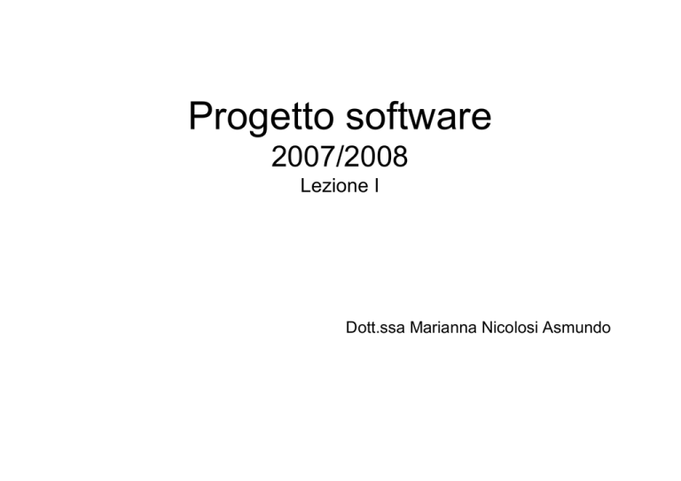 Progetto software 2007/2008 Lezione I Dott.ssa Marianna Nicolosi Asmundo Obiettivi del corso Coinvolgervi nello sviluppo di un progetto software in cui – mettere a frutto le conoscenze che avete acquisito durante i corsi già frequentati (programmazione, algoritmi, ingegneria del software, database ecc…) – applicare un processo per la gestione e lo sviluppo del progetto analogo a quelli usati nel mondo reale Come? Lavorerete in team di 4/6 persone • un leader • uno o più analisti • due o più programmatori Sarete voi a scegliere il ruolo più adatto alle vostre capacità e alla vostra indole. Mi comunicherete la formazione del vostro gruppo ed eventuali modifiche. I Leader • Problem solving: – – – – determinare i fattori tecnici e organizzativi più importanti strutturare sistematicamente una soluzione motivare gli sviluppatori flessibili • Identità manageriale: – assumersi la responsabilità del progetto – coordinazione del resto del team • Incentivazione: – ricompensare lo spirito di iniziativa – saper rischiare • Influenza e spirito di gruppo: – Mantenere il controllo nelle situazioni critiche – relazionarsi bene coi colleghi Il team • Staff tecnico auto-organizzato • Parola d’ordine: cooperazione “Se vuoi migliorare in modo incrementale, sii competitivo; se vuoi migliorare in modo esponenziale sii cooperativo.” Autore ignoto Criteri di valutazione • Qualità del software sviluppato • Coesione del gruppo Non sono previsti progetti individuali Modalità di esame • L’esame consiste nello sviluppo e consegna del progetto • Il vostro lavoro verrà monitorato e valutato per fasi • Al momento della consegna del progetto finale verrà fatta una valutazione complessiva del progetto e verrà verificata la competenza di ciascun membro del team rispetto all’intero progetto e rispetto al ruolo specifico ricoperto Contenuti del corso • Breve ripasso sui processi di sviluppo del software • Principi di gestione dei progetti – Metriche di processo – Stime per il progetto software e pianificazione – Gestione dei rischi • I metodi formali come strumento di specifica – Formalismi algebrici: ASMs – Formalismi visuali: Reti di Petri – OCL Cos’è un progetto? Un progetto è un’impresa temporanea • effettuata da persone • vincolata da risorse limitate • pianificata, eseguita e controllata intrapresa per creare un prodotto o servizio unico Dimensioni di un progetto: • Coinvolge una persona sola o molte migliaia • Richiede meno di 100 più di 10 milioni di ore per essere completato Esempi • Lo sviluppo di un nuovo prodotto o servizio • La progettazione di un nuovo veicolo di trasporto • … Temporaneo & Unico • Temporaneo: Ogni progetto ha un inizio e una fine ben precisa (obiettivo raggiunto o irraggiungibile) – non significa che dura poco infatti molti progetti durano diversi anni • Unico: Ogni progetto riguarda qualcosa che non è mai stata fatta prima ed è pertanto unica – un progetto differisce da un altro per il tipo di oggetto sviluppato, per gli strumenti usati, per le persone coinvolte o soltanto per le date Progetti software Sviluppo di: • Un compilatore, un editor, una componente di sistema o un sistema operativo • Un applicativo web • L’implementazione di un algoritmo di ordinamento • Il controllo dei comandi di una lavatrice • … Progetti software/ingegneria software In generale non possiamo produrre software nella maniera più immediata 1. 2. 3. I progetti sono in genere di dimensioni consistenti Possono richiedere l’applicazione di più strumenti (linguaggi di programmazione, algoritmi) Possono coinvolgere più persone (sviluppatori, committenti e utenti) Ognuno di questi punti basta a giustificare l’utilizzo di un processo per lo sviluppo del software Sviluppo del software Avviene tramite comunicazione: “Poiché il software, come ogni capitale, incorpora della conoscenza e poiché la conoscenza è inizialmente in larga misura dispersa, tacita, latente e incompleta, lo sviluppo del software è un processo di apprendimento sociale. Questo processo è un dialogo in cui la conoscenza viene raccolta e incorporata nel software. Il processo crea interazione fra gli utenti e i progettisti, fra gli utenti e gli strumenti in evoluzione e fra i progettisti e gli strumenti in evoluzione (la tecnologia). Si tratta di un processo iterativo in cui lo strumento evolutivo stesso fungerà da mezzo di comunicazione e in cui ogni nuova fase del dialogo trae conoscenze sempre più utili dalle persone interessate.” H. Baetjer Processo di sviluppo del software? Quando si realizza un prodotto o un sistema è importante svolgere un percorso che aiuti ad ottenere risultati di alta qualità nel tempo prefissato Processo di sviluppo software Chi se ne occupa? • Gli ingegneri del software adattano il processo alle loro esigenze e poi lo seguono • I committenti giocano un ruolo importante nel processo di definizione, costruzione e collaudo Perché è importante? Introduce stabilità, controllo e organizzazione Quali passi sono necessari? Il processo che si adotta dipende dal software che si sta realizzando Processo di sviluppo software Cosa viene prodotto? I programmi, i documenti e i dati sviluppati come conseguenza delle attività di ingegneria del software definite dal processo Come verificare che il procedimento sia corretto? Qualità, ottimizzazione dei tempi e utilizzabilità a lungo termine del prodotto che si sta realizzando sono i migliori indicatori dell’efficacia del processo utilizzato Quindi Un processo di sviluppo software è una struttura di riferimento entro il quale si svolgono le attività necessarie alla realizzazione di software di alta qualità