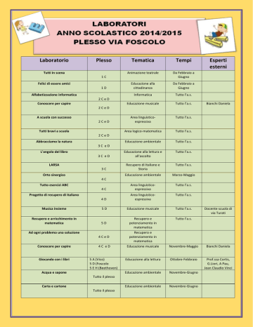 Laboratorio Plesso Tematica Tempi Animazione teatrale Da Febbraio a Giugno Educazione alla cittadinanza Da Febbraio a Giugno Informatica Tutto l’a.s. Educazione musicale Tutto l’a.s. Area linguisticoespressiva Tutto l’a.s. Area logico-matematica Tutto l’a.s. Educazione ambientale Tutto l’a.s. Educazione alla lettura e all'ascolto Tutto l’a.s. 3C eD Recupero di Italiano e Storia Tutto l’a.s. 3C Educazione ambientale Marzo-Maggio Area linguisticoespressiva Tutto l’a.s. 4C Area linguisticoespressiva Tutto l’a.s. 4D Musica insieme 5D Educazione musicale Tutto l’a.s. Recupero e arricchimento in matematica Recupero e potenziamento in matematica Tutto l’a.s. 5D 4CeD Recupero e potenziamento in matematica Conoscere per capire 4C eD Educazione musicale Novembre-Maggio Bianchi Daniela Giocando con i libri 5 A (Vico) 5 D (Foscolo 5 E H (Beethoven) Educazione alla lettura Ottobre-Febbraio Prof.ssa Cortis, G.Liori, A Pau, Jean Claudio Vinci Educazione ambientale Novembre-Giugno Educazione ambientale Novembre-Giugno Tutti in scena 1C Felici di essere amici 1D Alfabetizzazione informatica Esperti esterni 2CeD Conoscere per capire Bianchi Daniela 2CeD A scuola con successo 2CeD Tutti bravi a scuola 2CeD Abbracciamo la natura 3C eD L'angolo del libro LARSA Orto sinergico 4C Tutto esercizi ABC Progetto di recupero di italiano Ad ogni problema una soluzione Acqua e sapone Tutto il plesso Carta e cartone Tutto il plesso Docente scuola di via Turati