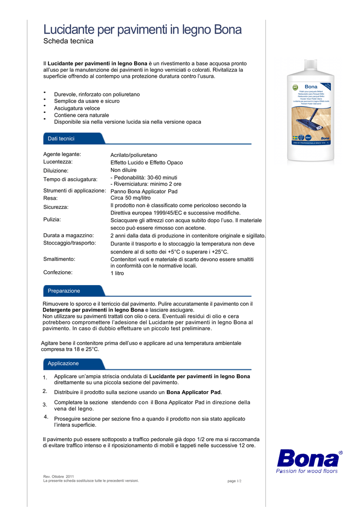 Lucidante per pavimenti in legno Bona Scheda tecnica Il Lucidante per pavimenti in legno Bona è un rivestimento a base acquosa pronto all’uso per la manutenzione dei pavimenti in legno verniciati o colorati. Rivitalizza la superficie offrendo al contempo una protezione duratura contro l’usura. • • • • • Durevole, rinforzato con poliuretano Semplice da usare e sicuro Asciugatura veloce Contiene cera naturale Disponibile sia nella versione lucida sia nella versione opaca Dati tecnici Agente legante: Lucentezza: Acrilato/poliuretano Effetto Lucido e Effetto Opaco Non diluire Diluizione: - Pedonabilità: 30-60 minuti Tempo di asciugatura: - Riverniciatura: minimo 2 ore Strumenti di applicazione: Panno Bona Applicator Pad Circa 50 mq/litro Resa: Il prodotto non è classificato come pericoloso secondo la Sicurezza: Direttiva europea 1999/45/EC e successive modifiche. Pulizia: Sciacquare gli attrezzi con acqua subito dopo l’uso. Il materiale secco può essere rimosso con acetone. Durata a magazzino: 2 anni dalla data di produzione in contenitore originale e sigillato. Stoccaggio/trasporto: Durante il trasporto e lo stoccaggio la temperatura non deve Smaltimento: Confezione: scendere al di sotto dei +5°C o superare i +25°C. Contenitori vuoti e materiale di scarto devono essere smaltiti in conformità con le normative locali. 1 litro Preparazione Rimuovere lo sporco e il terriccio dal pavimento. Pulire accuratamente il pavimento con il Detergente per pavimenti in legno Bona e lasciare asciugare. Non utilizzare su pavimenti trattati con olio o cera. Eventuali residui di olio e cera potrebbero compromettere l’adesione del Lucidante per pavimenti in legno Bona al pavimento. In caso di dubbio effettuare un piccolo test preliminare. Agitare bene il contenitore prima dell’uso e applicare ad una temperatura ambientale compresa tra 18 e 25°C. Applicazione 1. Applicare un’ampia striscia ondulata di Lucidante per pavimenti in legno Bona direttamente su una piccola sezione del pavimento. 2. Distribuire il prodotto sulla sezione usando un Bona Applicator Pad. 3. Completare la sezione stendendo con il Bona Applicator Pad in direzione della vena del legno. 4. Proseguire sezione per sezione fino a quando il prodotto non sia stato applicato l’intera superficie. Il pavimento può essere sottoposto a traffico pedonale già dopo 1/2 ore ma si raccomanda di evitare traffico intenso e il riposizionamento di mobili e tappeti nelle successive 12 ore. Rev. Ottobre 2011 La presente scheda sostituisce tutte le precedenti versioni. page 1/2 Lucidante per pavimenti in legno Bona Scheda tecnica Manutenzione Pulire regolarmente il pavimento con il Detergente per pavimenti in legno Bona e il panno Bona Cleaning Pad. Quando il pavimento inizia a mostrare segni di usura e ha bisogno di una rinfrescata, pulire e applicare un nuovo strato di Lucidante per pavimenti in legno. Per rimuovere il lucidante utilizzare Bona Polish Remover. Per informazioni sulla manutenzione e sui prodotti per la manutenzione consultare il sito www.bona.com/manutenzione Passion for wood floors Rev. Ottobre 2011 La presente scheda sostituisce tutte le precedenti versioni. page 2f2